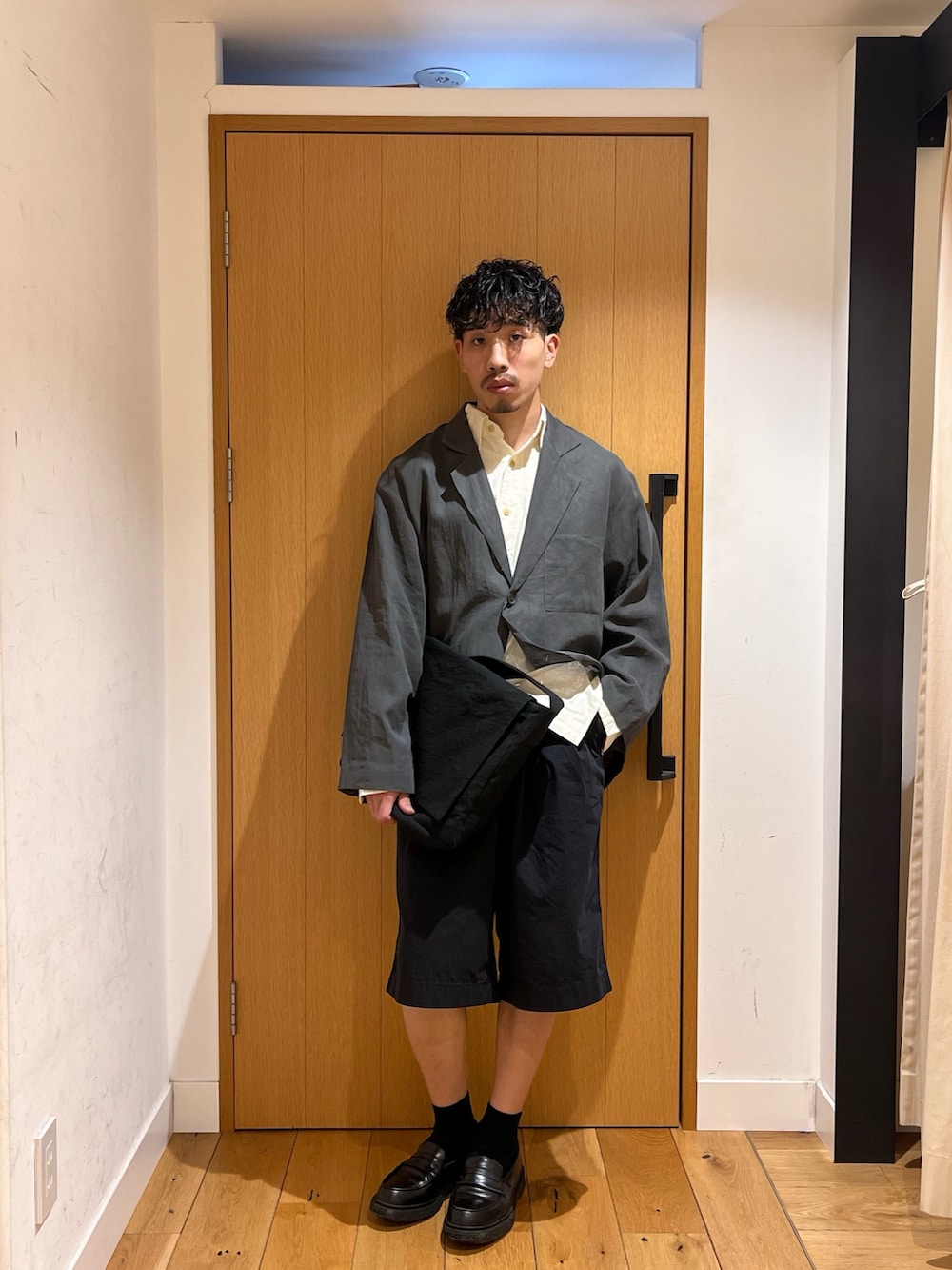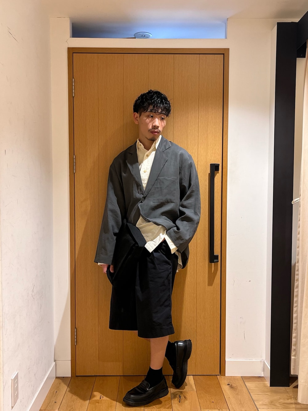 綺麗目なシャツとジャケットに対して膝丈のショートパンツは相性抜群です。