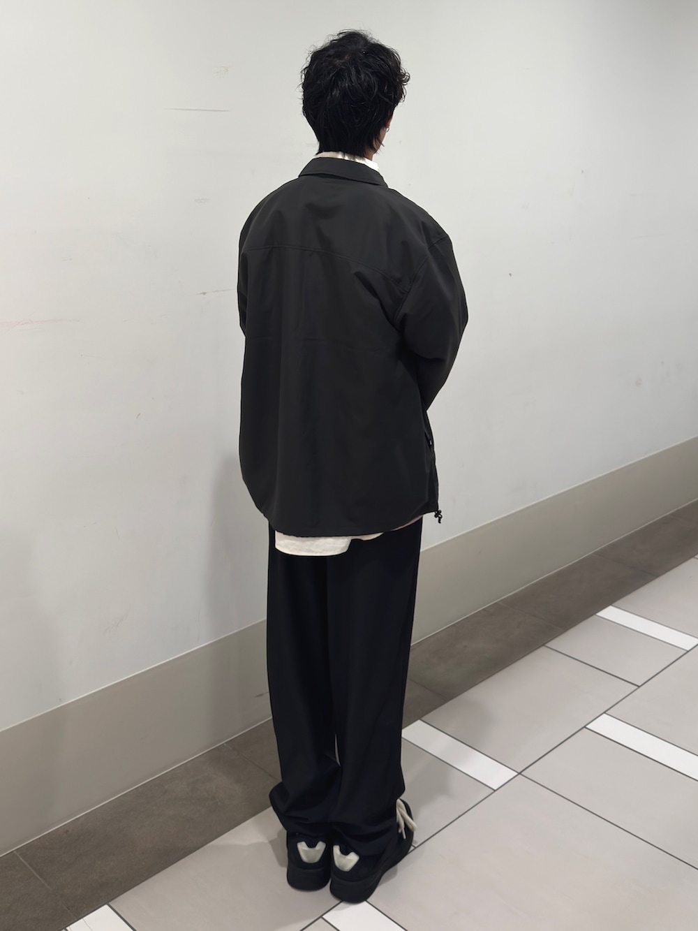 インナーには明るめのシャツをレイヤードし、全体のトーンにコントラストを加えることで奥行きのあるスタイリングに。