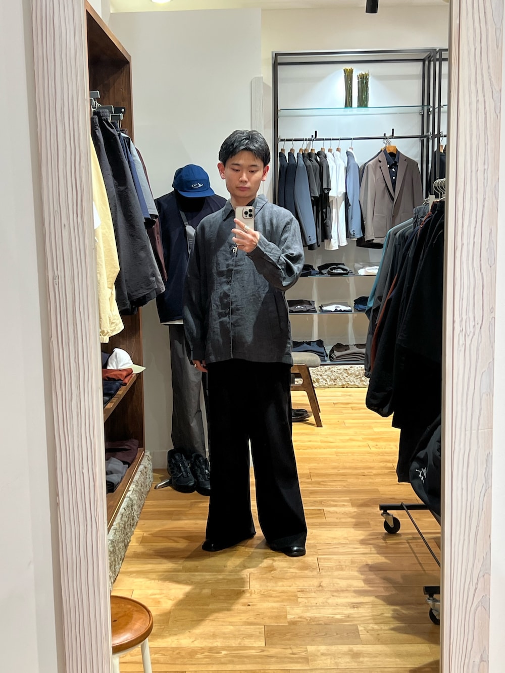 リネン素材のシャツに太めのスラックスを着用しています。