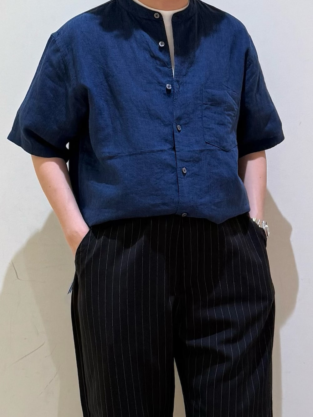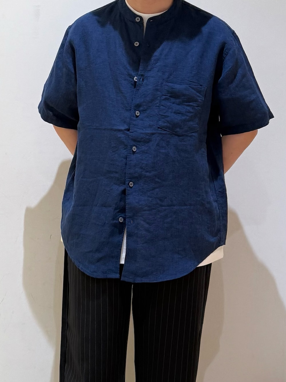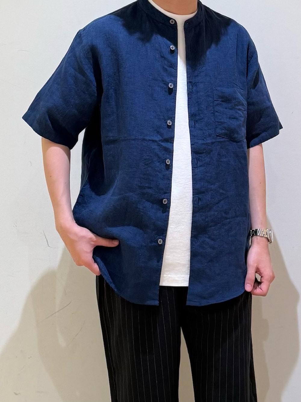 定番のバンドカラーリネンシャツ。