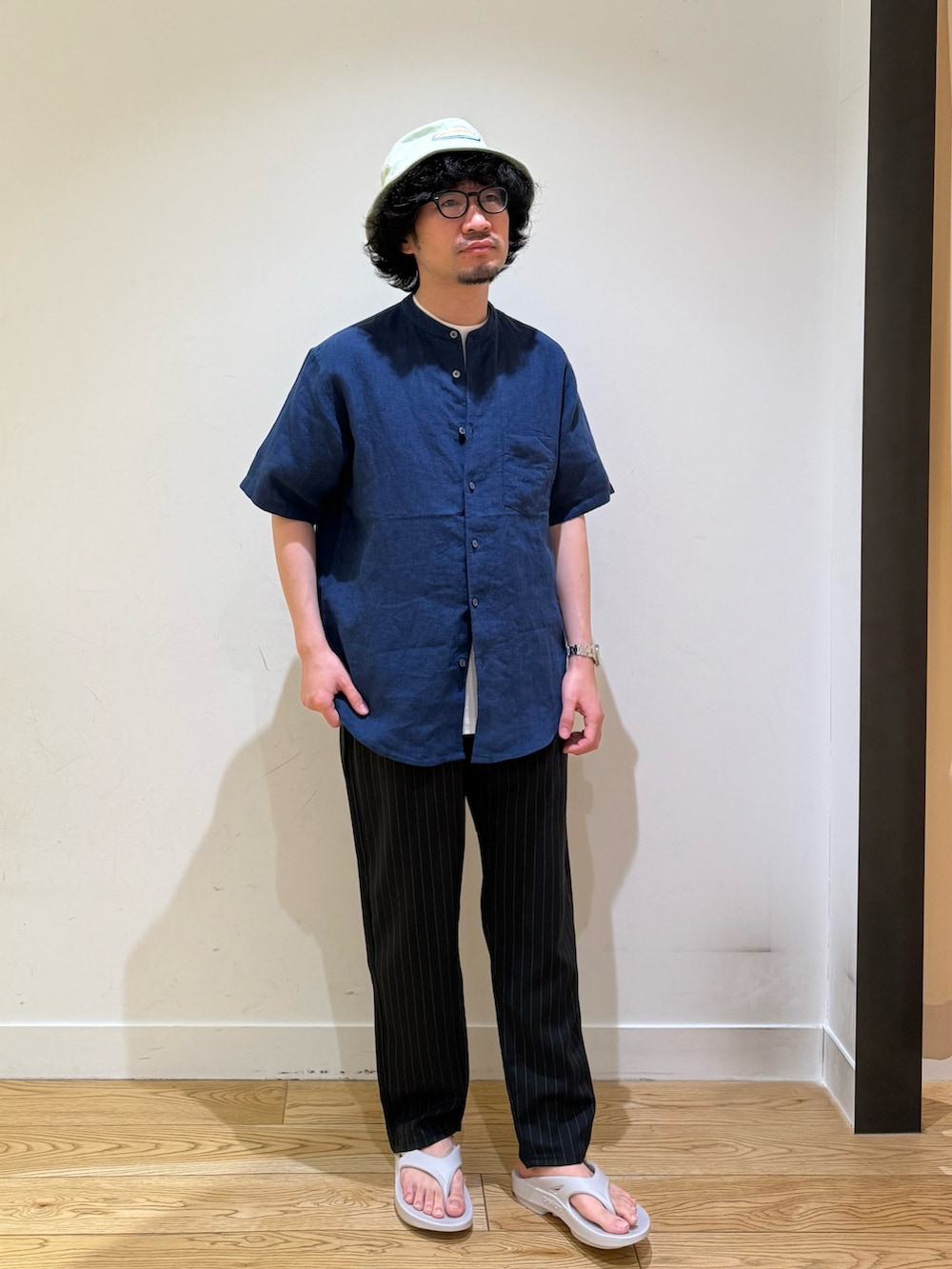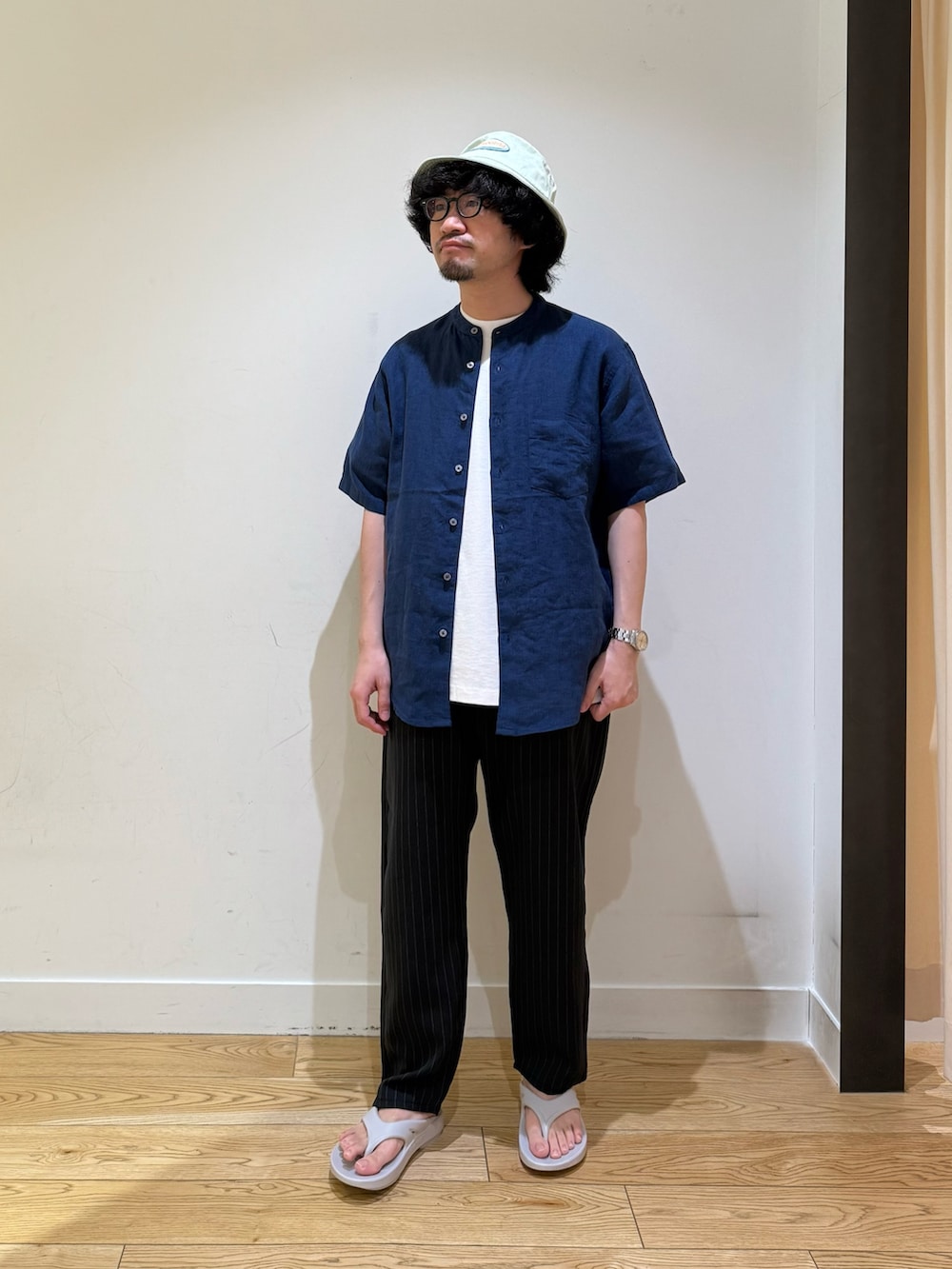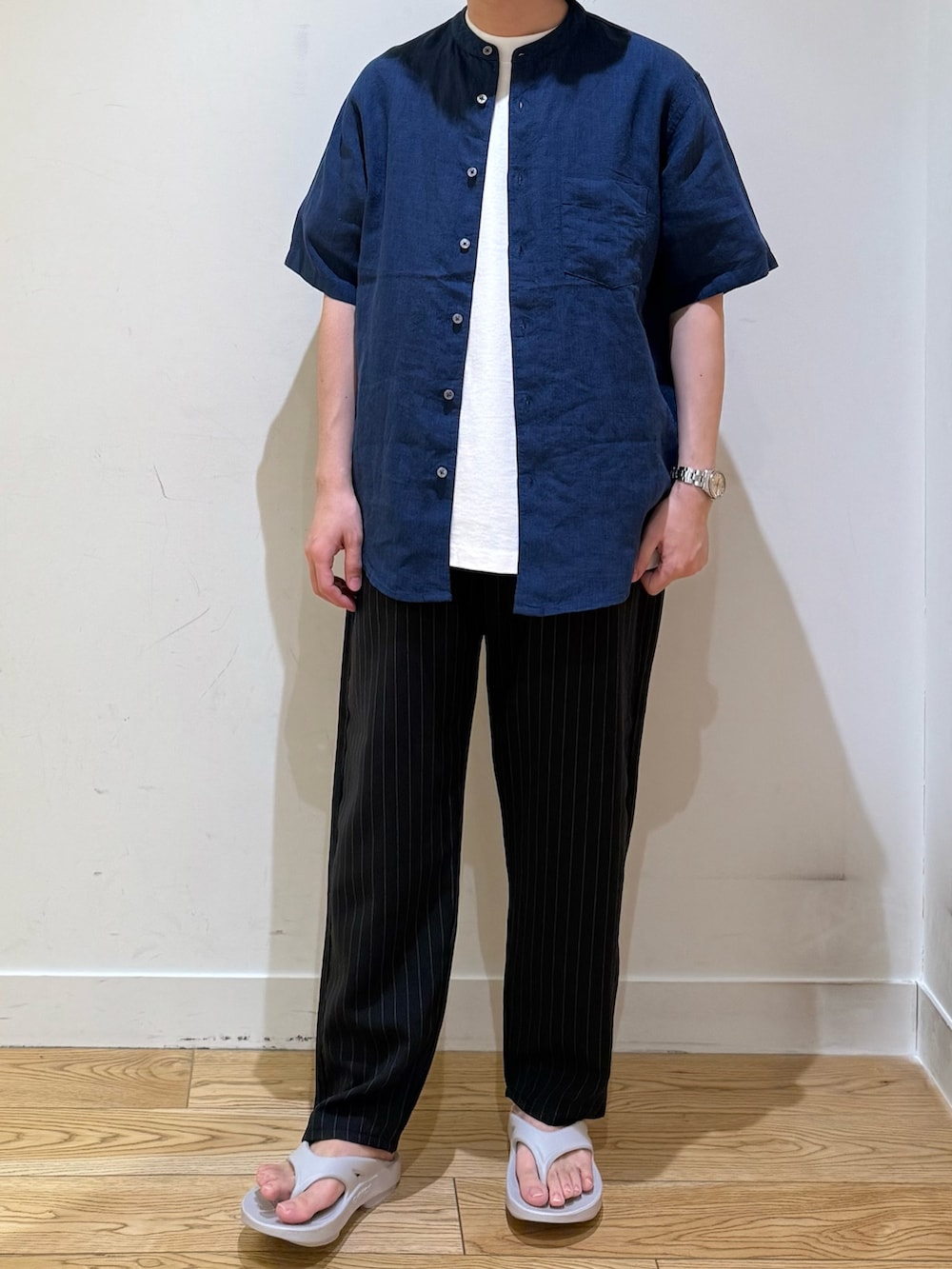 定番のバンドカラーリネンシャツ。