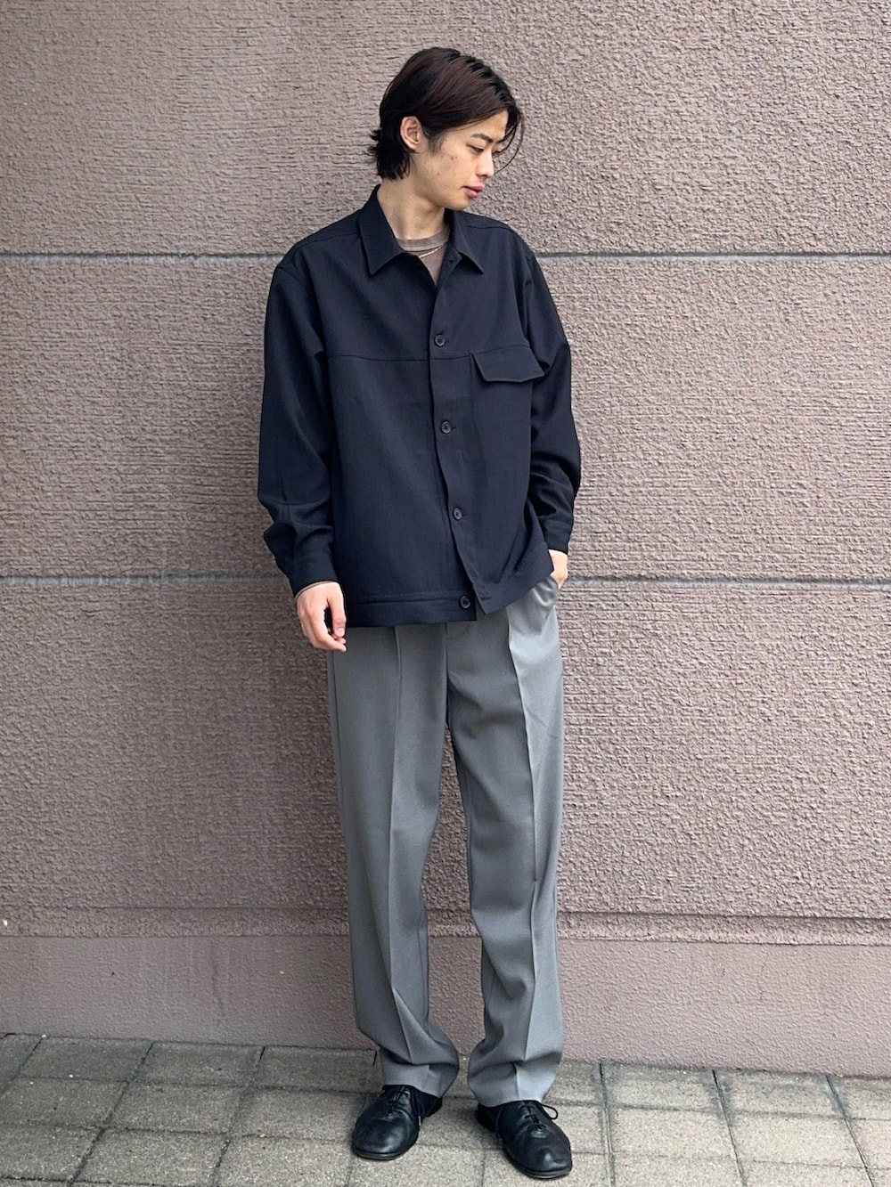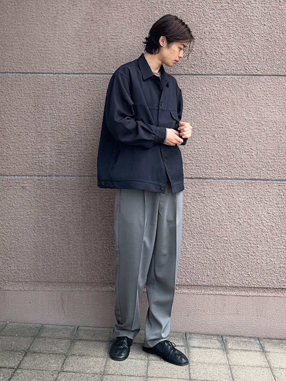 今回のコーディネートはネイビーのトラッカージャケットにグレーのスラックスを合わせました!トラッカージャケットはシャツに近いような生地感でまだまだ快適に過ごしていただけます!シンプルで羽織るだけなのでおすすめです!スラックスは綺麗なシルエットで合わせやすいです!