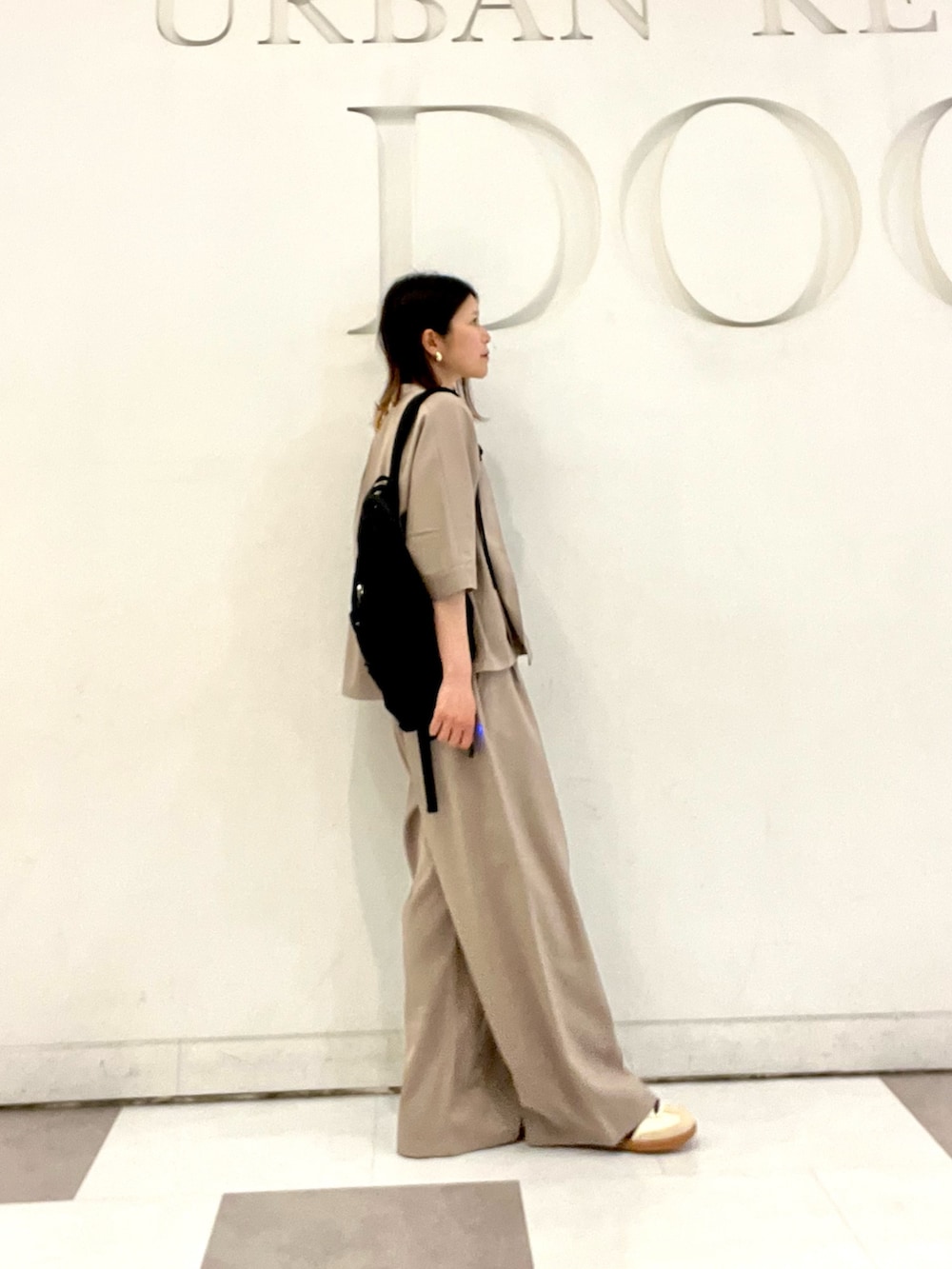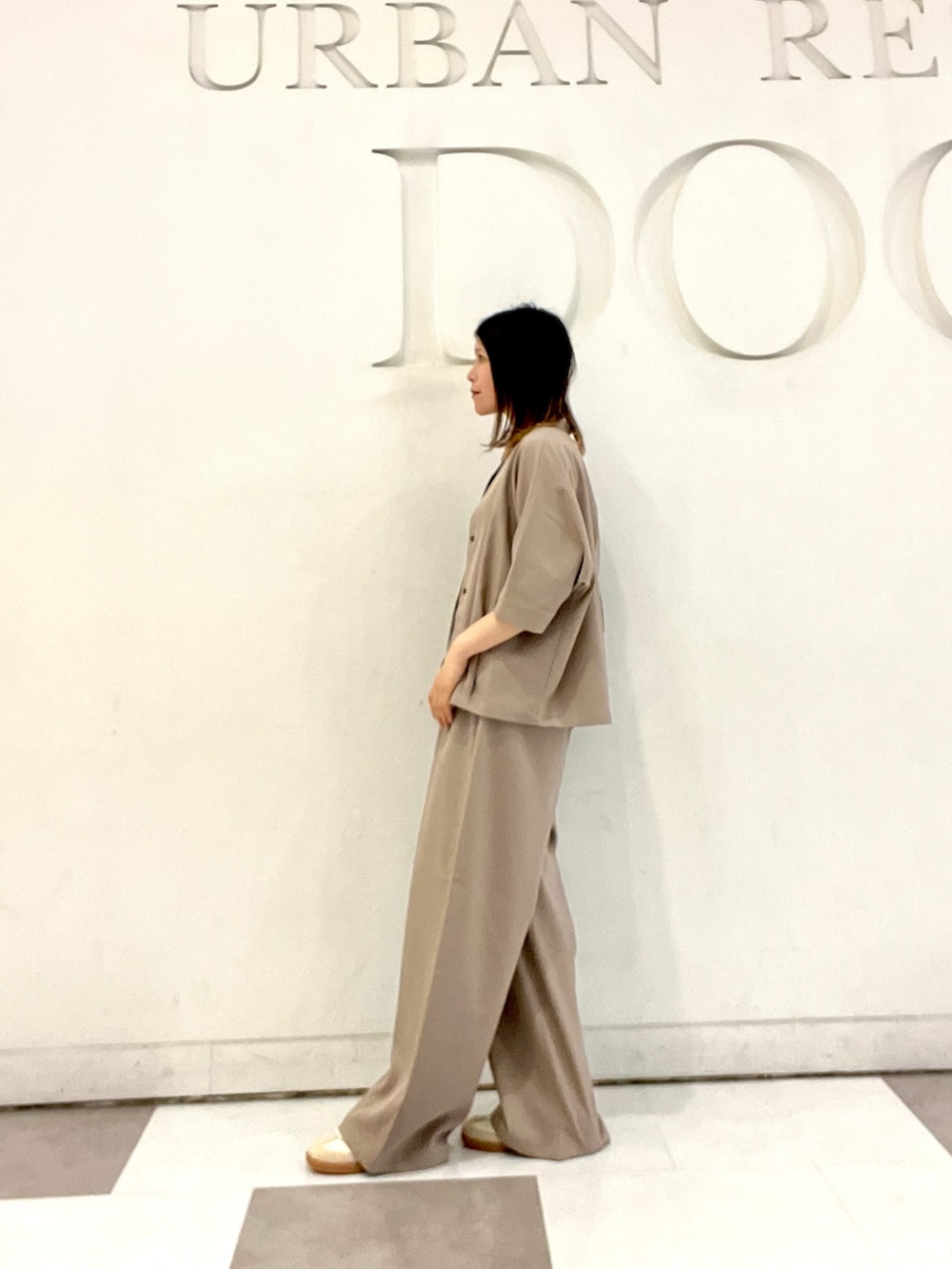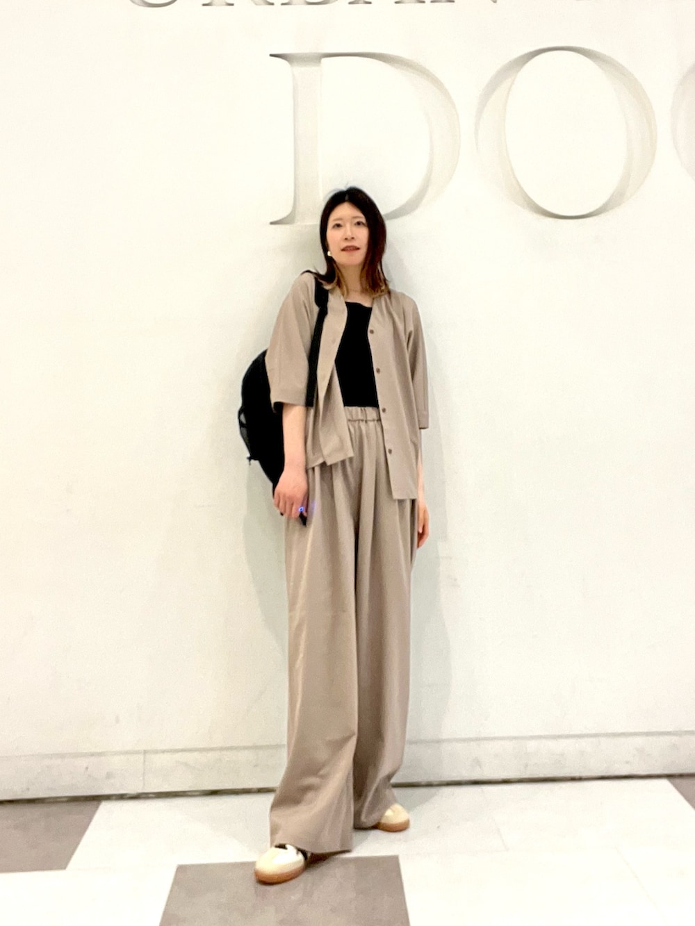 トップスはさらっとした肌触りが心地良いドルマンスリーブのシャツ。ボタンを閉めてブラウスとして着るのもオススメです◎カジュアルからきれいめまで対応の万能ブラウスです🫶🏻