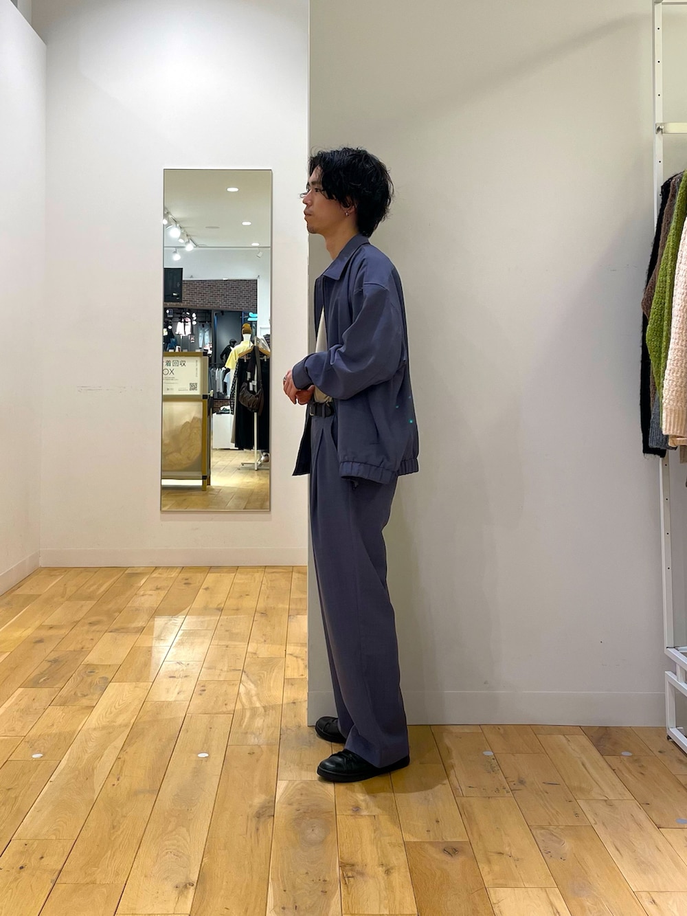 リネンライクな素材で、今の微妙に暑くてジメッとした時期にぴったりな素材感です。足元にはレザーシューズで作業着感が出ないように。