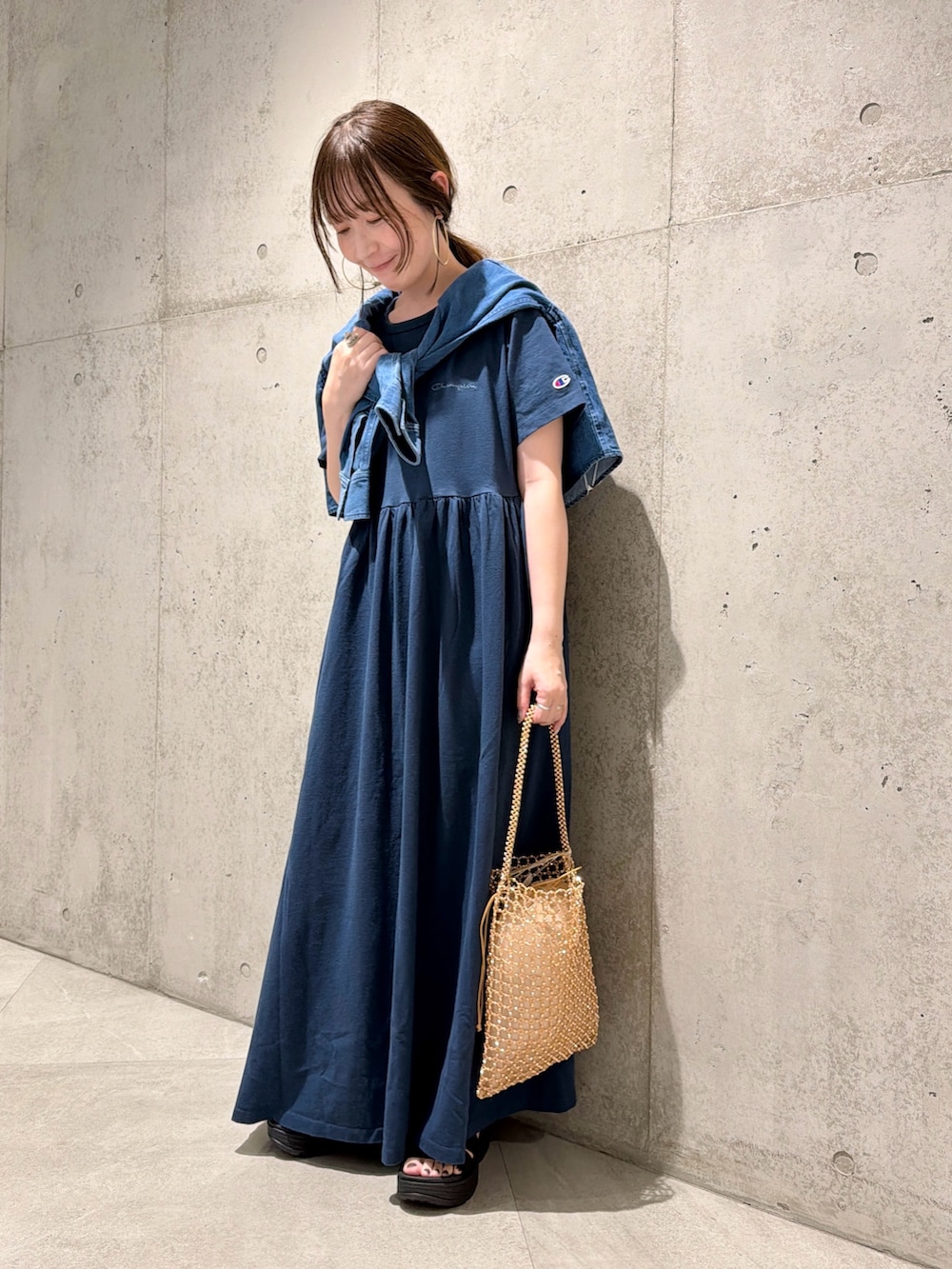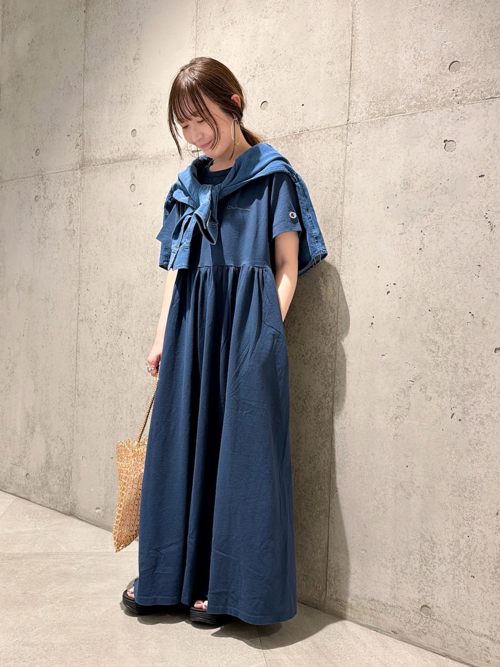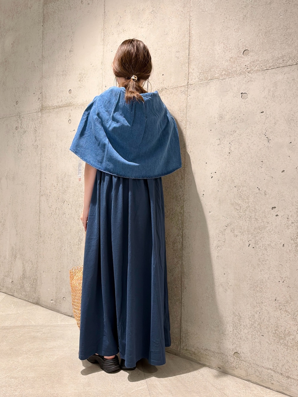 今回は、デニムのシャツを肩掛けしてアクセントにしてみました。
