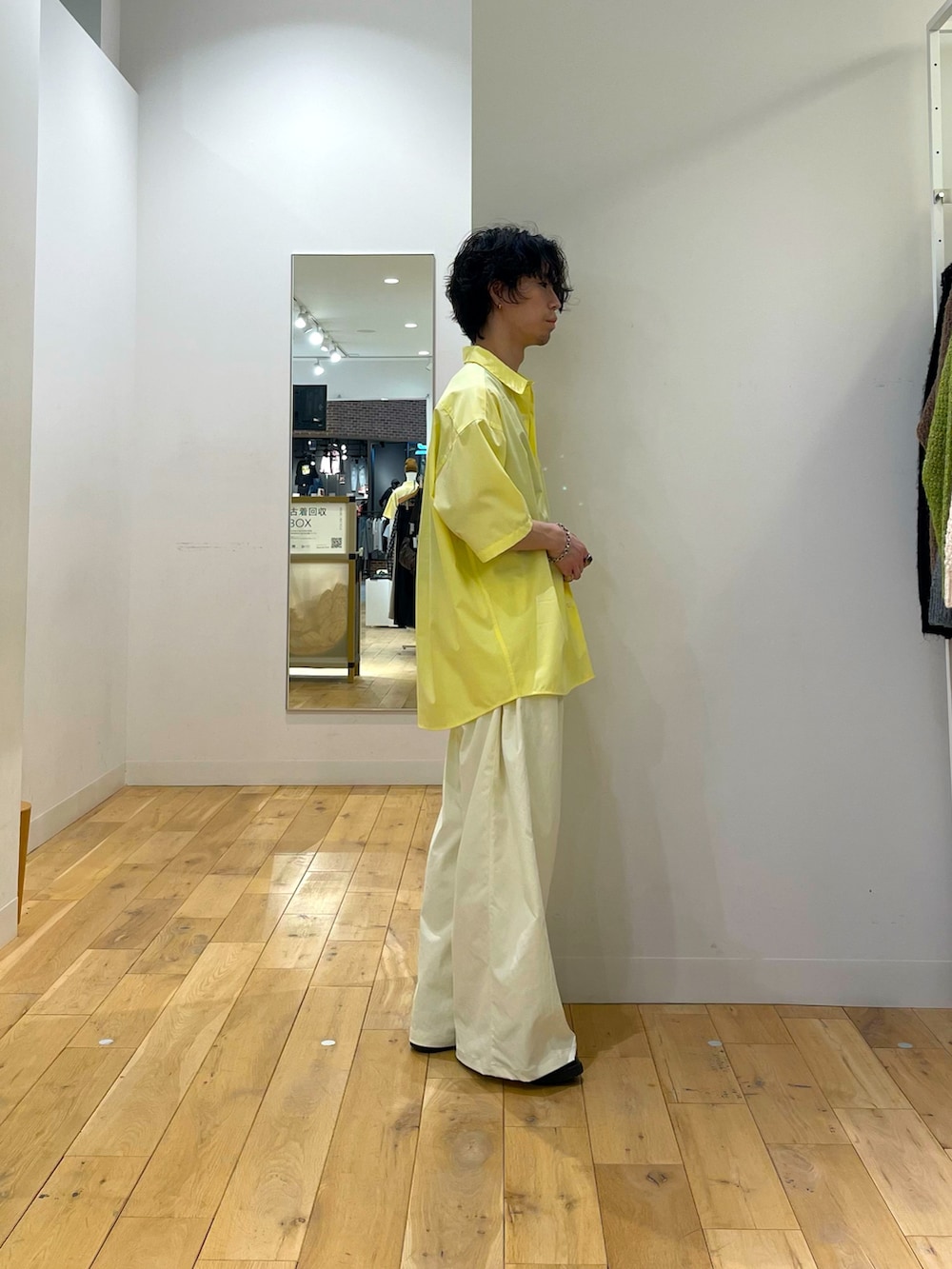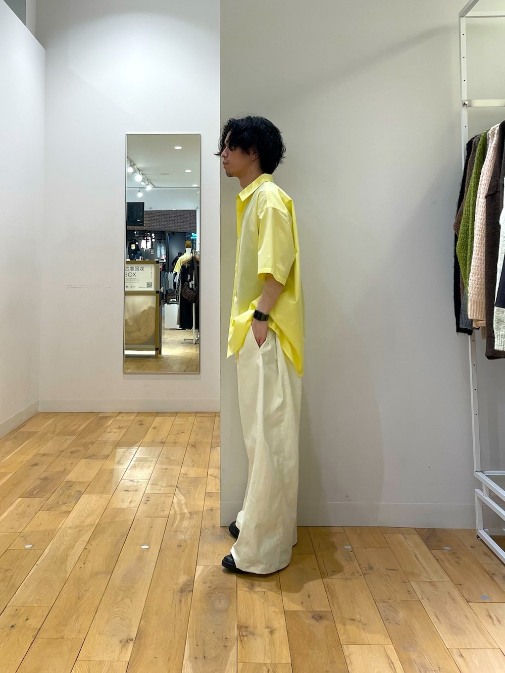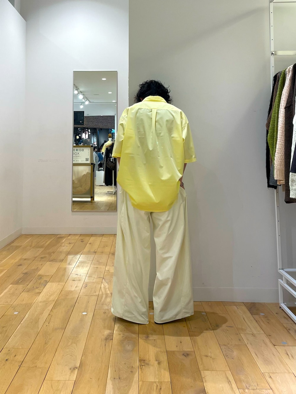 春らしいビタミンカラーのシャツにホワイトパンツ。靴はレザーシューズでコーデ全体を引き締めました。