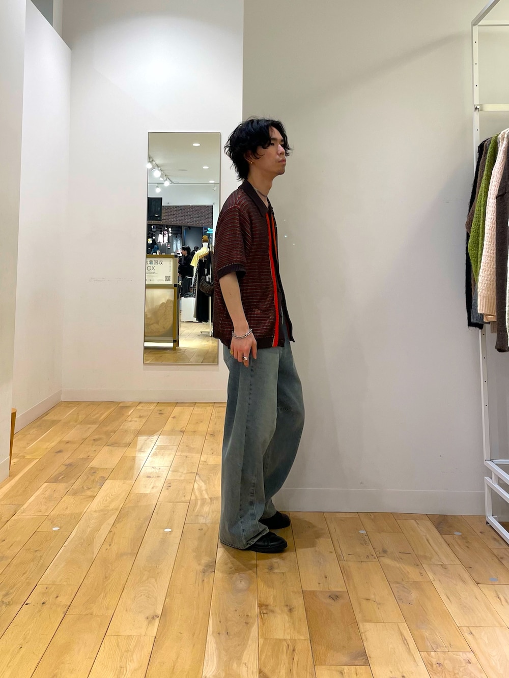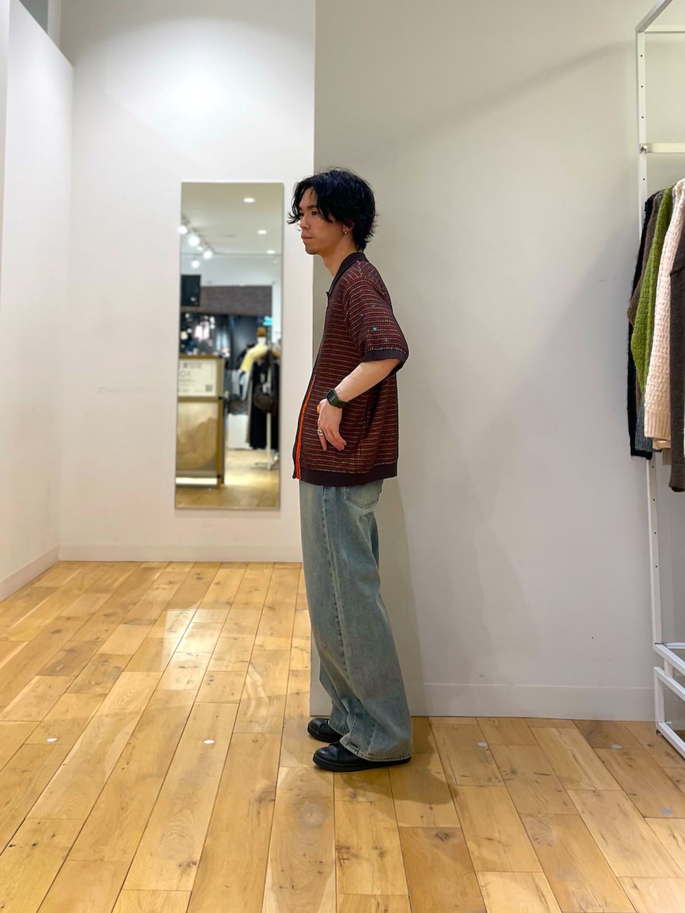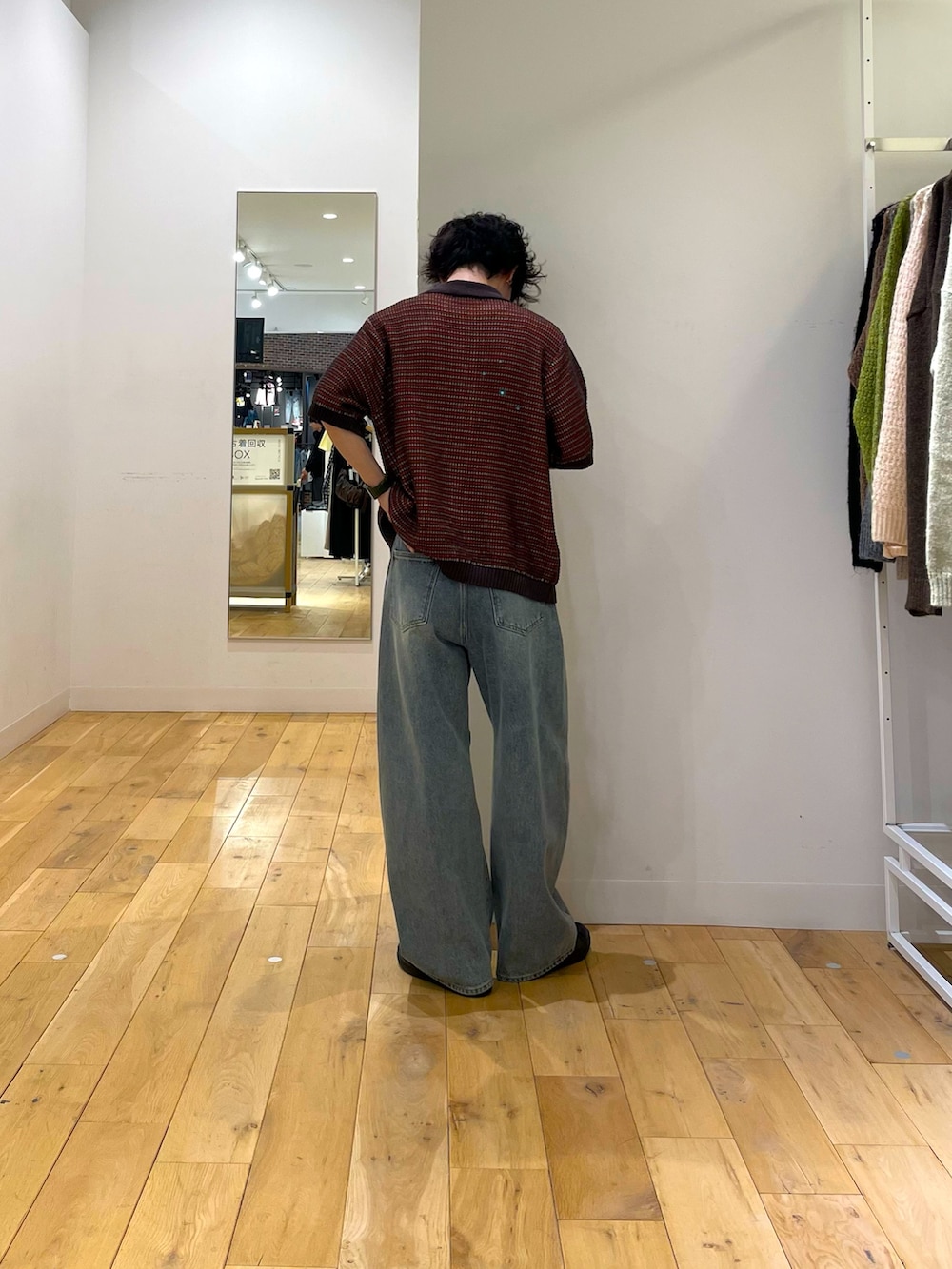 オレンジが目を引くニットカーデ。カーブデニムで今っぽいAラインシルエットに。