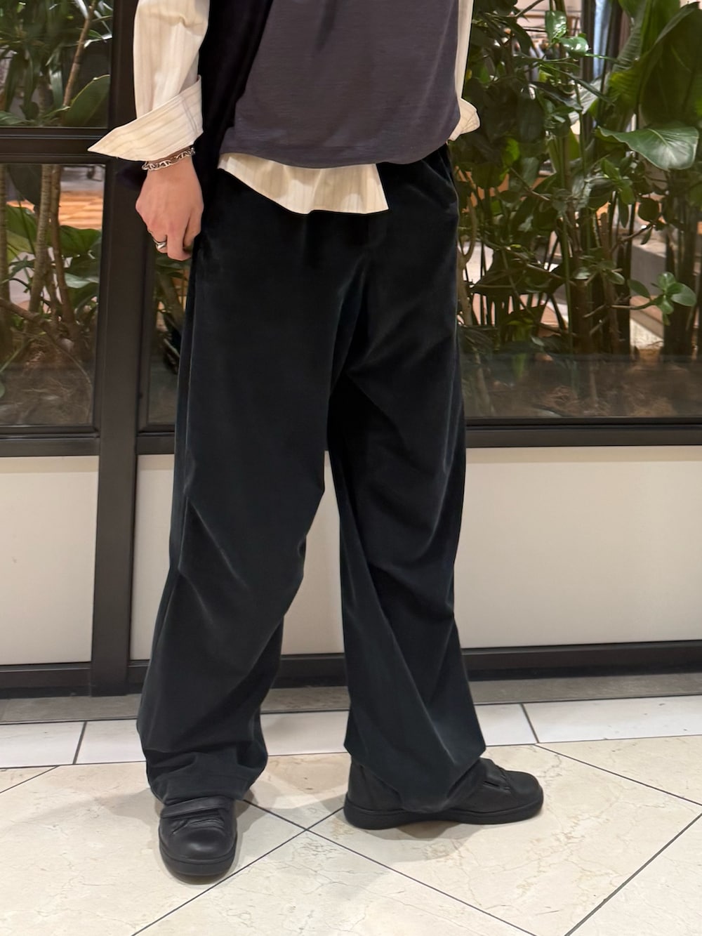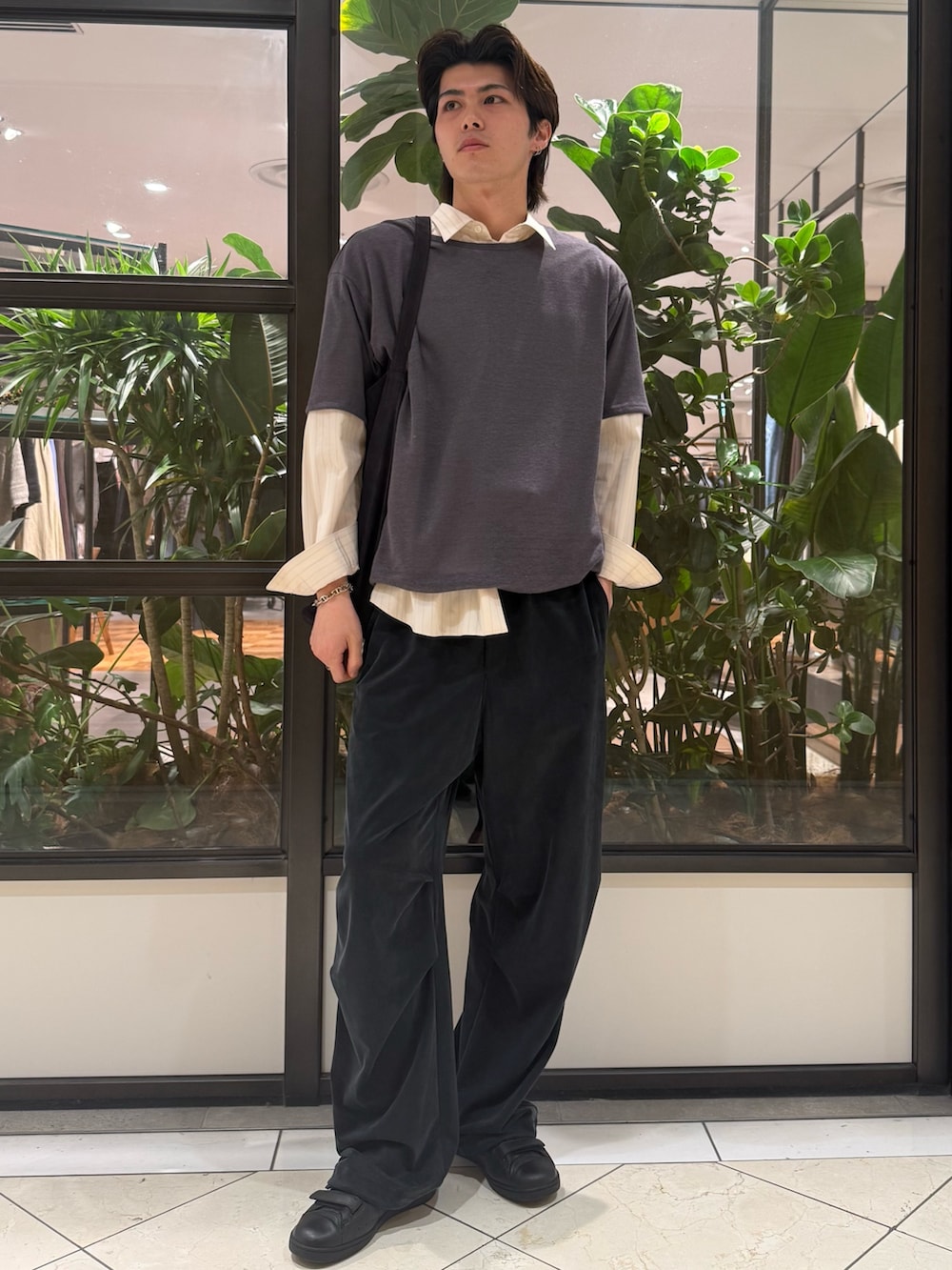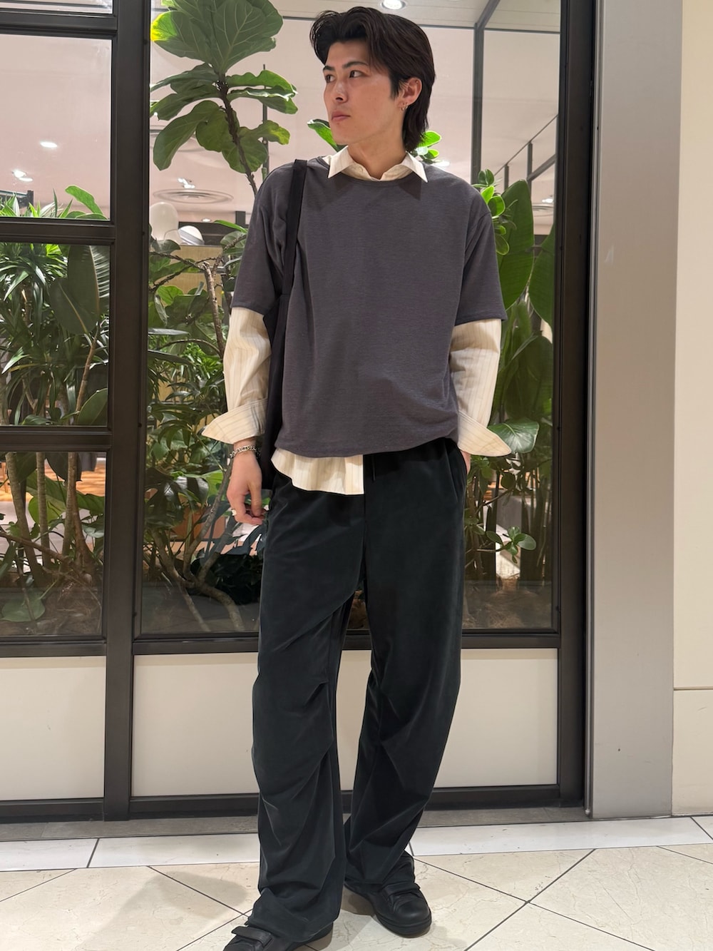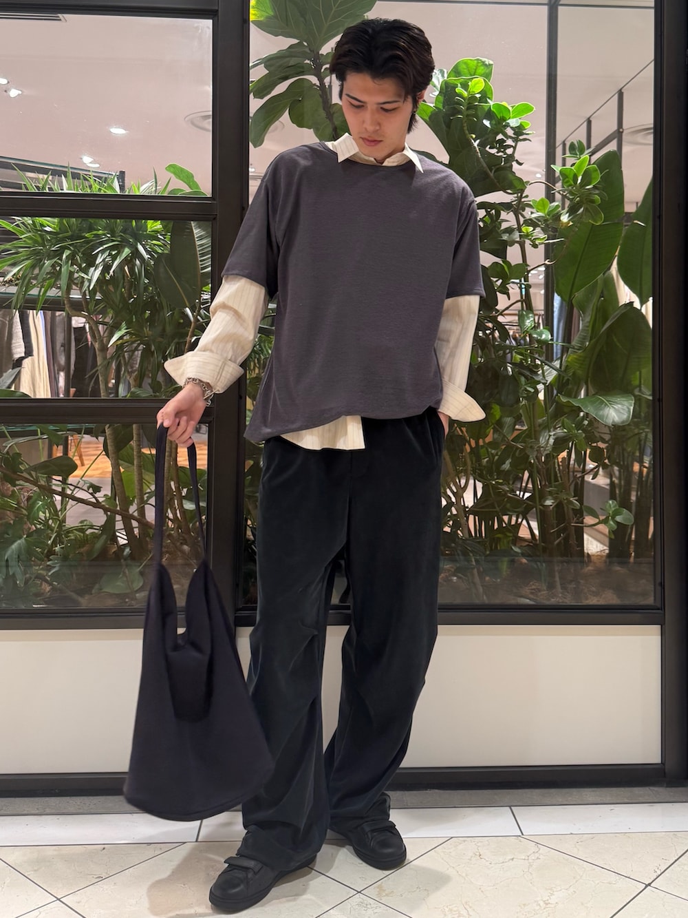奥深く上品なパンツにツルッとした綺麗めなシャツを合わせる事でよりシックなスタイルかつサイズ感でラフさもプラスさせました。
