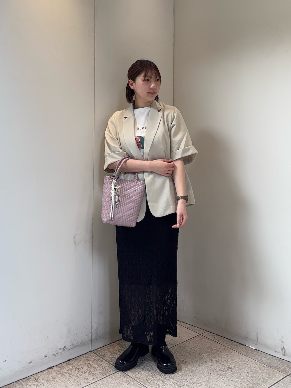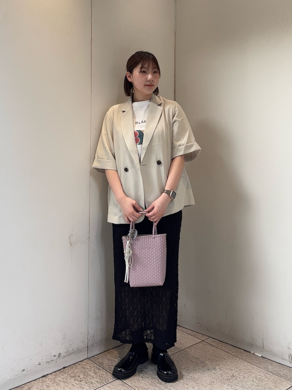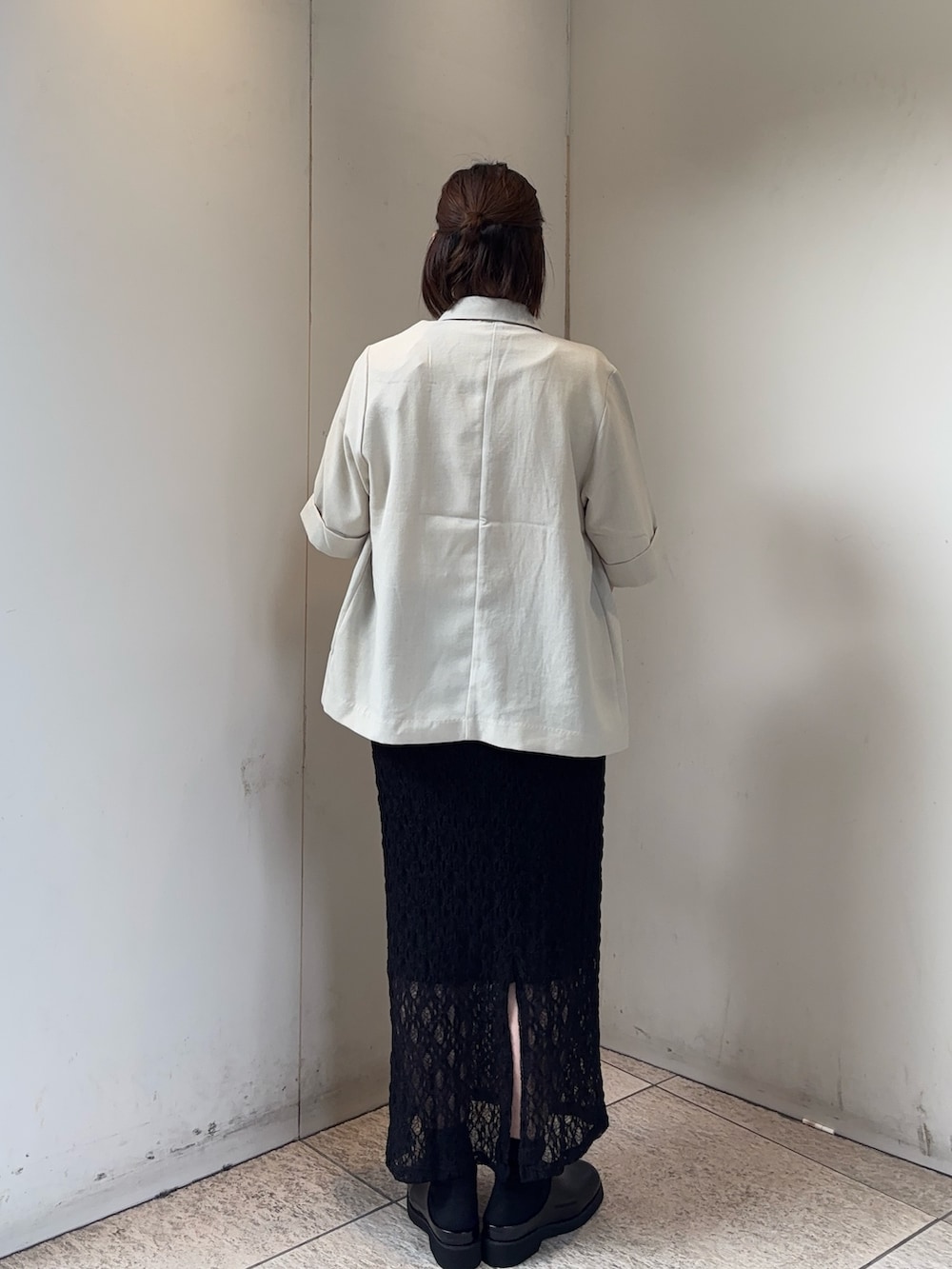 レースのスカートはタイトめなのでおしり周りが少し気になるのでリネンのジャケットを羽織ってを体型カバー◎