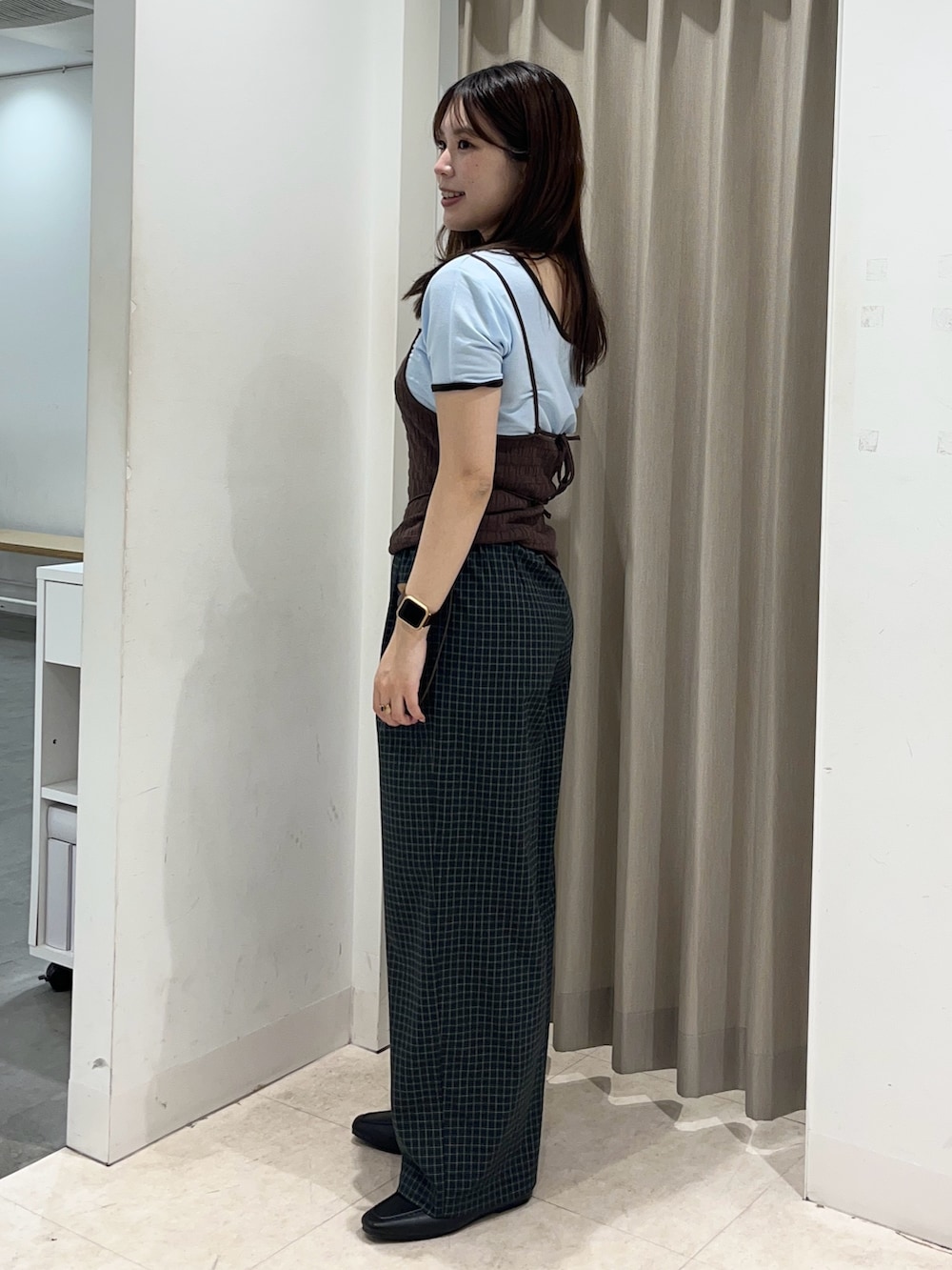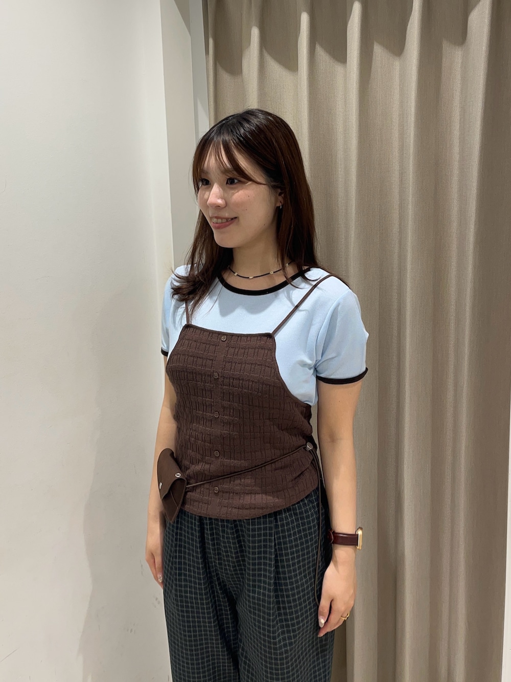 トップスに合わせてブラウンのキャミを重ねてよりこなれた感じに✨