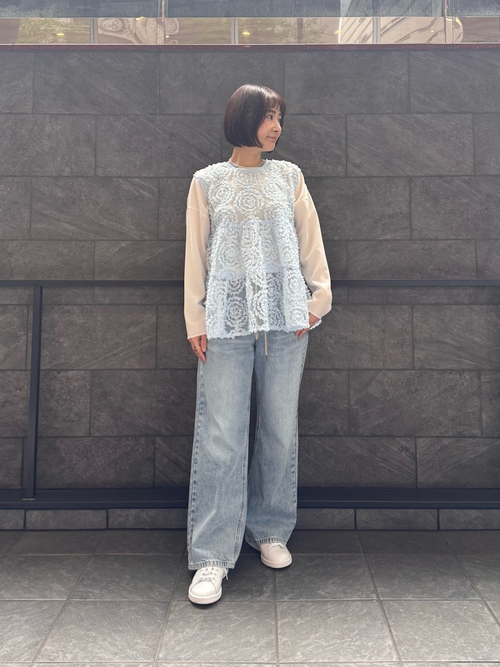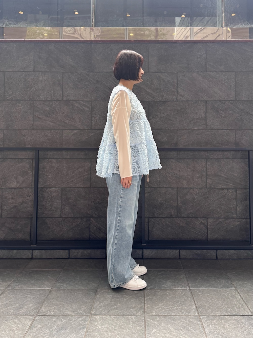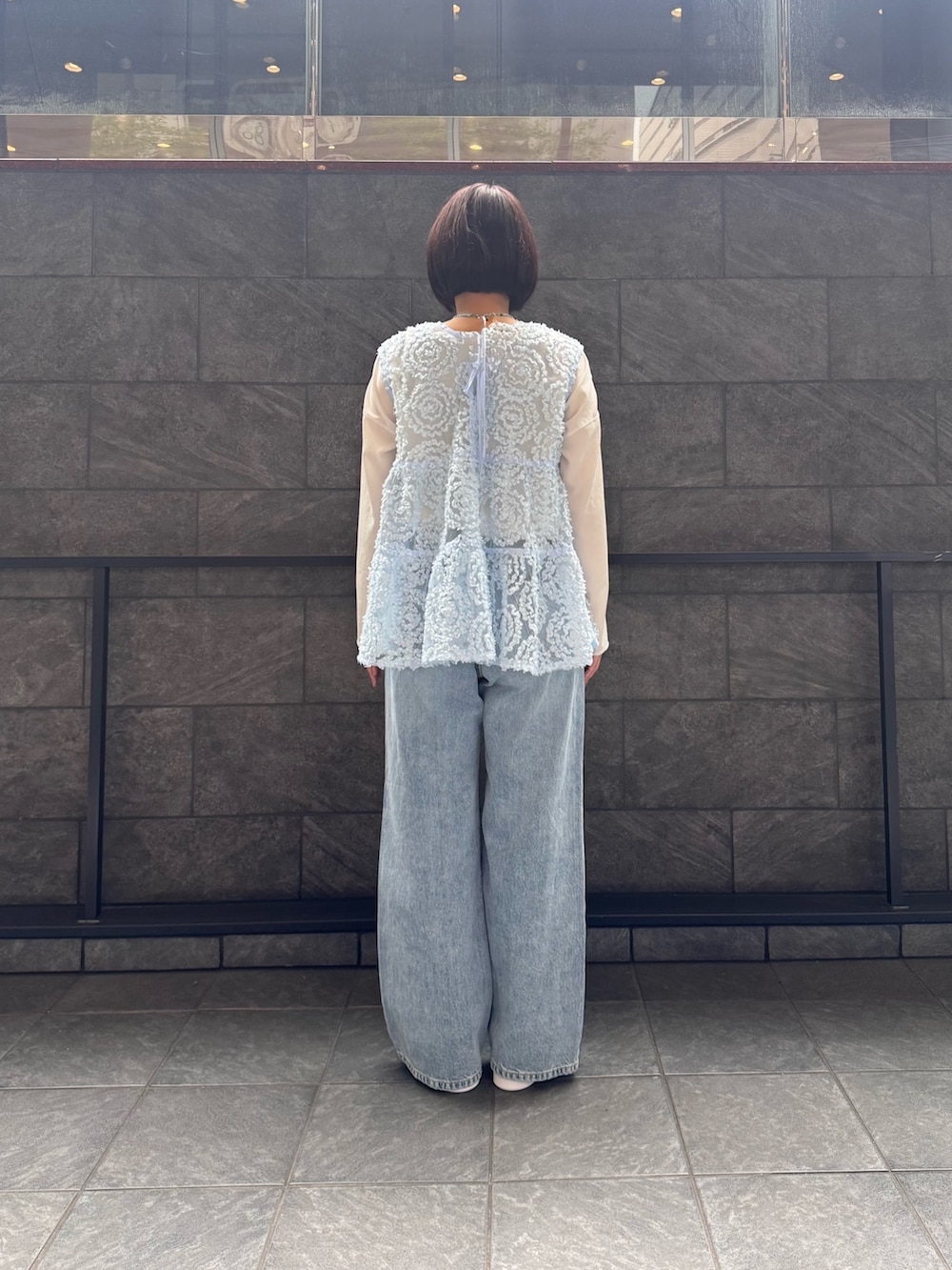 シアー感のあるジレにデニムパンツを合わせた