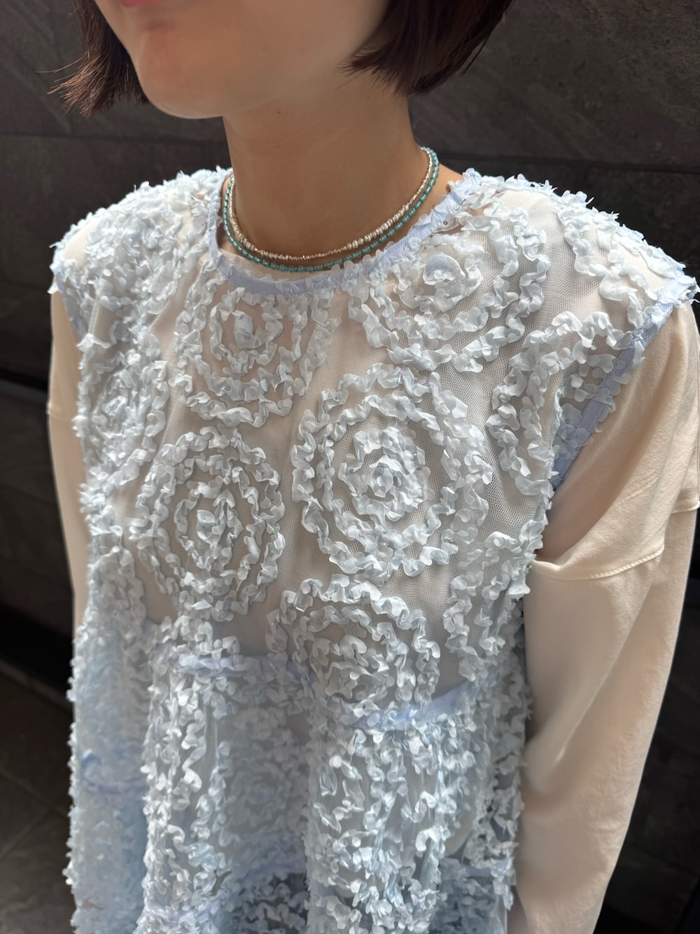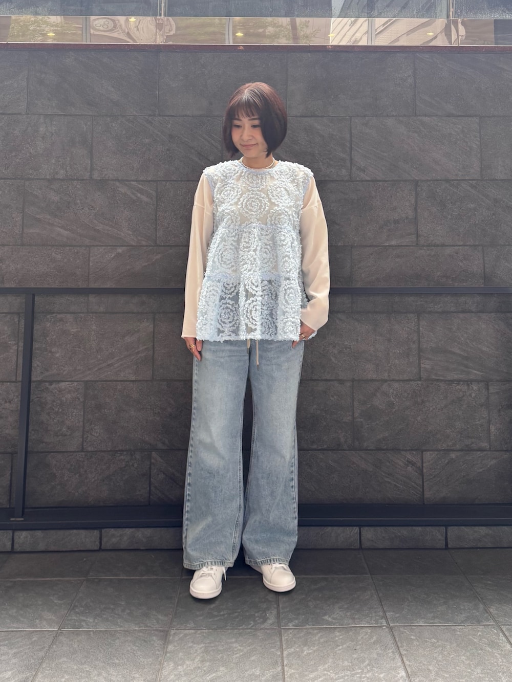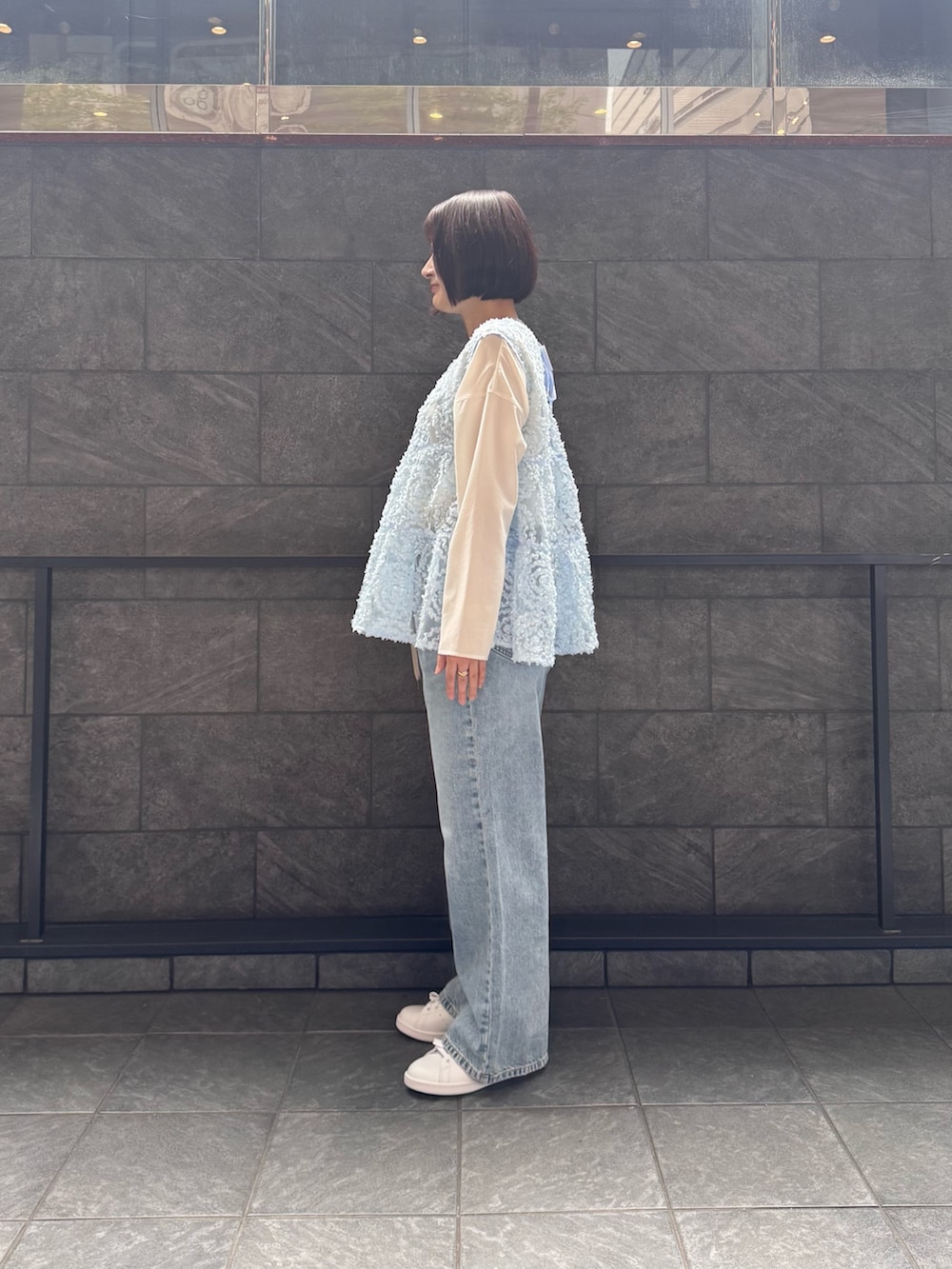 シアー感のあるジレにデニムパンツを合わせた