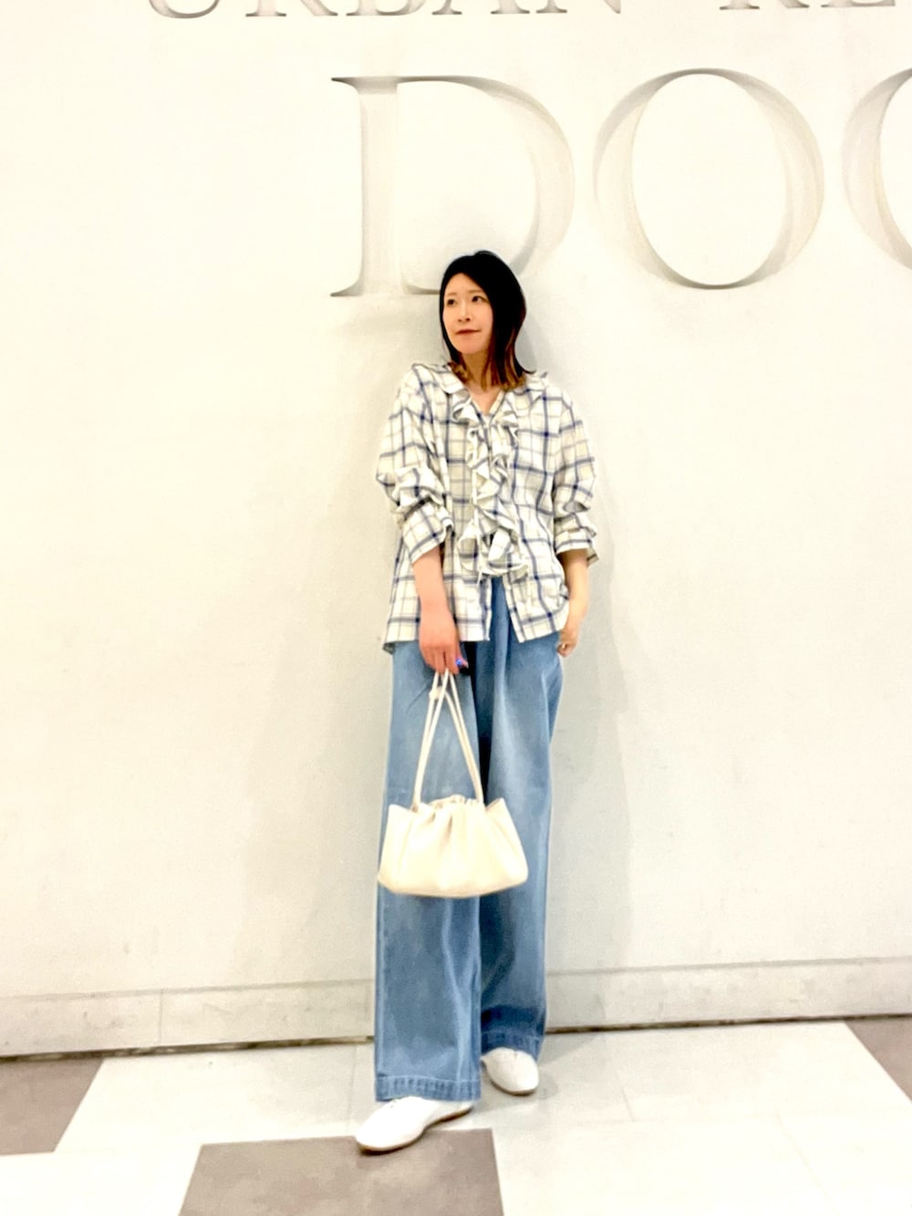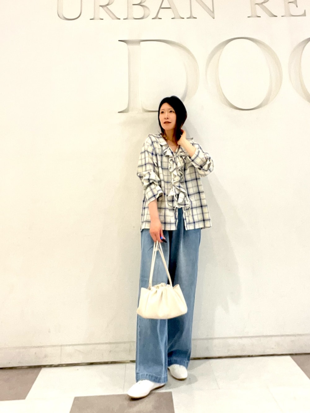 トップスのチェックブラウスは大きなフリルが可愛く一枚で主役になるアイテム◎Vネックになっているのですっきり着れます!ジャケットやカーディガンのインナーとしてもオススメです!