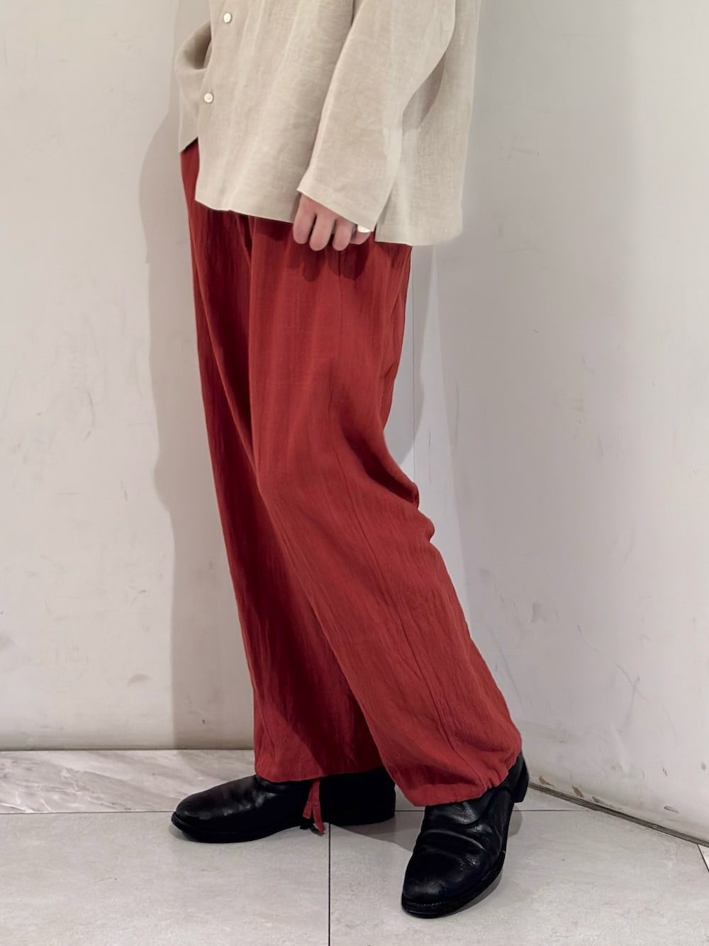 生地はカディコットンで薄めのジャガードチェック生地。ウエストはイージー仕様なので、軽やかにさらっと履きやすい。そんな一本です。