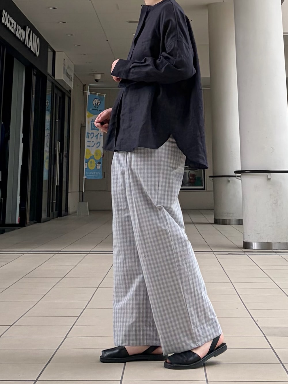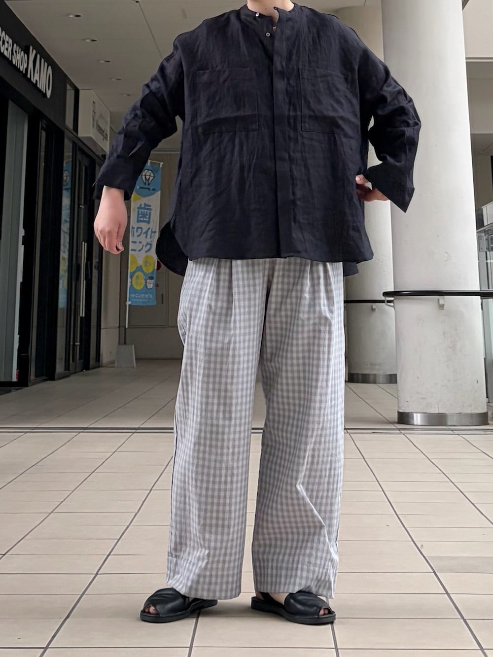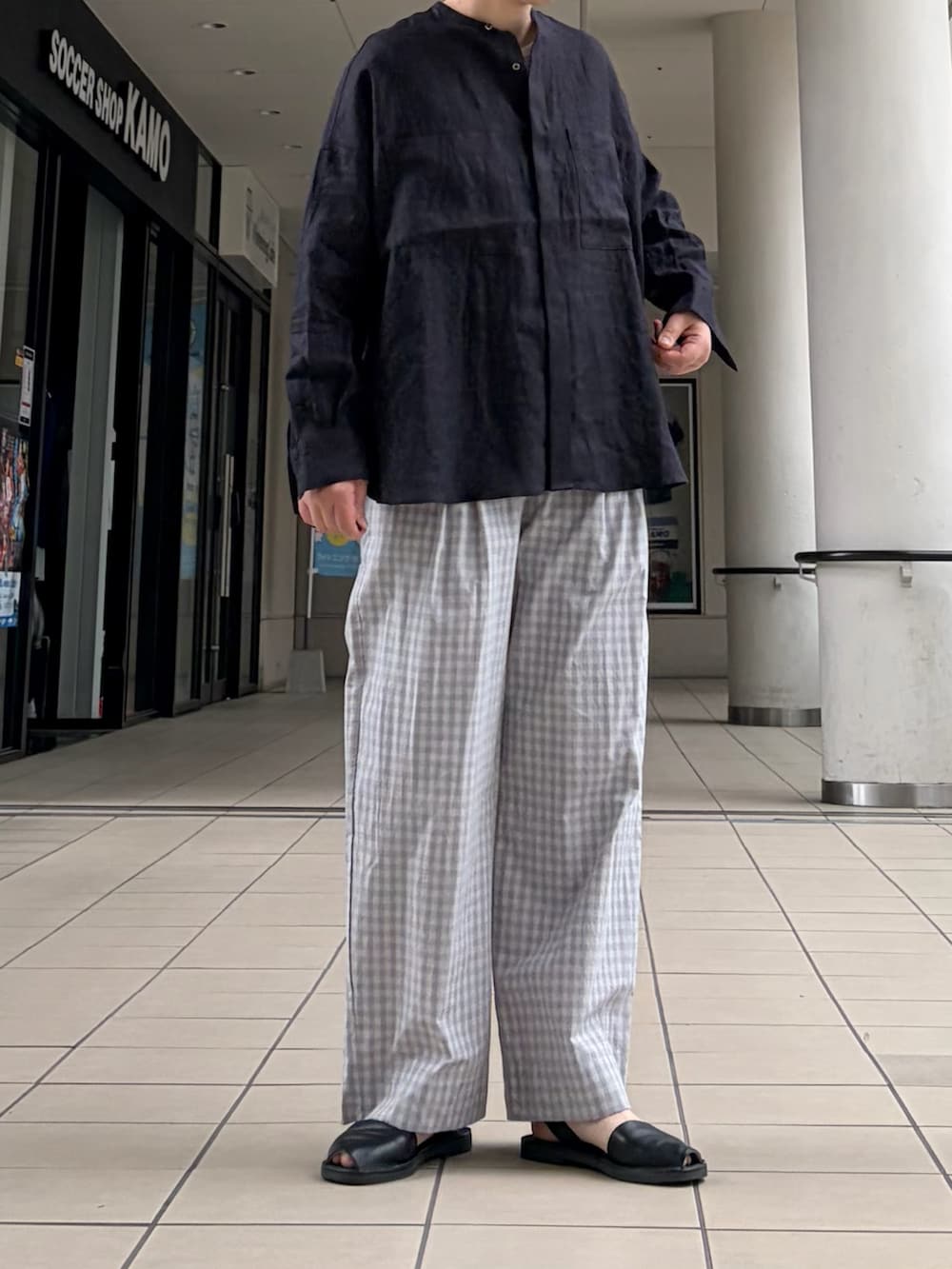 トップスはシンプルなリネンシャツを。ゆったりしたサイズ感で夏場も涼しい着心地です。