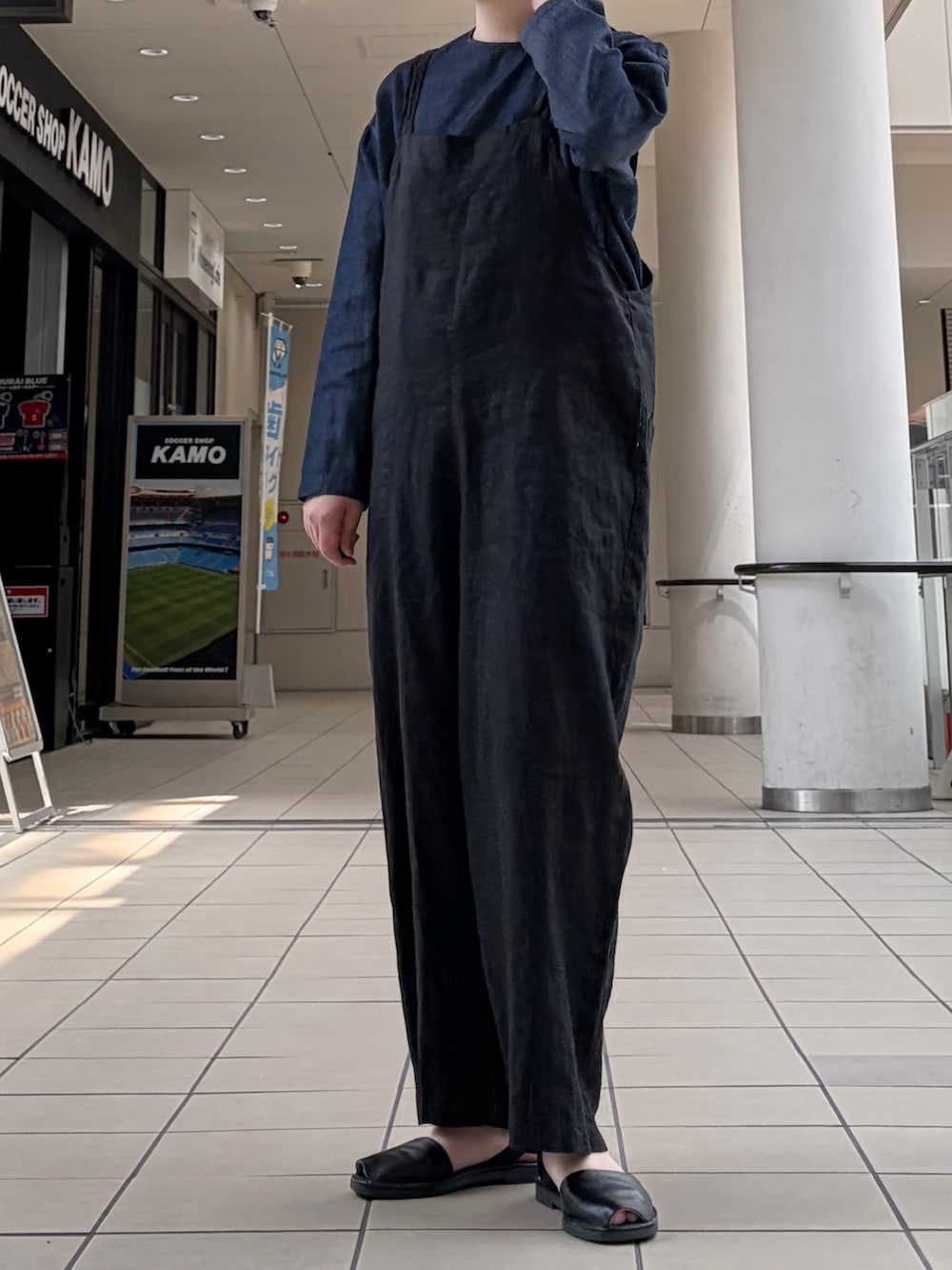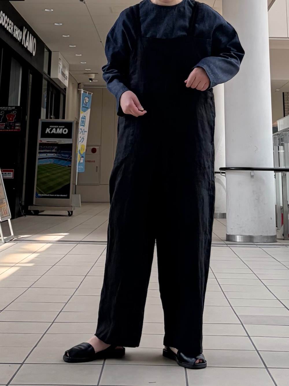 デニムのトップスを合わせたサロペットスタイルです。