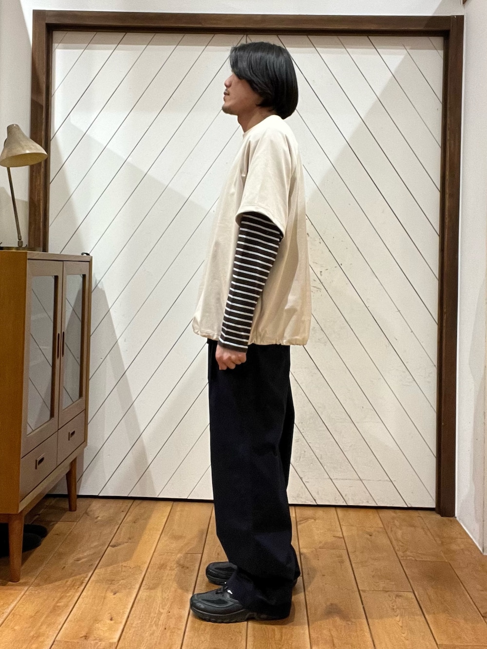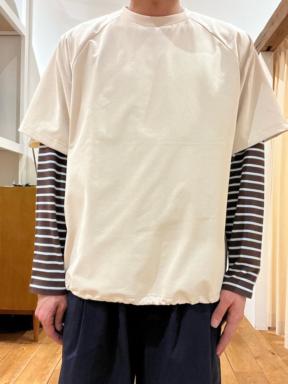 ボーダーのレイヤードとドローコードでつくるゆったりシルエットがポイントです!