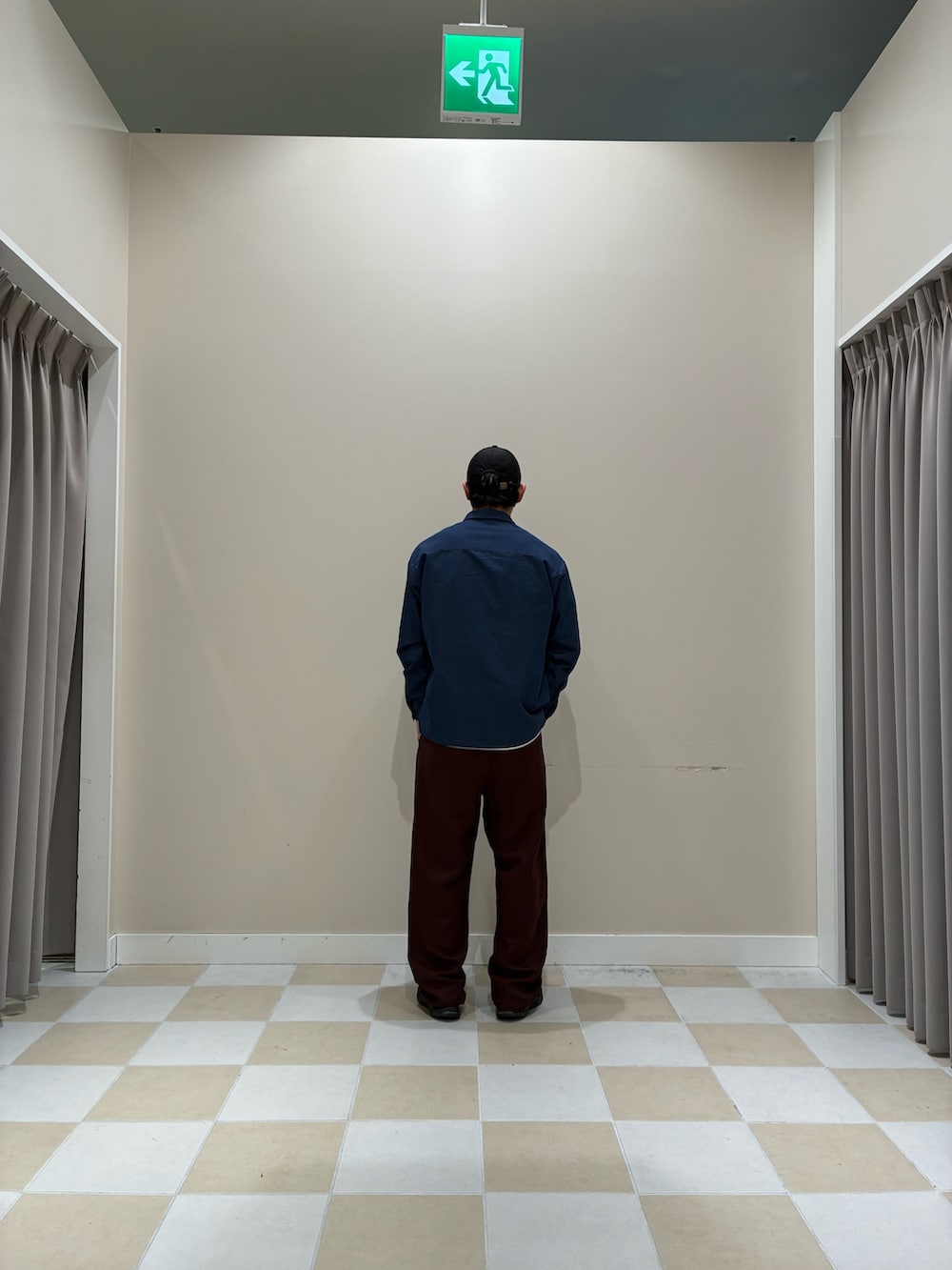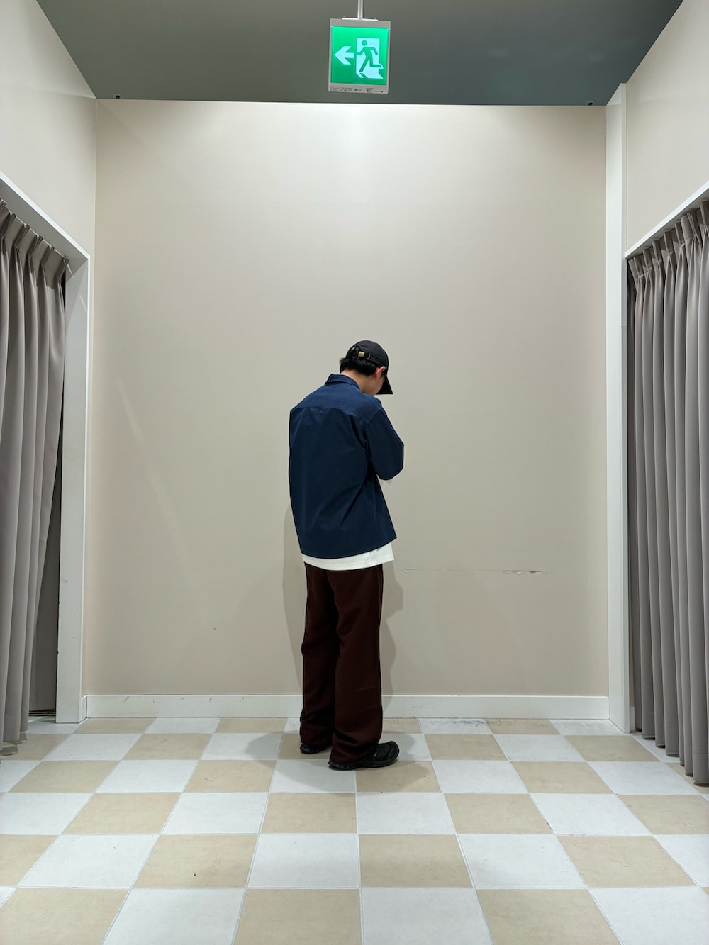 落ち着いたネイビーのシャツを主役に、インナーのホワイトをさりげなくレイヤードすることで軽さと抜け感をプラス。ボトムスには深みのあるブラウンのワイドパンツを合わせ、全体をゆったりとしたシルエットでまとめることで今っぽいバランスに仕上げています。キャップと足元のブラックで引き締め、ラフすぎず都会的な印象に。シンプルながら色使いとシルエットで差をつけた、デイリーに取り入れやすいスタイルです。