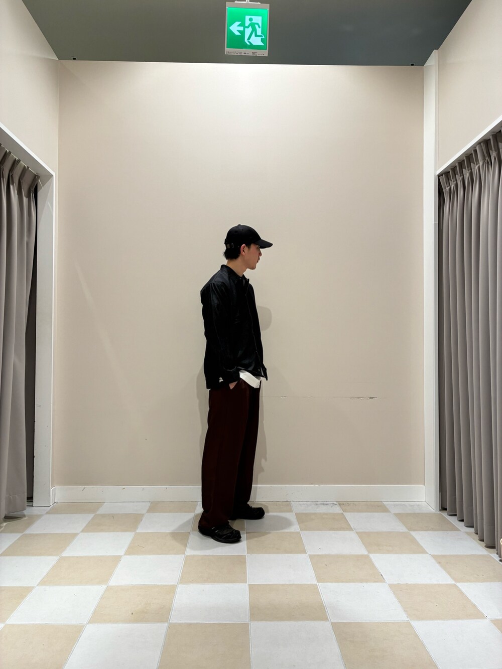 ブラックのシャツをベースに全体をダークトーンで統一しつつ、インナーのホワイトを覗かせることで重くなりすぎない抜け感を演出。ボトムスには深みのあるブラウンのワイドパンツを合わせ、シンプルながらも色のコントラストで奥行きをプラスしています。全体をルーズなシルエットでまとめることでリラックス感を出しつつ、キャップとレザーシューズで引き締め、都会的で洗練されたストリートスタイルに仕上げています。