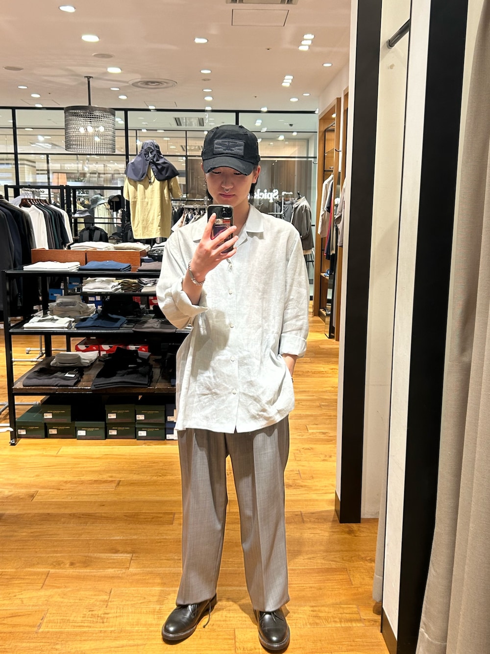 リネンシャツの水色をスラックスの水色のラインで拾ってます!