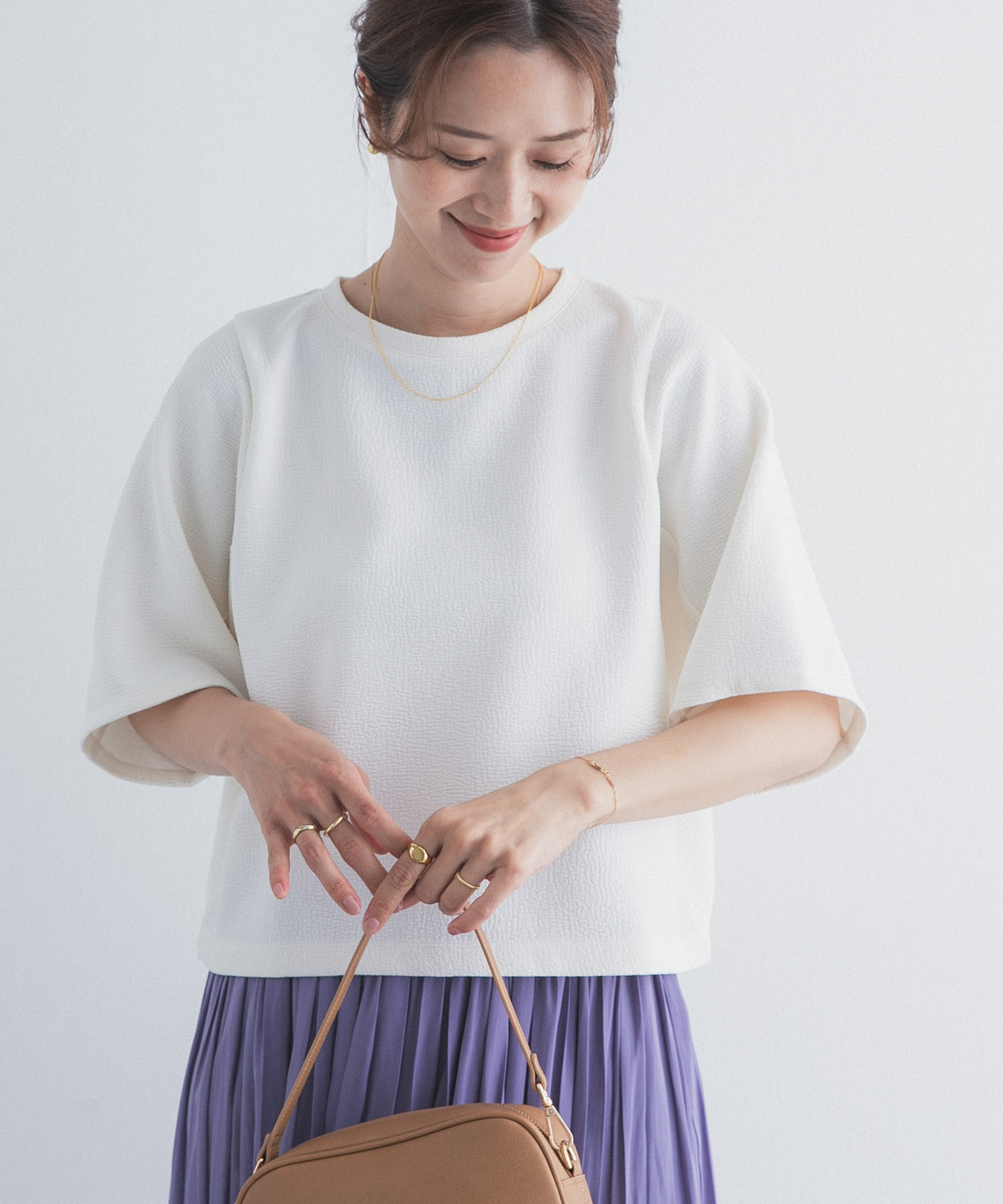 コンパクトな着丈が可愛いトップスはオンオフ