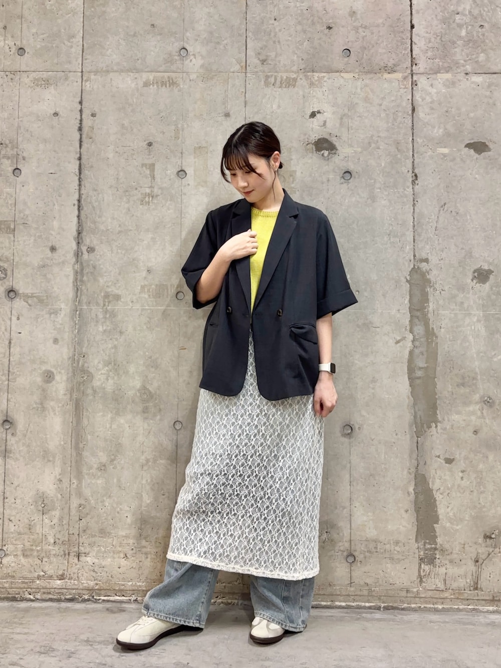 今回はカラーものに挑戦したく、新作のサマーニット生地とレイヤードスカート、デニムで合わせました!