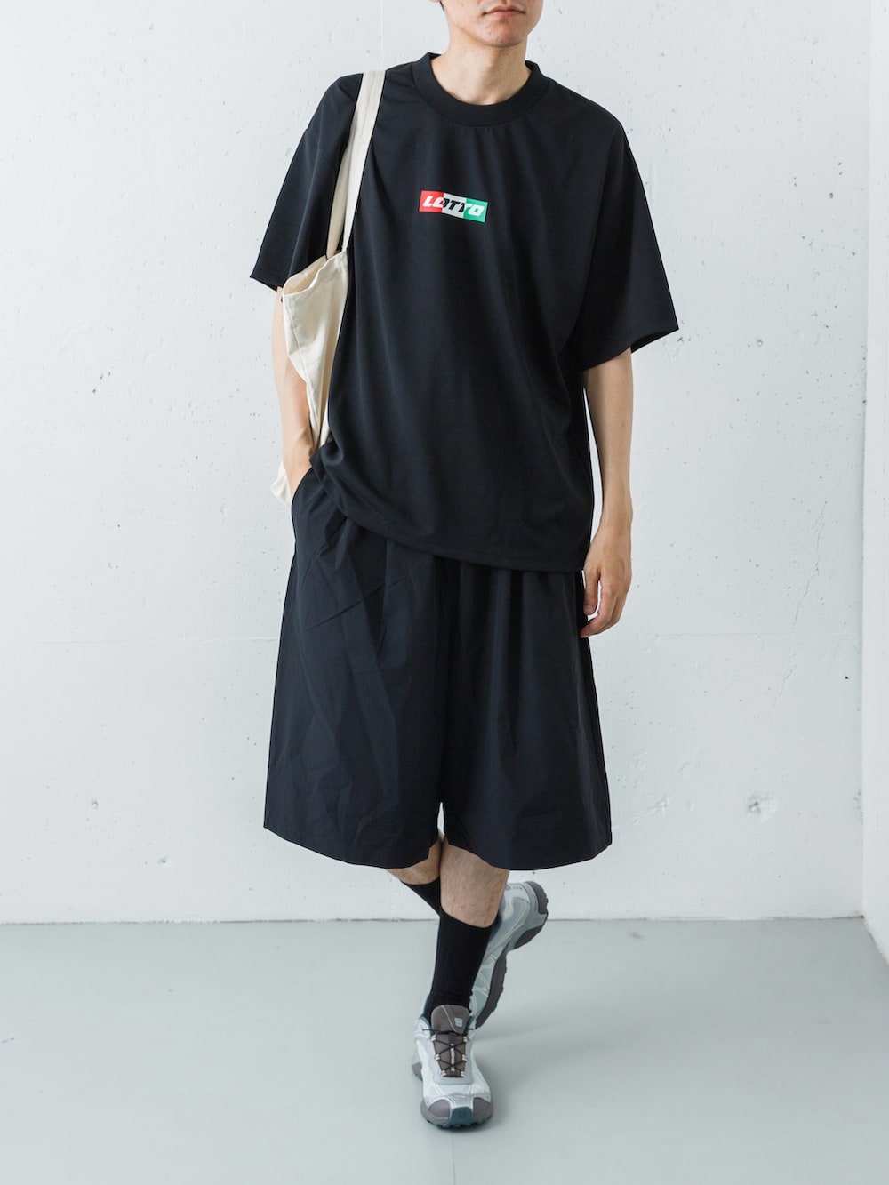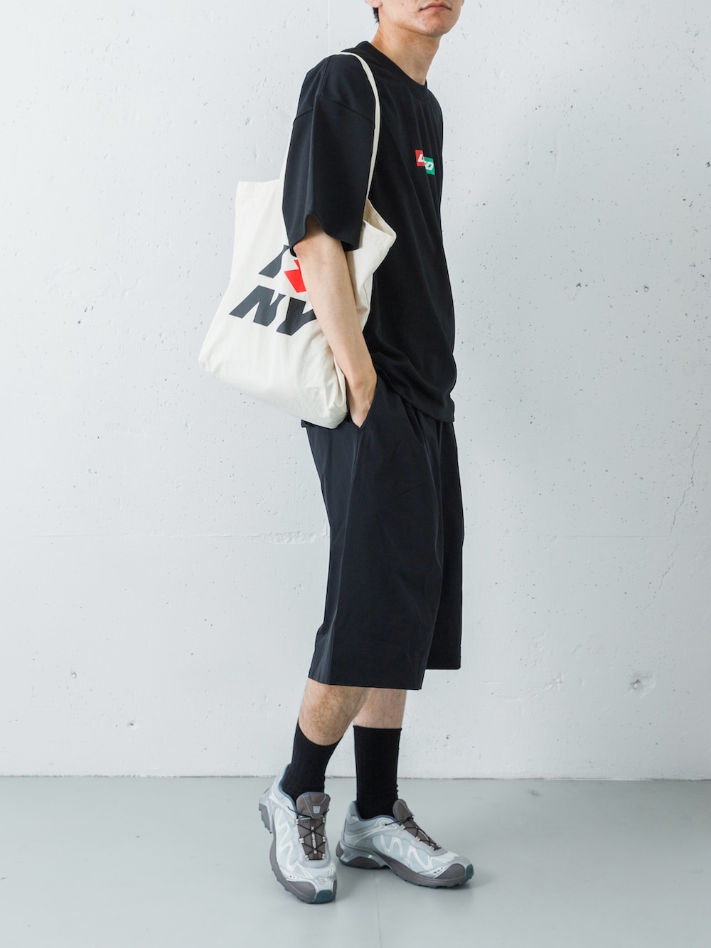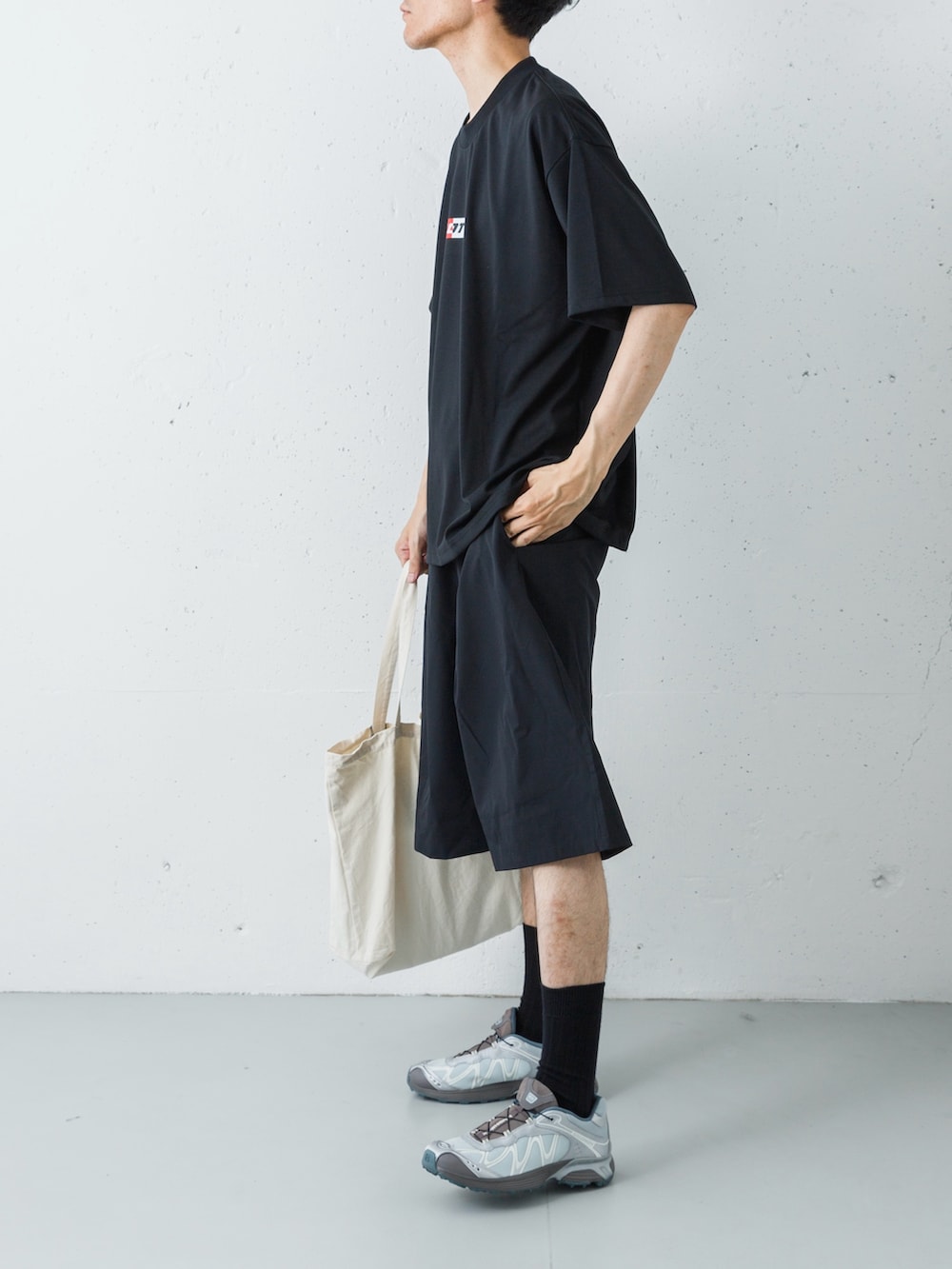 足元には、アーバンリサーチ別注のSALOMON「XT-WHISPER」を投入。ブラックのウェアに対し、絶妙なニュアンスのグレーが視線を下げすぎず、軽やかなリズムを生み出します。仕上げにナチュラルのトートを添えることで、ストイックな黒の世界に柔らかな「ヌケ感」と実用性をプラス。ジムから街歩きまで、シームレスに駆け抜けるスタイルを完成させます。