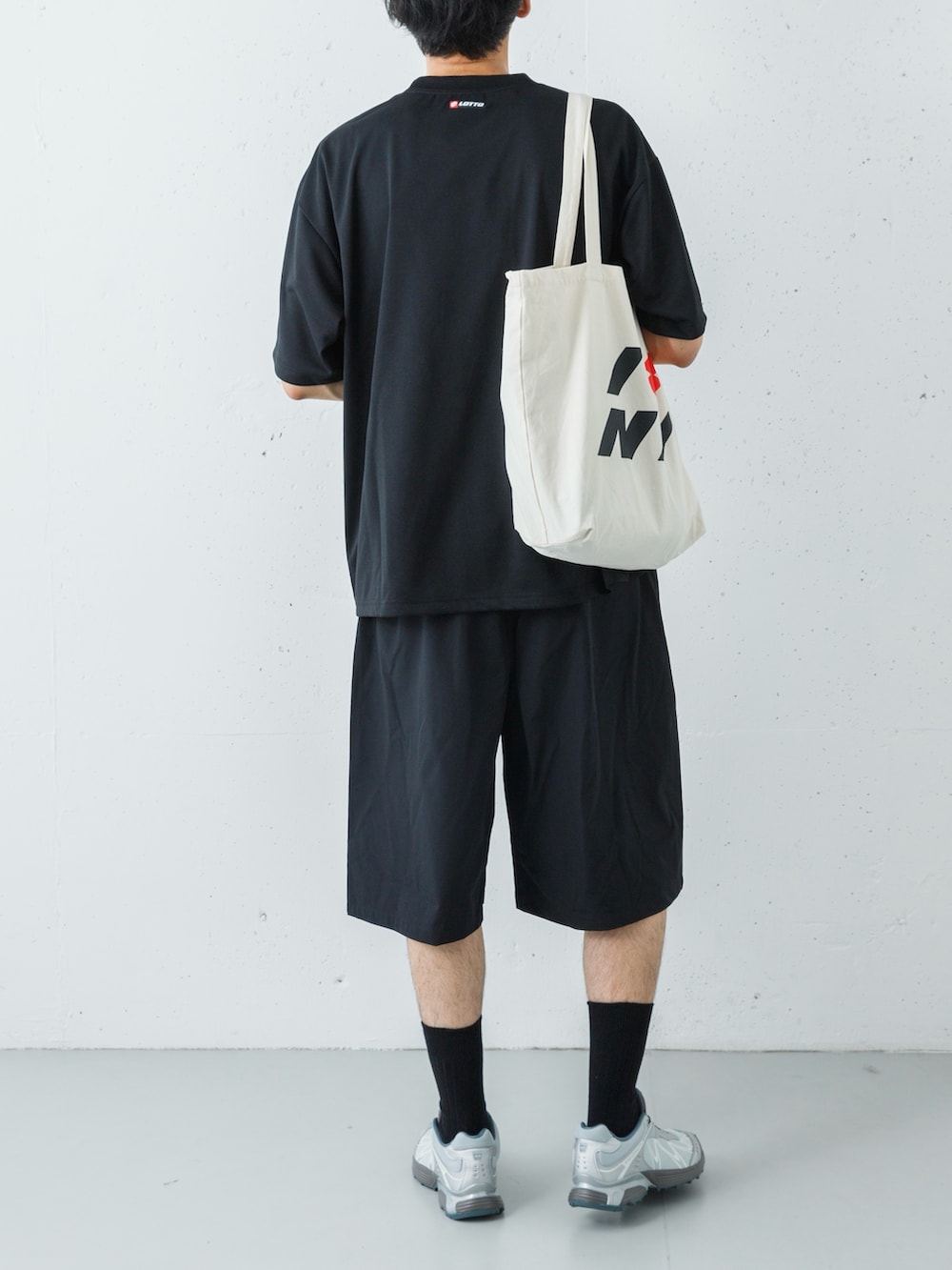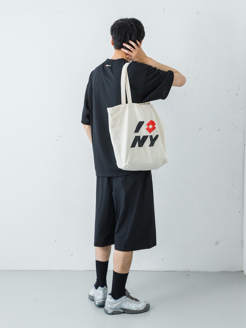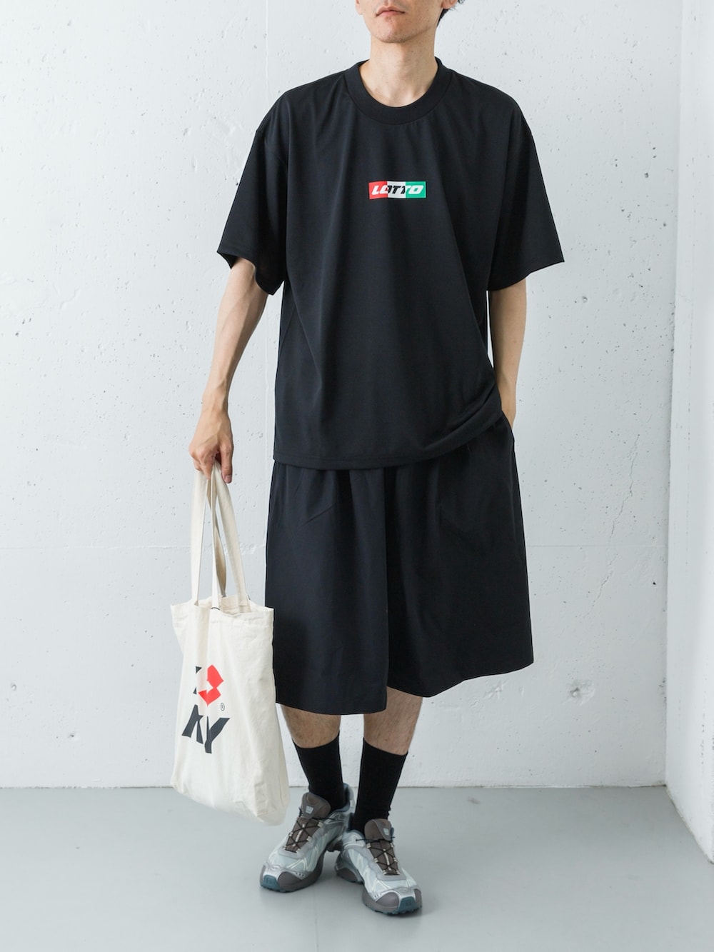 足元には、アーバンリサーチ別注のSALOMON「XT-WHISPER」を投入。ブラックのウェアに対し、絶妙なニュアンスのグレーが視線を下げすぎず、軽やかなリズムを生み出します。仕上げにナチュラルのトートを添えることで、ストイックな黒の世界に柔らかな「ヌケ感」と実用性をプラス。ジムから街歩きまで、シームレスに駆け抜けるスタイルを完成させます。