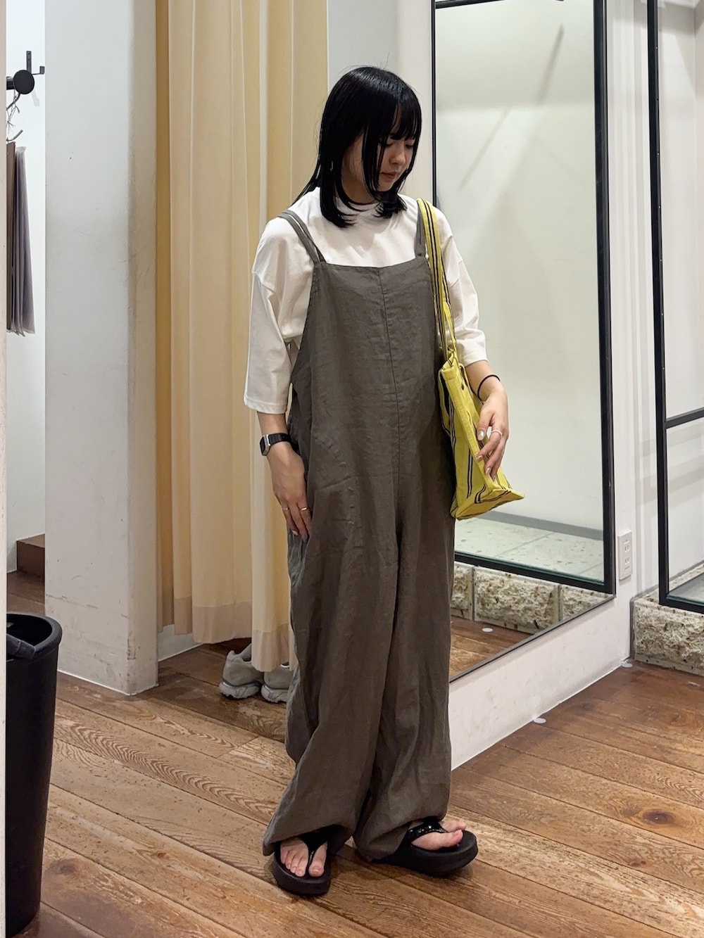 リネンの風合いが魅力的で、大人な雰囲気で着こなしていただけます🐈⬛肩紐で長さの調整が可能なので、低身長の方でも問題ないです🙆♀️