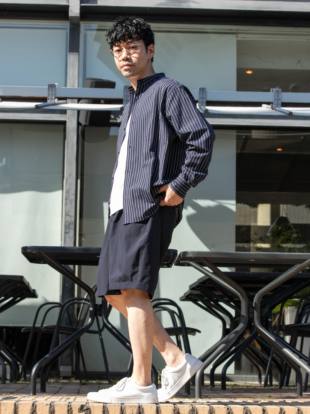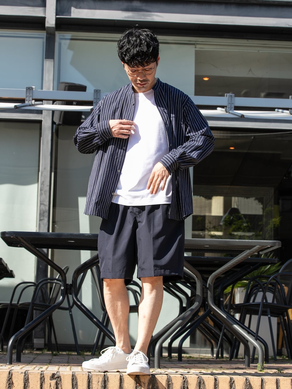 ストライプ柄が大人な印象のシワが気にならないリネンシャツを羽織に別注+Phenixのショーツを合わせました。