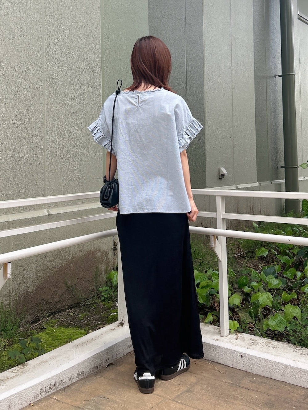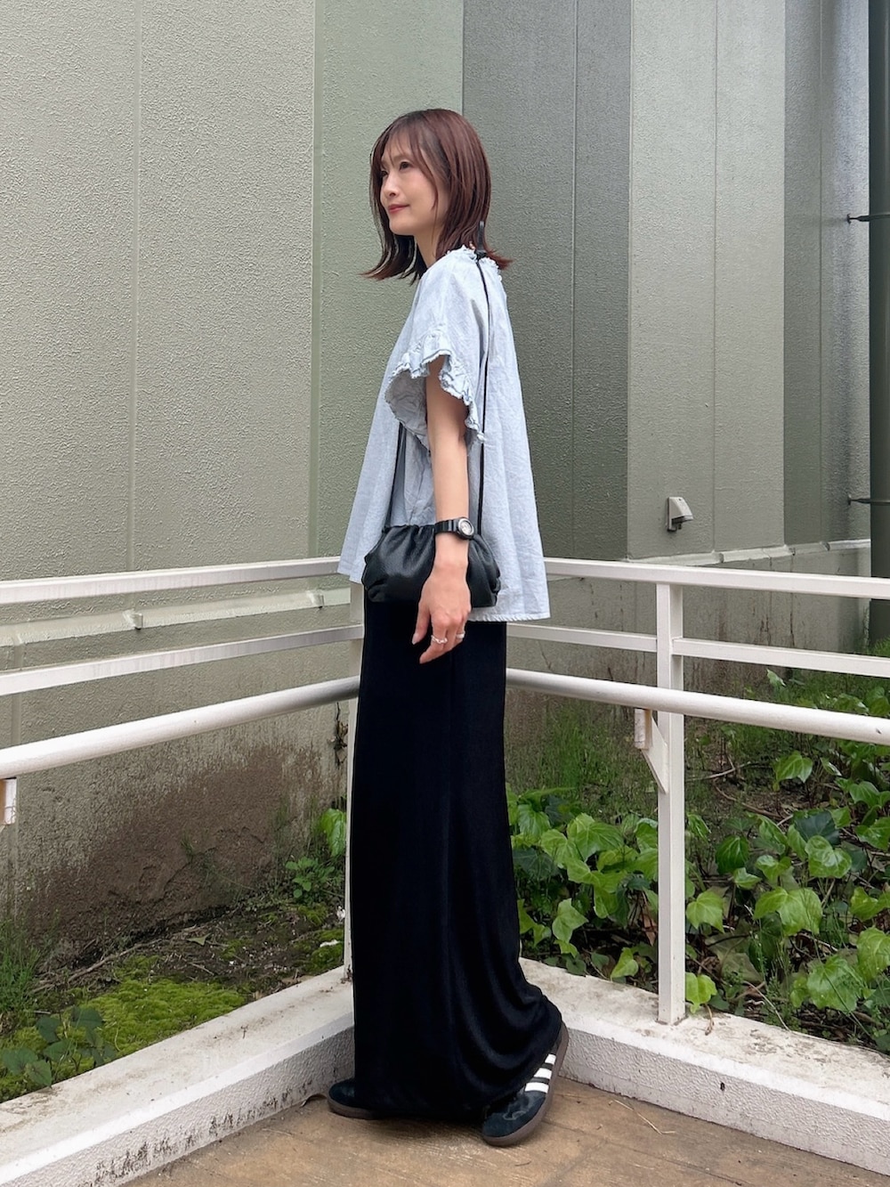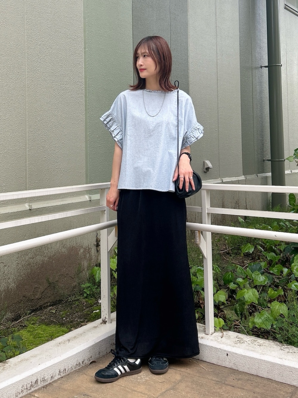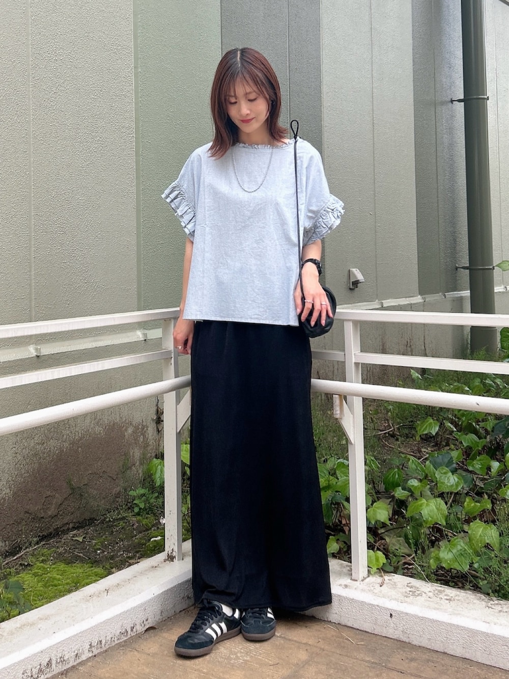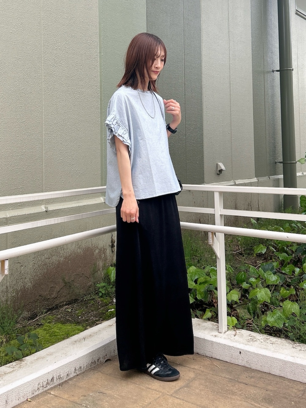 ▶︎ スカートは落ち感がきれいで、体のラインも拾わないから履くだけでスッキリ見え。