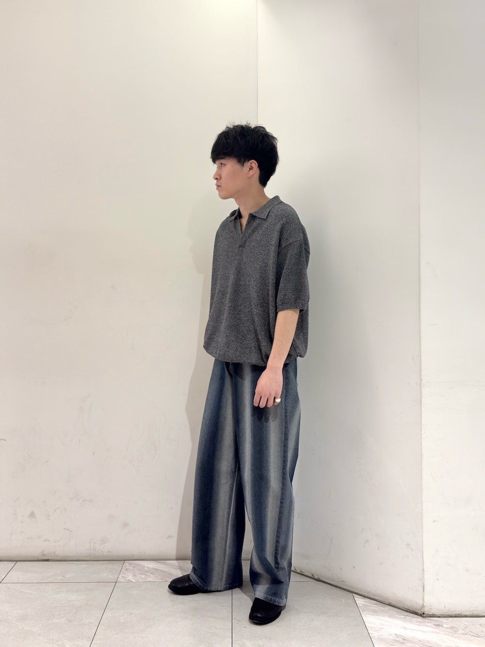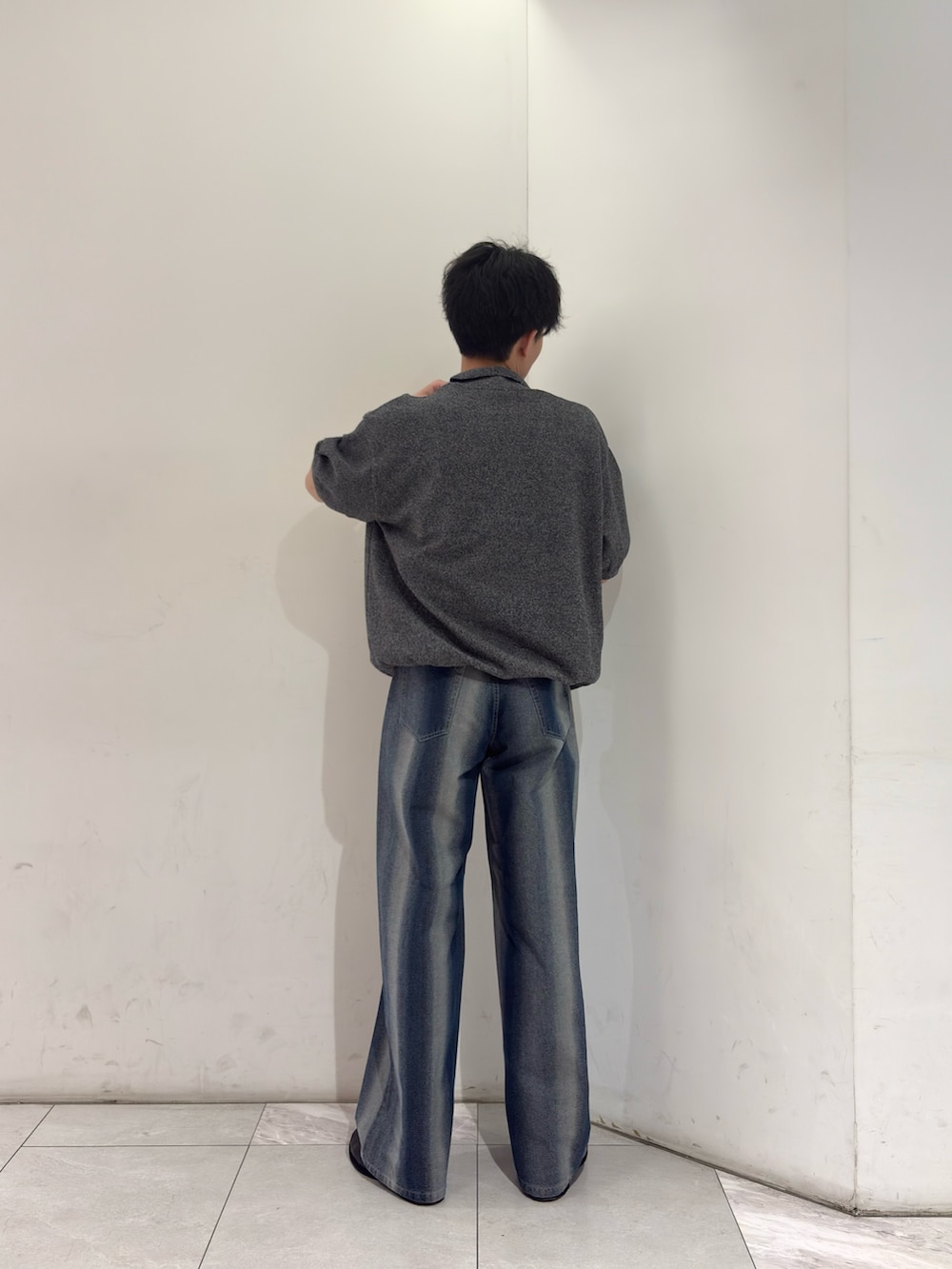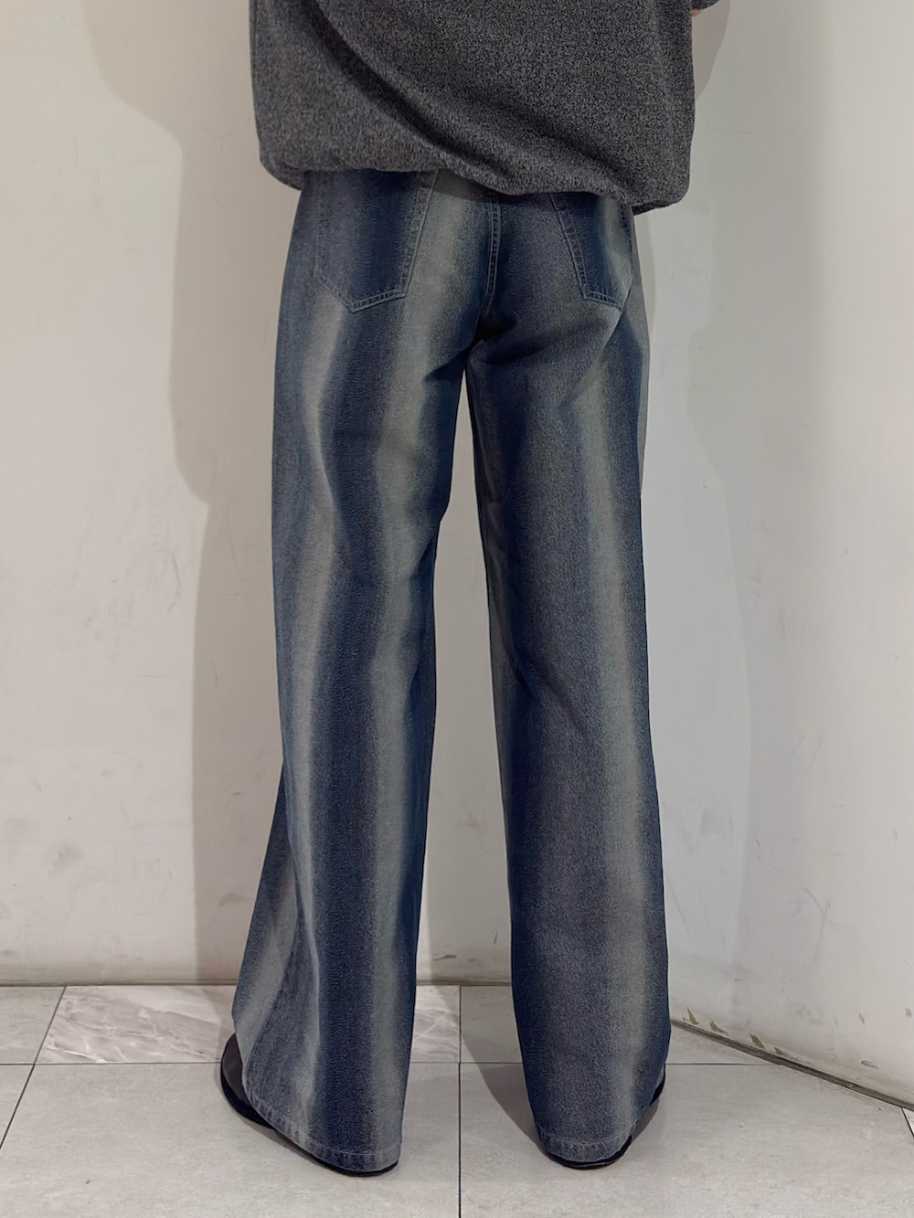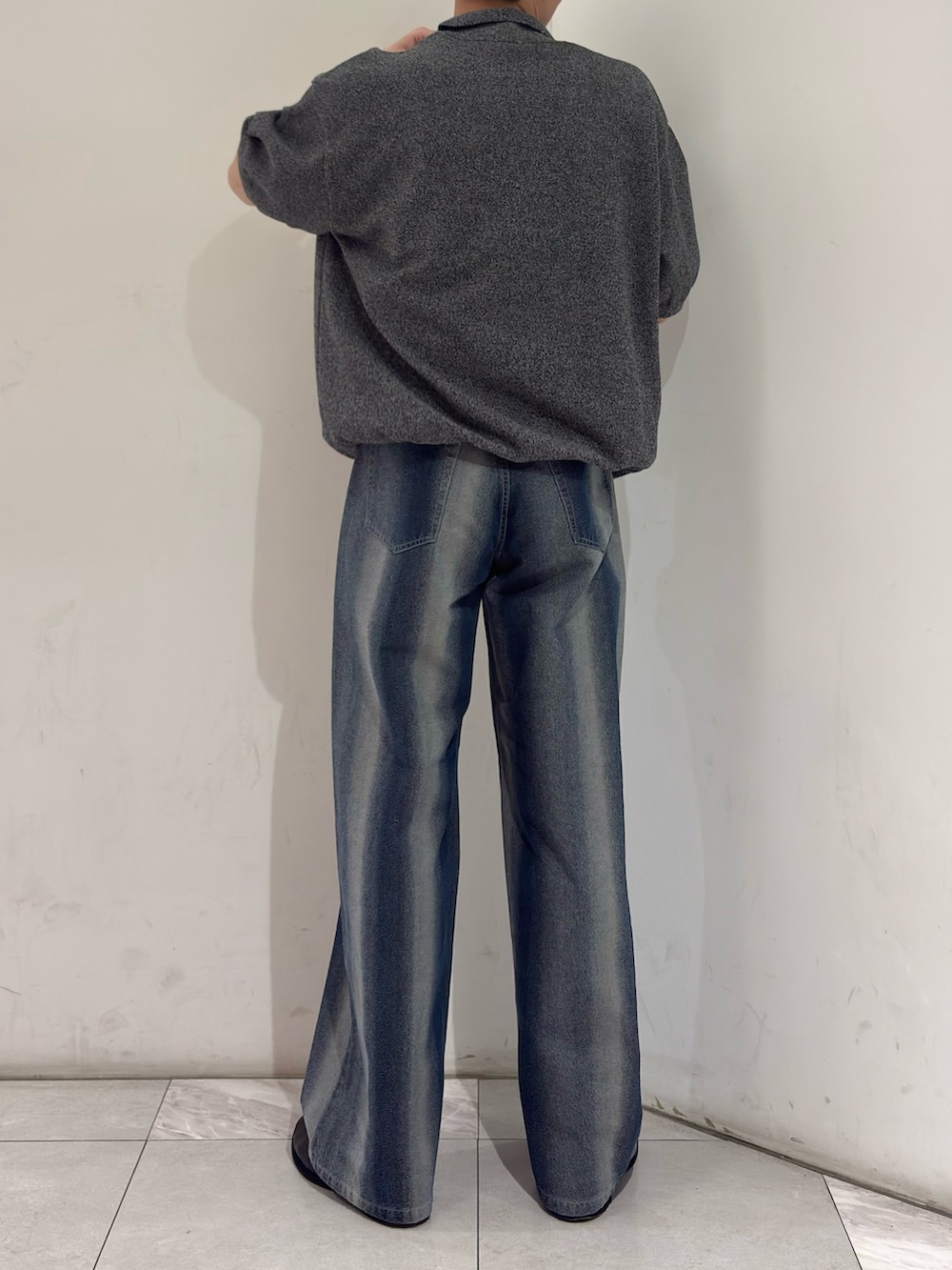 グラデーション生地が目を引く、デニムパンツ。グラデーションは染めで「まばらに」という概念を覆す。ジャガード織で「均一に」。計算されたグラデーションが経年変化とともにどうなるのかが楽しみです。