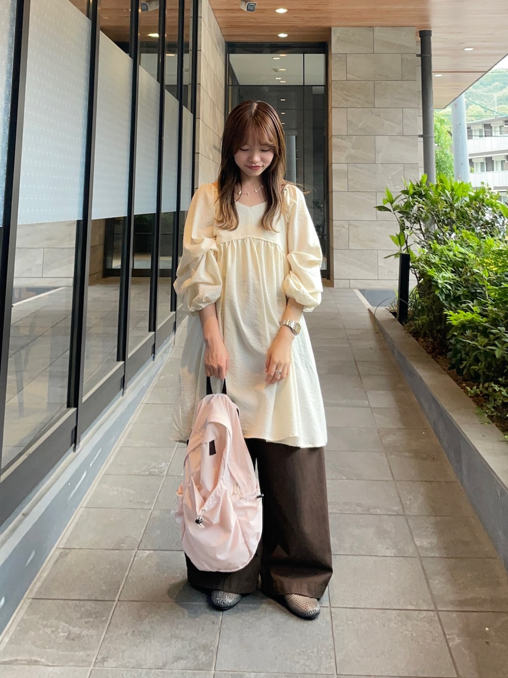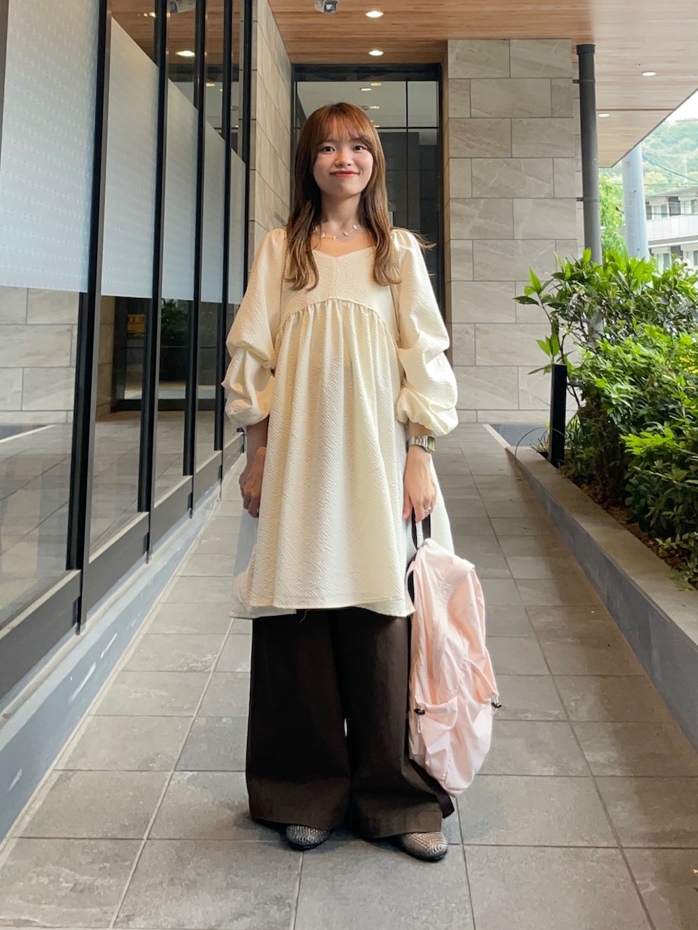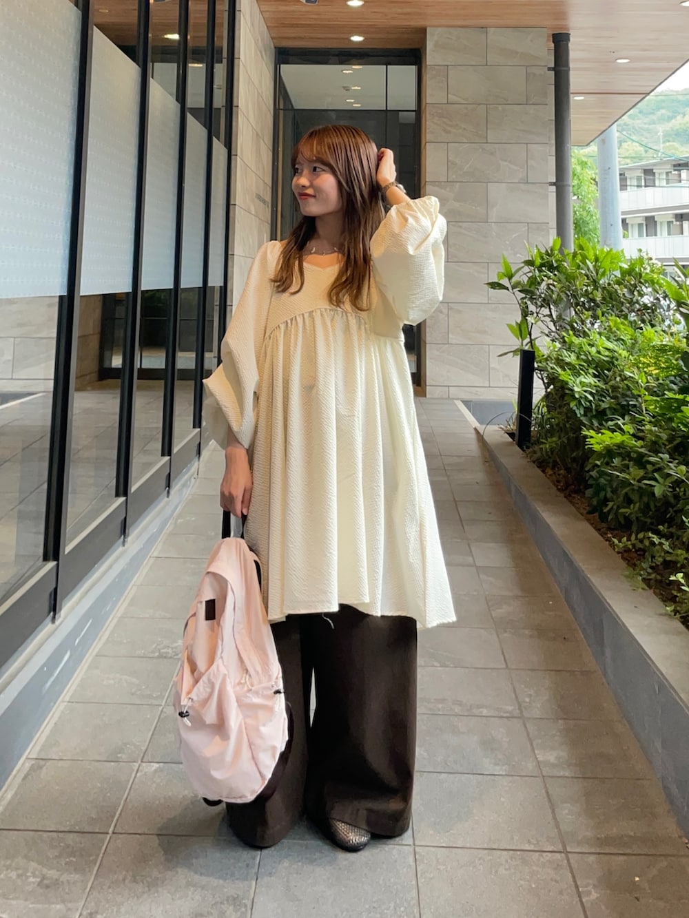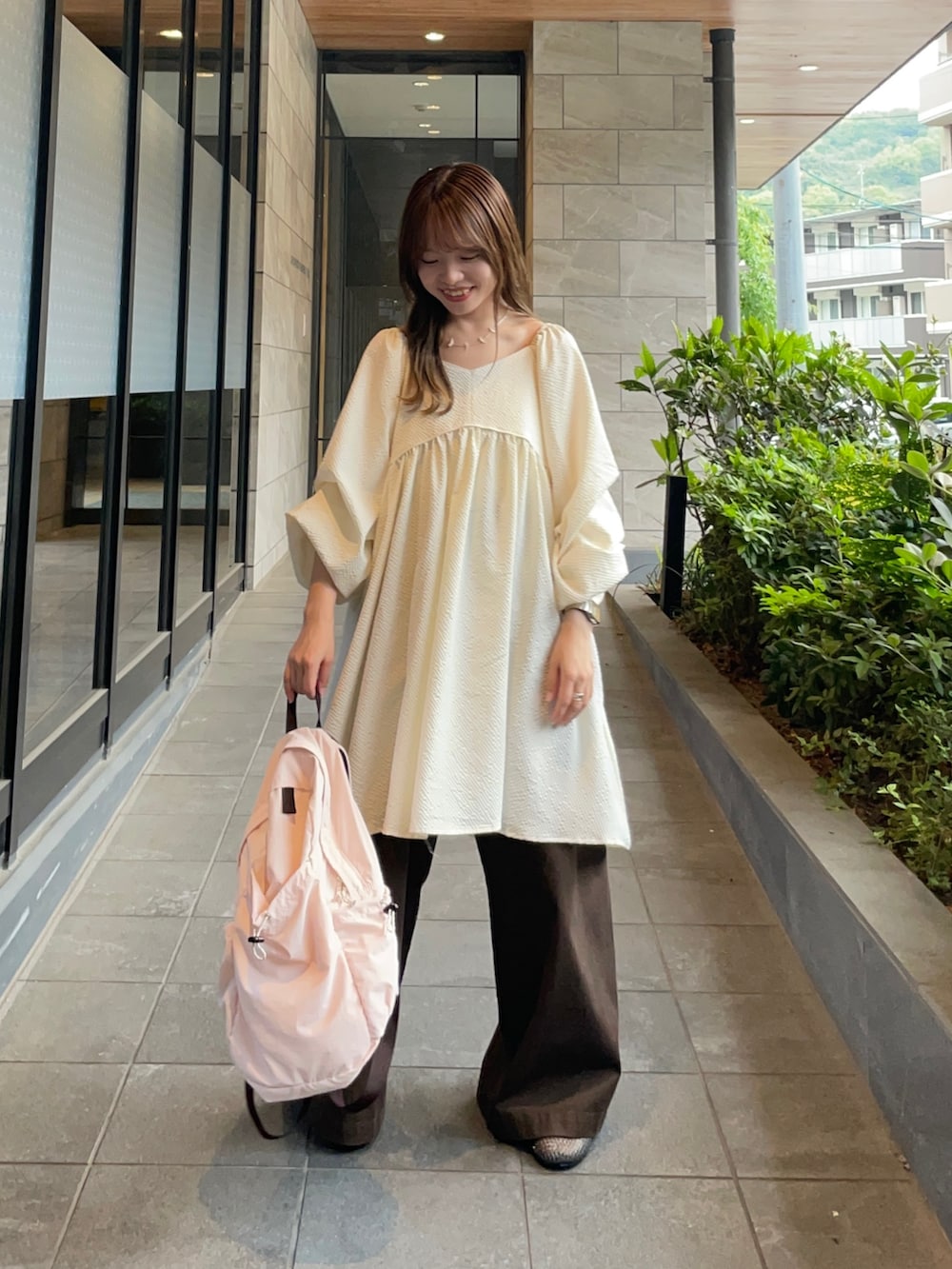 トップスはタックスリーブミニワンピースです!前後2WAY仕様となっており、どちらできてもすっきりと首元見せてくれるデザインがオススメポイントです✨私の身長でかなり長めですが、ズボン合わせで可愛らしいイメージとカジュアルにもいけてバランスよく着れます♪