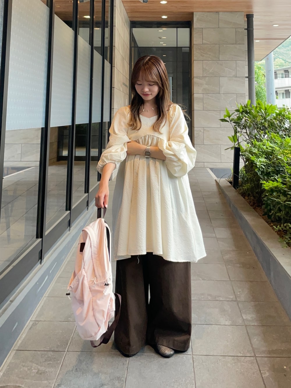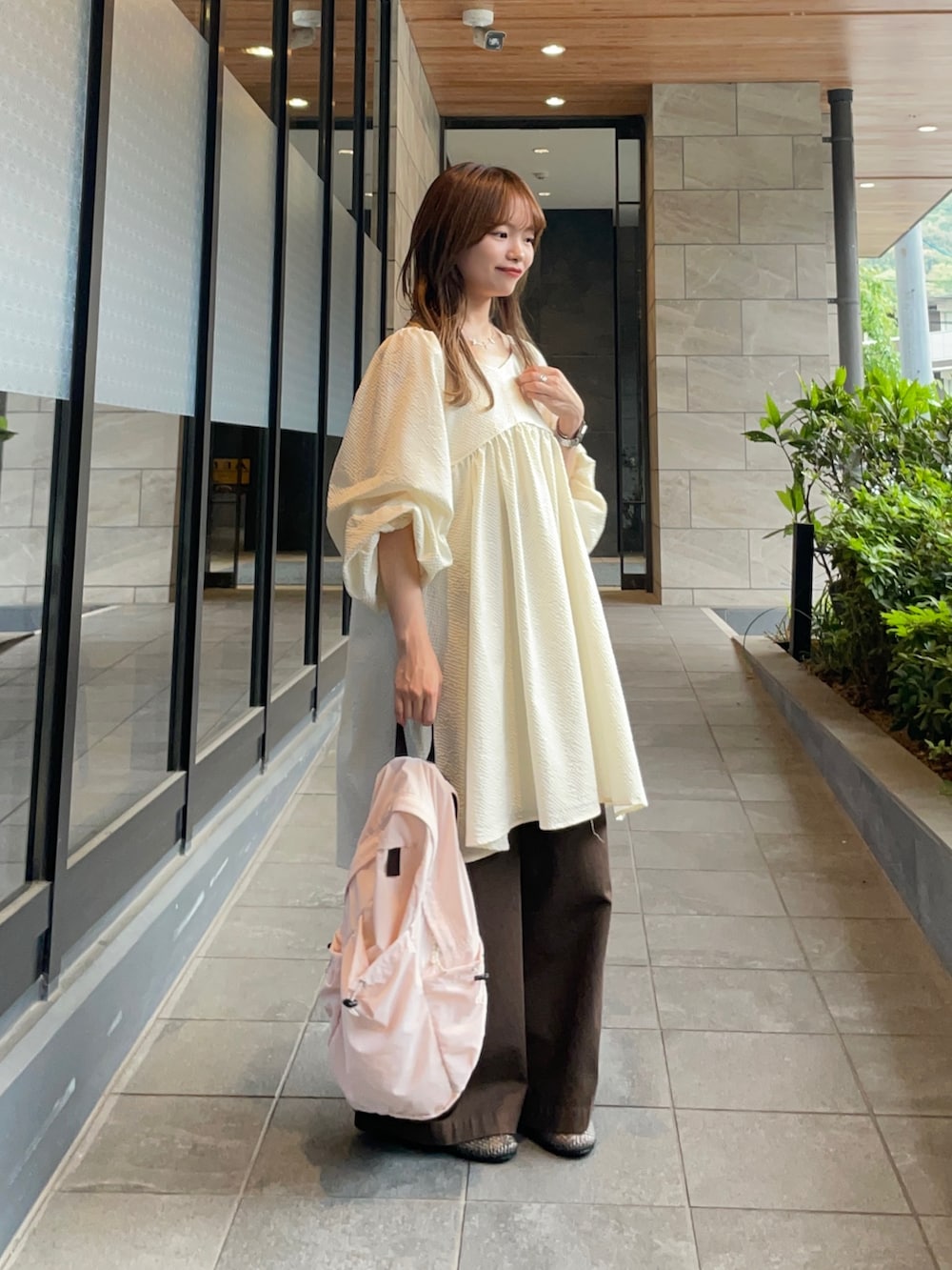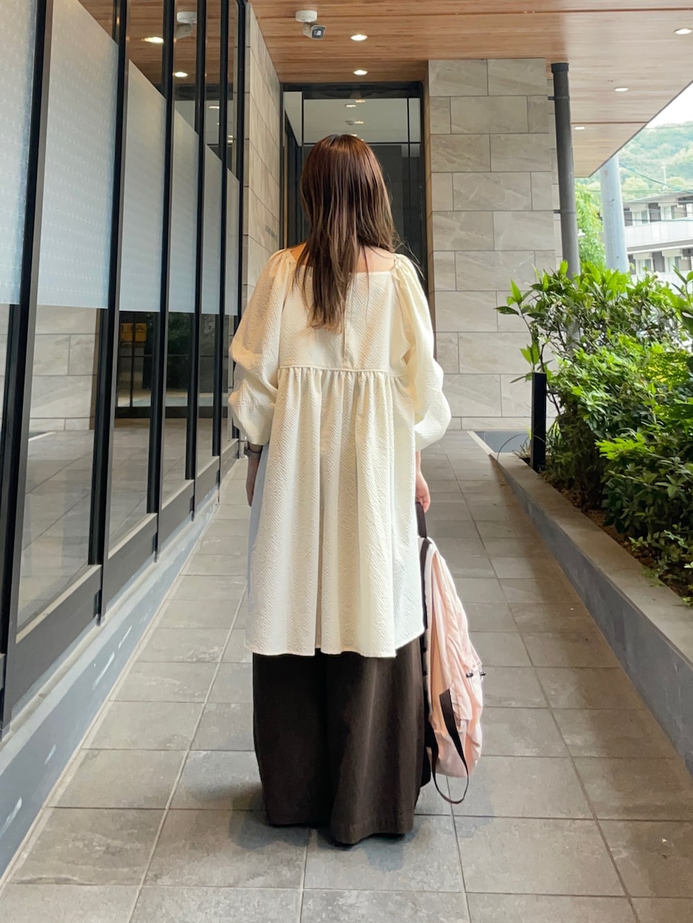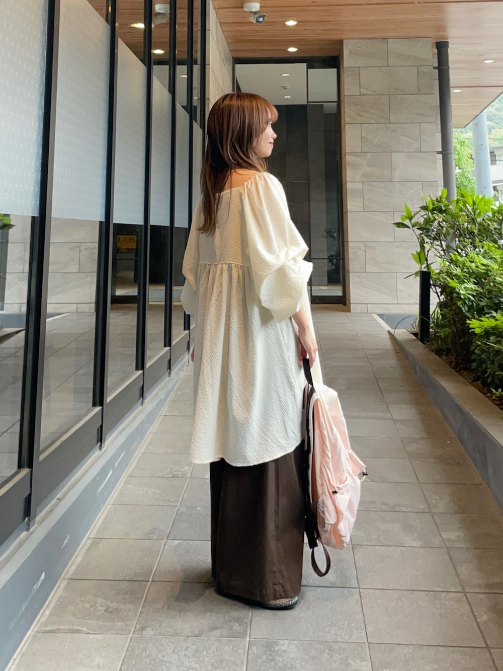 トップスはタックスリーブミニワンピースです!前後2WAY仕様となっており、どちらできてもすっきりと首元見せてくれるデザインがオススメポイントです✨私の身長でかなり長めですが、ズボン合わせで可愛らしいイメージとカジュアルにもいけてバランスよく着れます♪