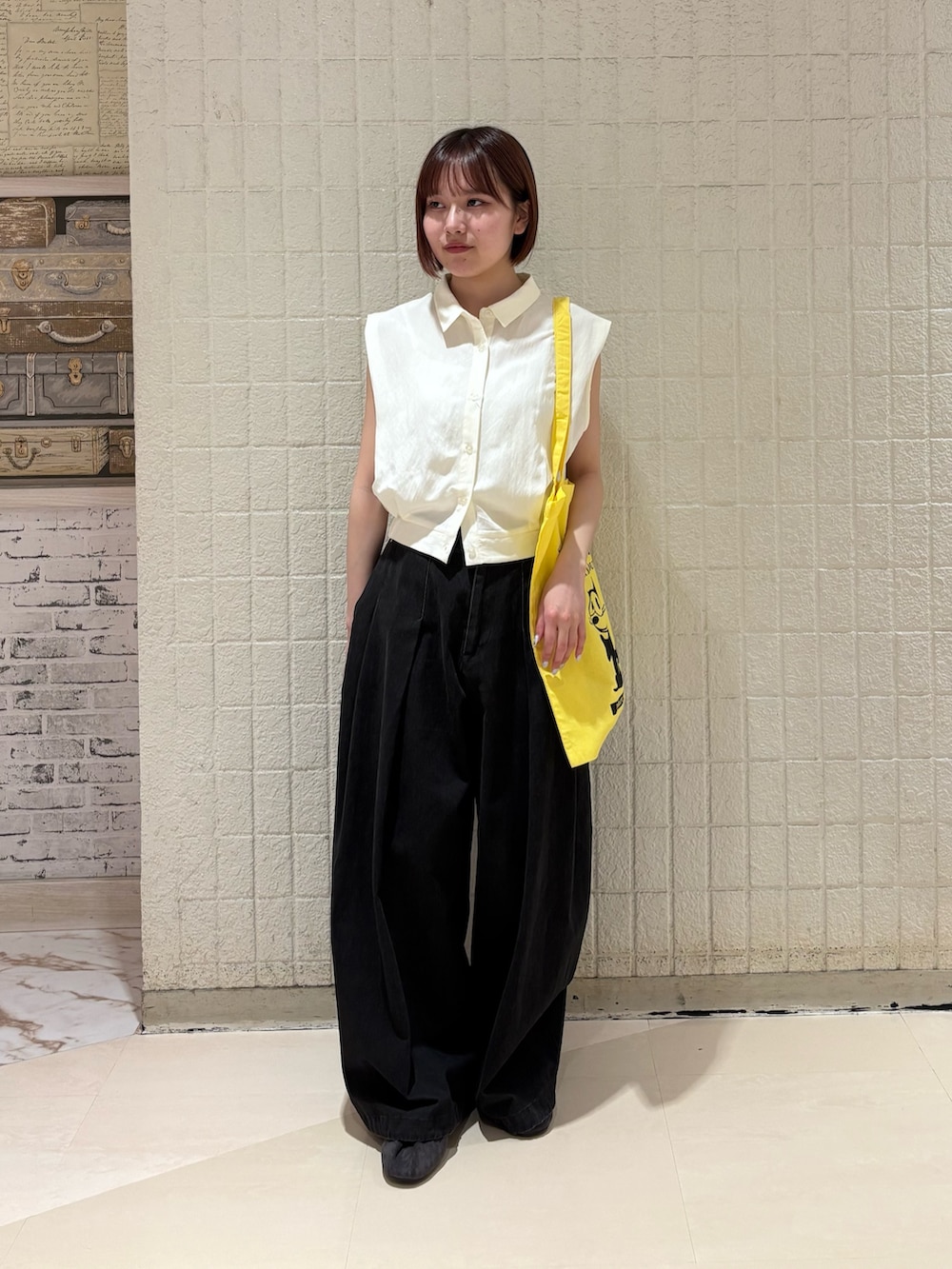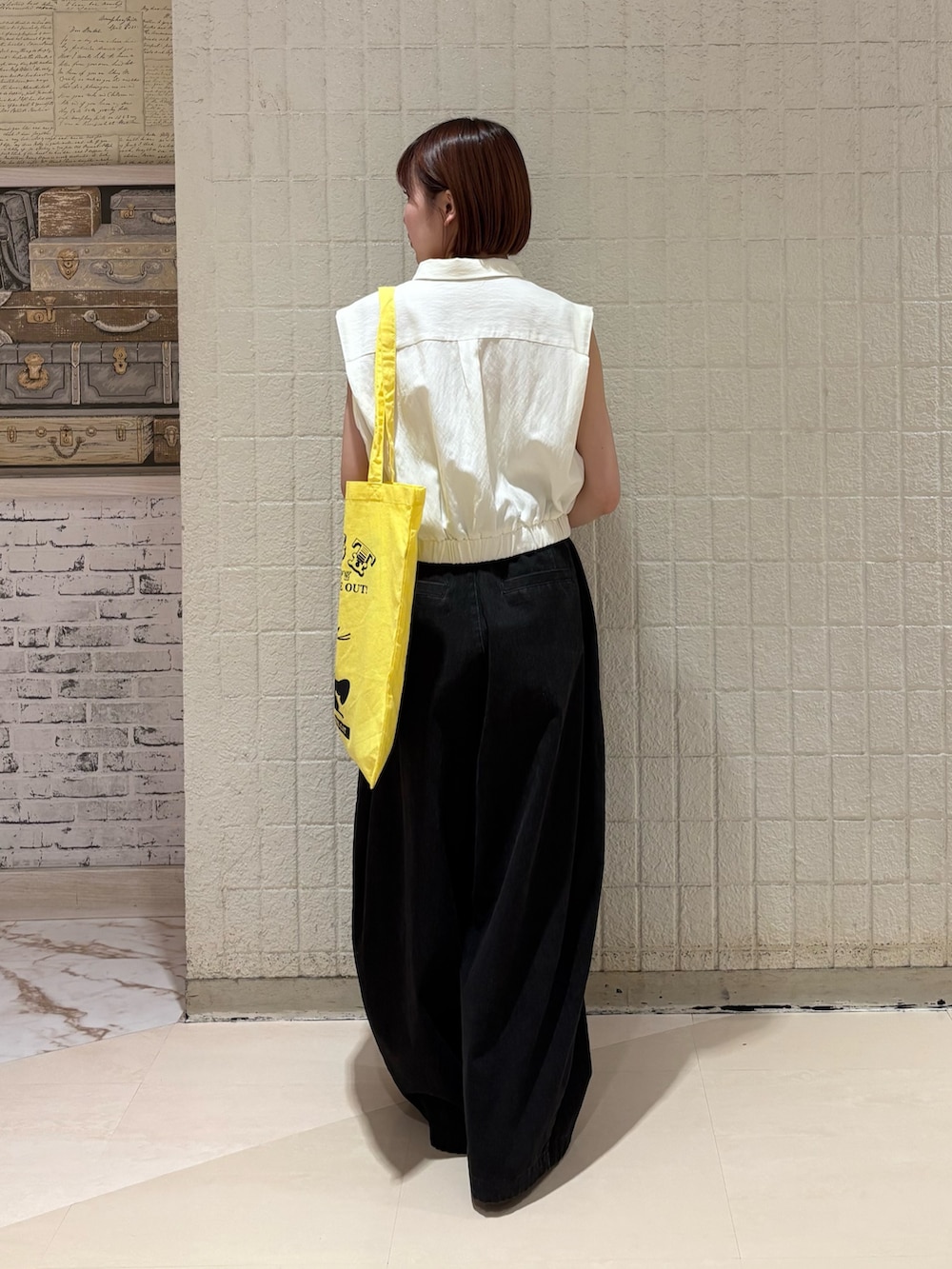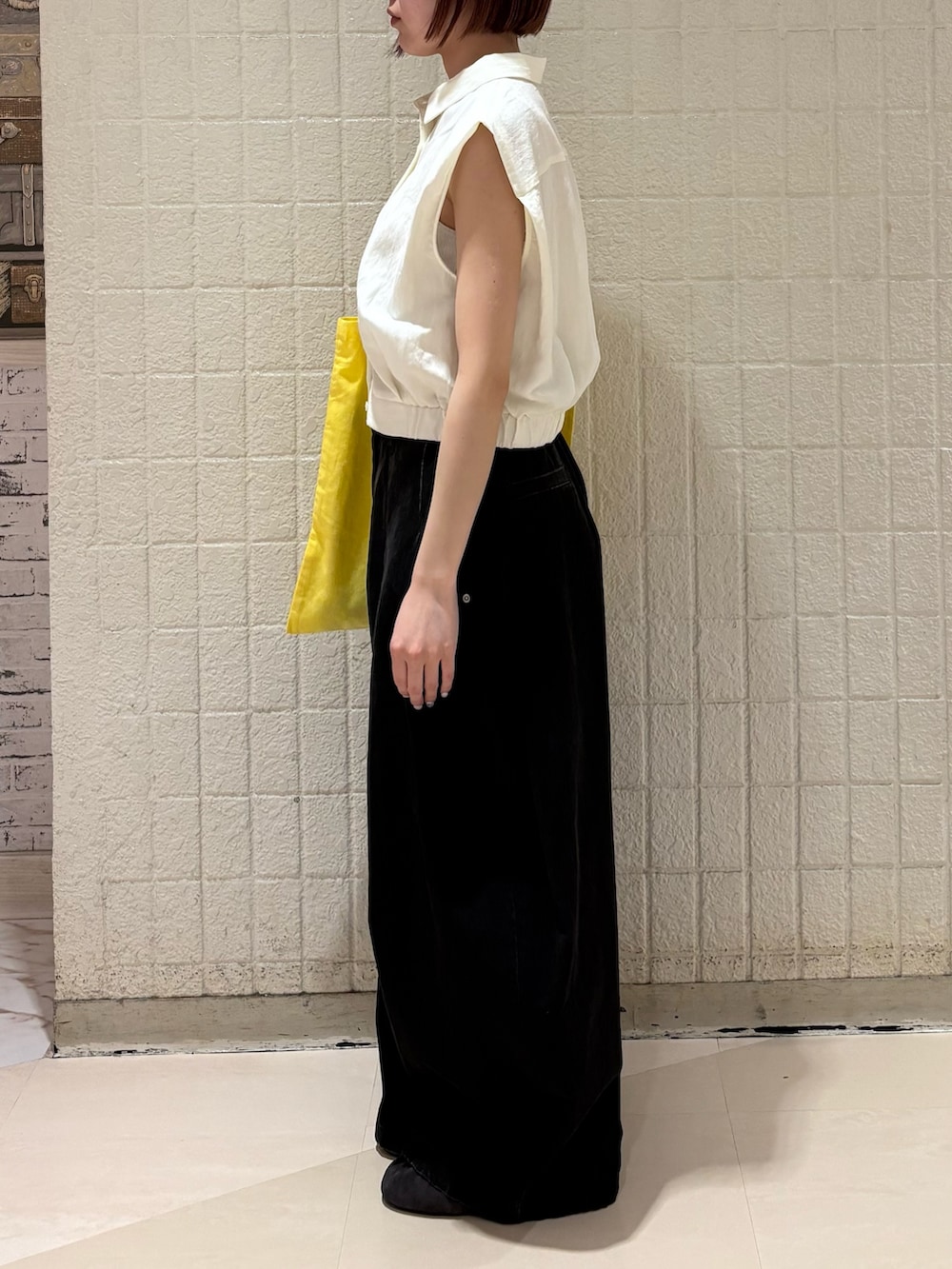 トップスがコンパクトな形なので、ボトムスにゆるっとしたものを持ってくると、全体的にAラインができるので、きれいなシルエットで着ていただけます!
