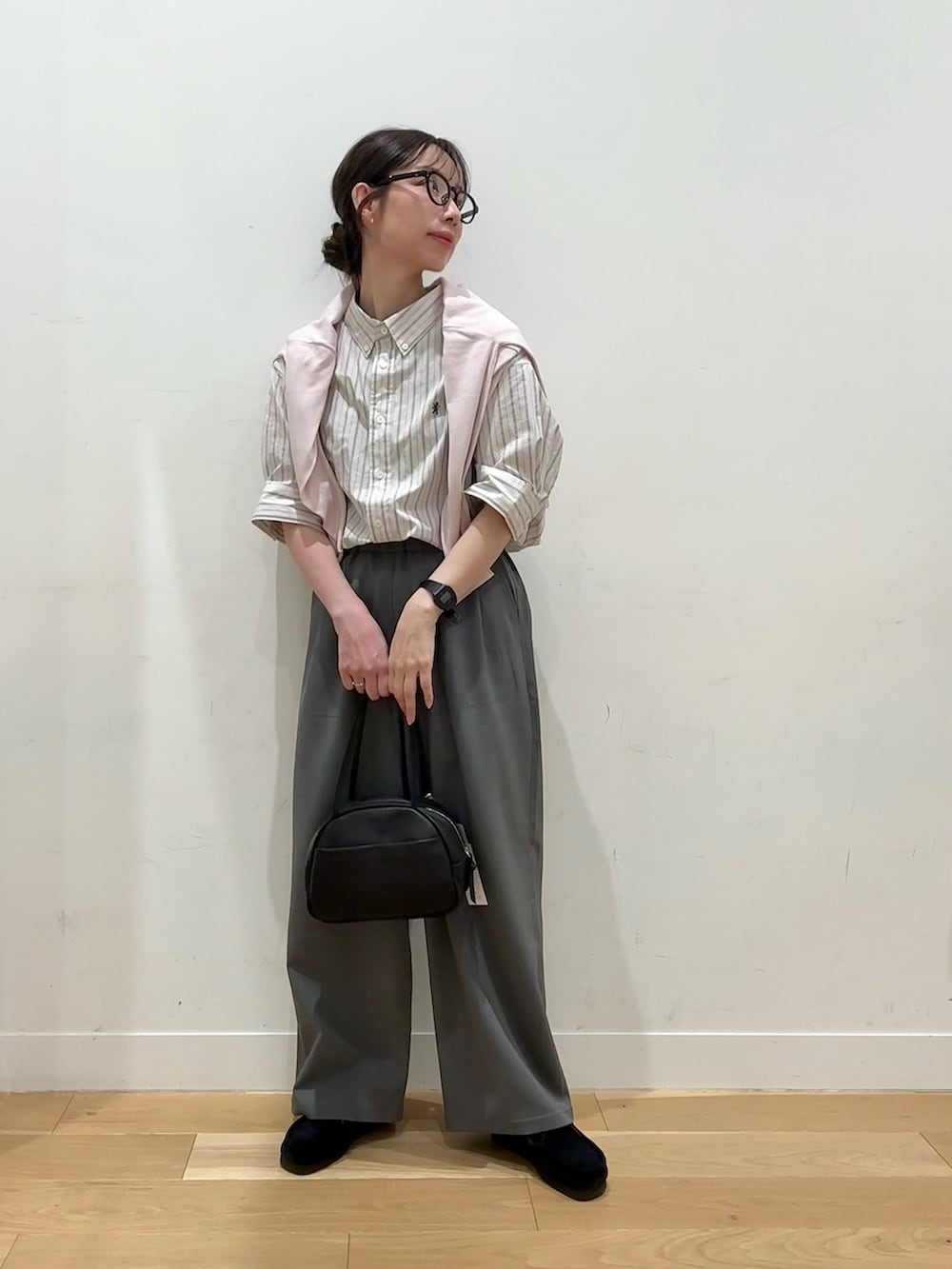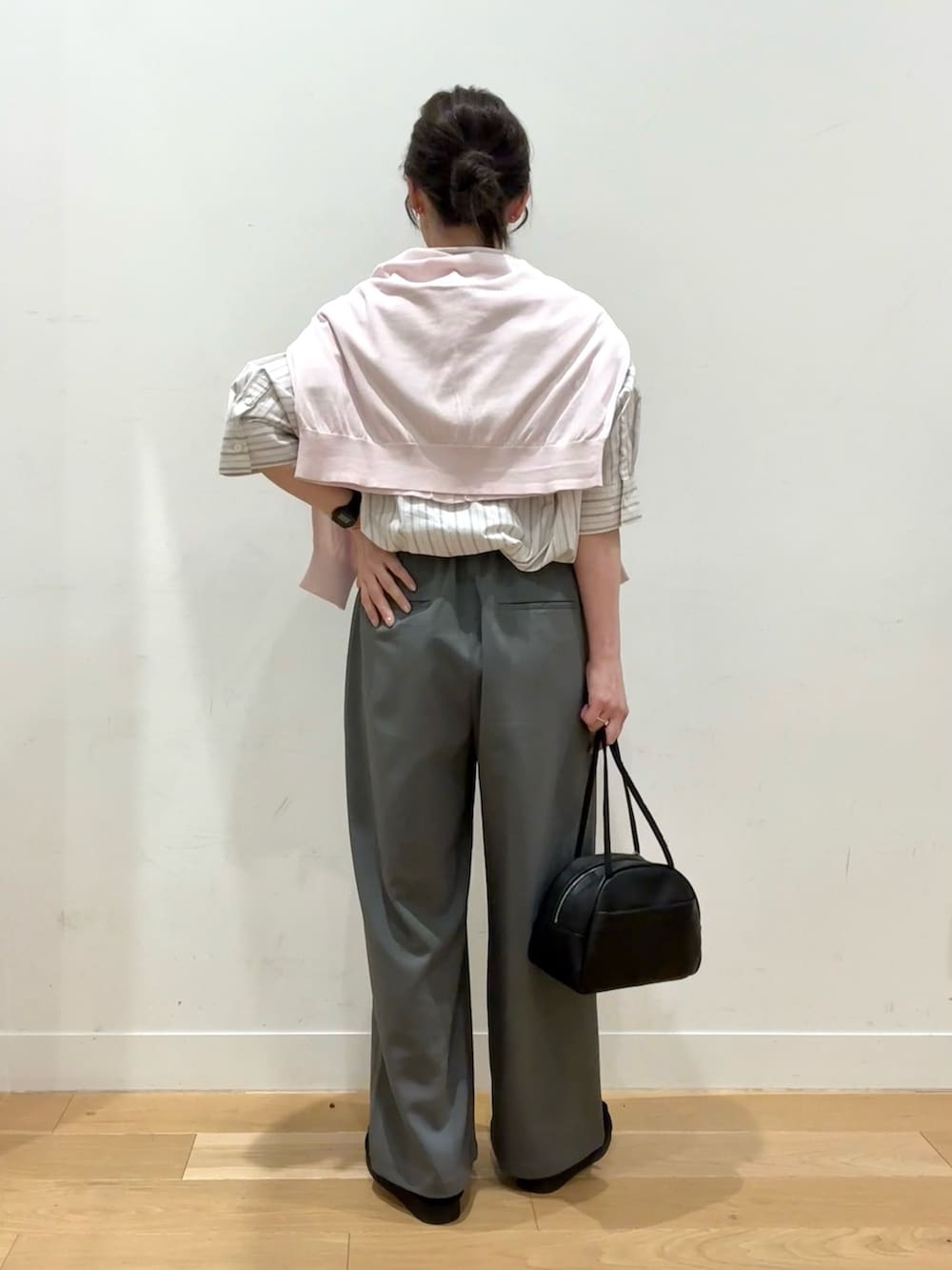 少しシャリ感のある清涼生地のスラックスは待望の明るめグレꔛ♡真ん中のMサイズをチョイス