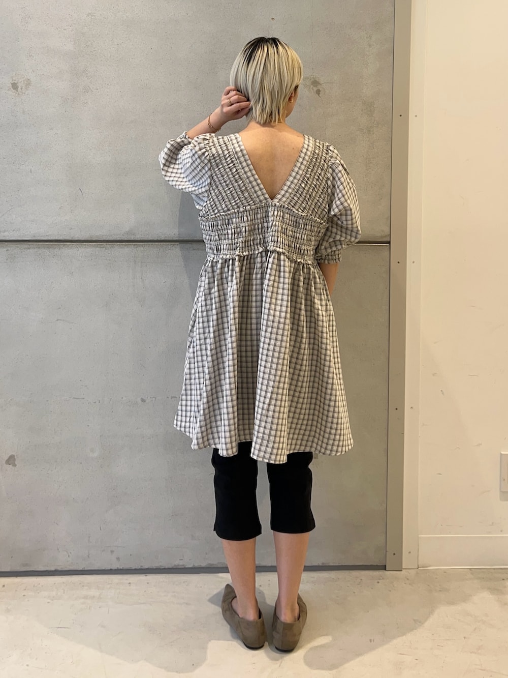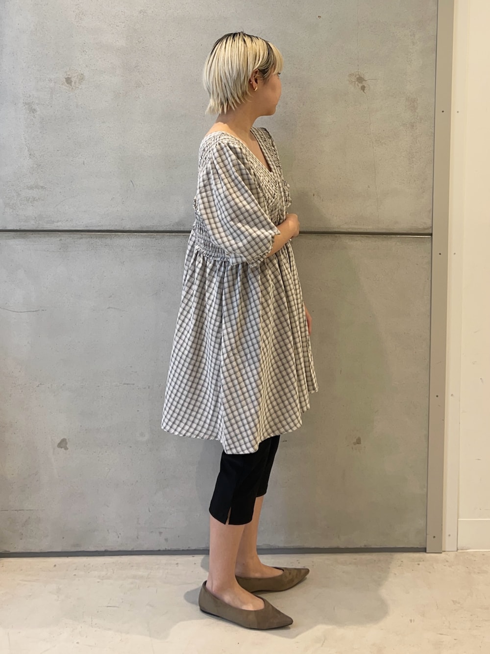 チェック柄ワンピースはフワッとしたシルエットではありますが、前後がVネックで空いているのとシャーリングが入っていることで大人ぽく着れます✨