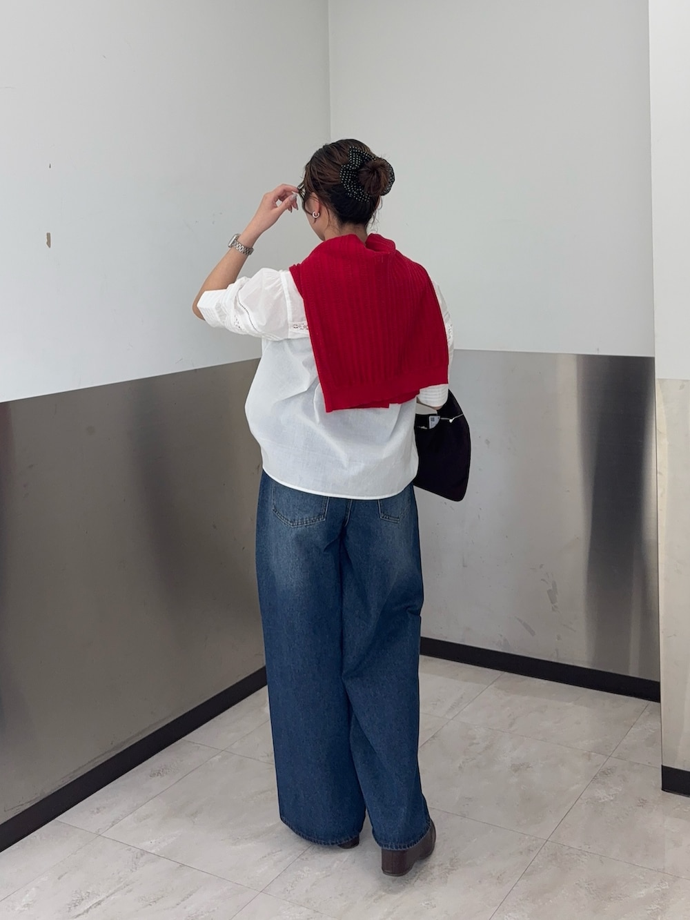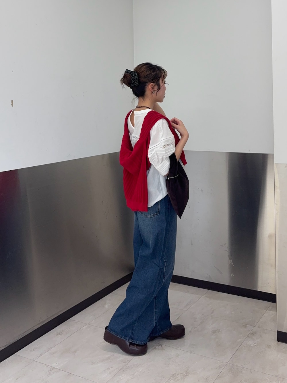 差し色に赤のカーディガンを使っています!