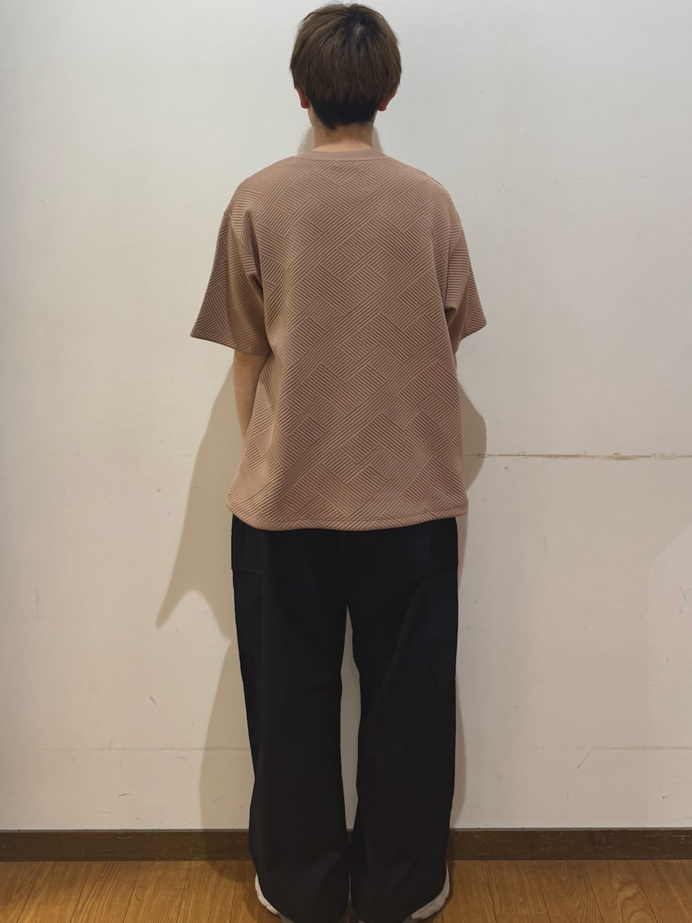 パンツはカジュアルに仕上げたかったので、ポリカーゴパンツを使いました。かなり大きめで、とても履きやすいパンツとなっております。