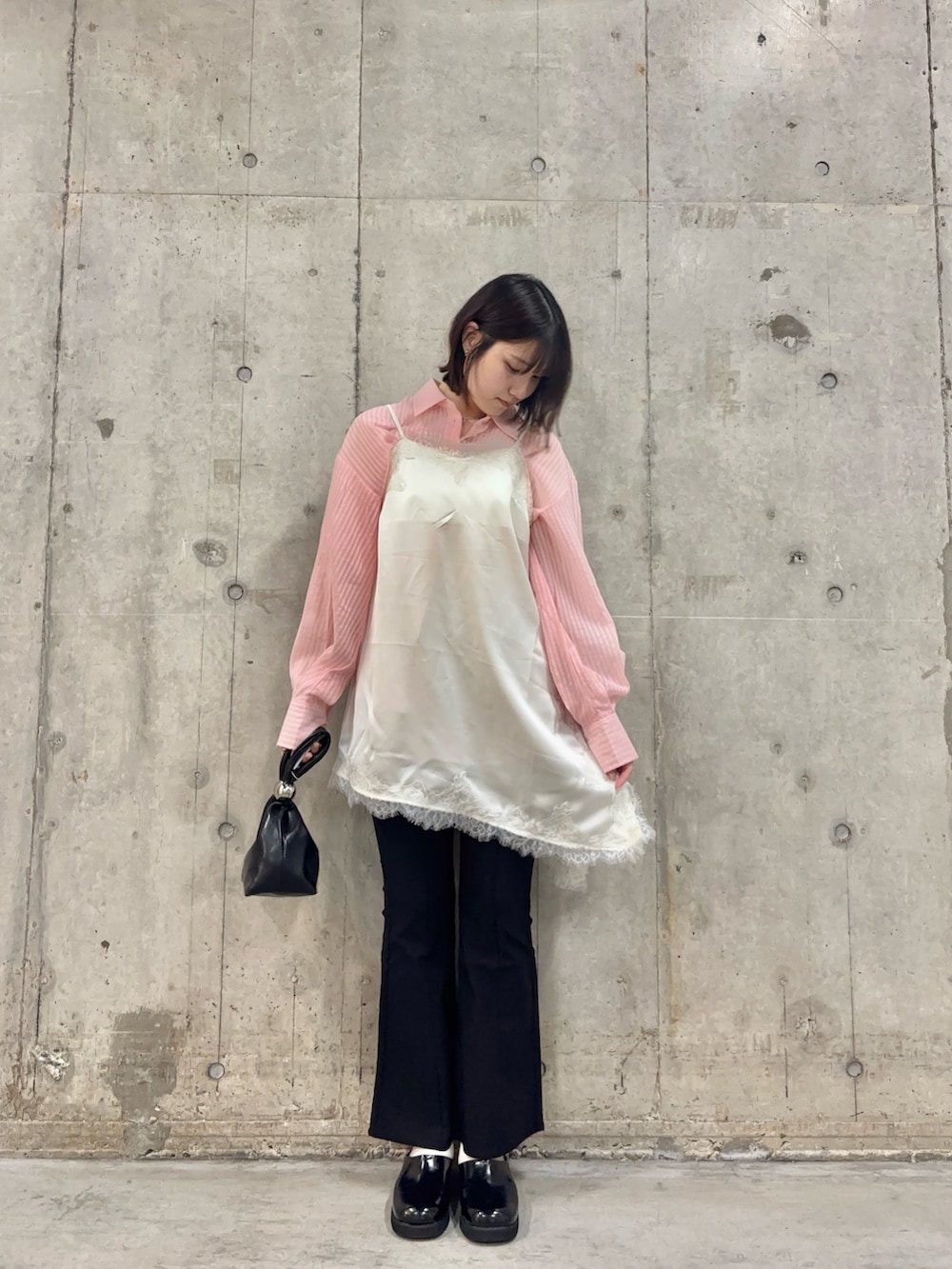 今回は鮮やかなシアーのピンクシャツを合わせ、腰回りまで隠れるサテンチュニックでも細見えするために、ストレッチフレアパンツを合わせました✨🙌🏻