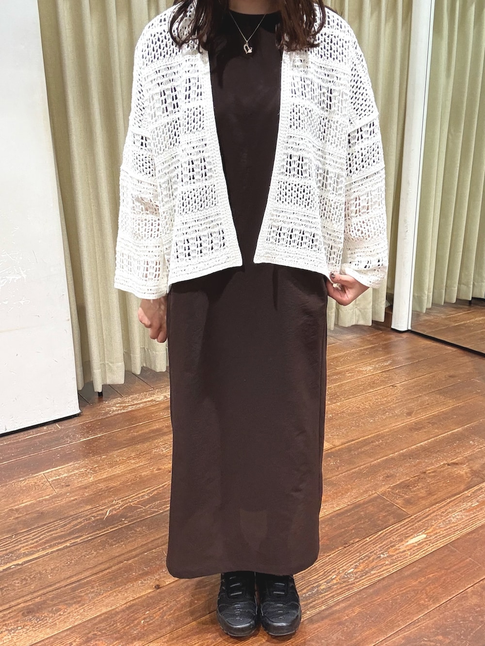 DOTAIRシリーズのワンピースに袖のボリュームと程よいゆったり感が着やすいカーディガンを合わせました。