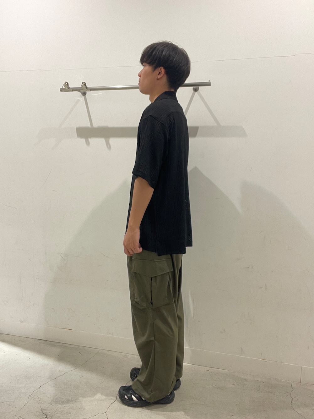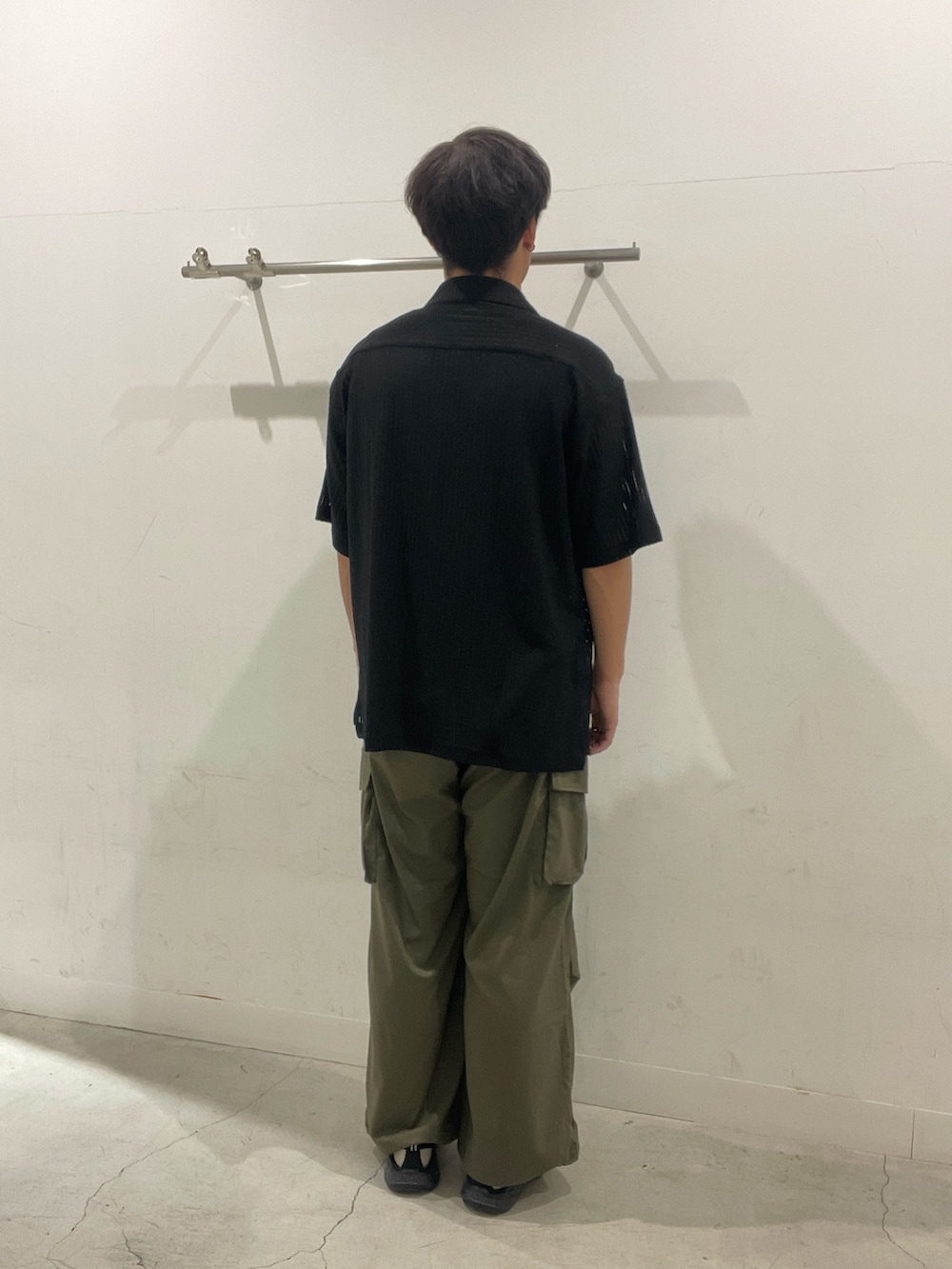ブラックのシアーシャツとカーキのカーゴパンツを合わせたシンプルコーデ。