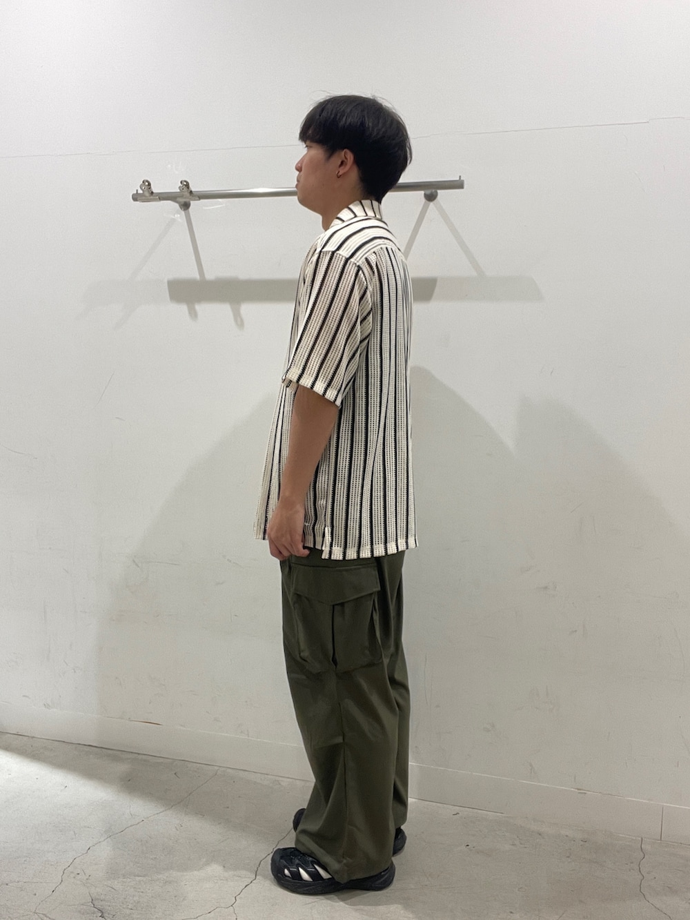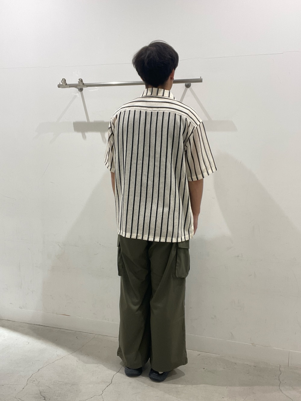 ストライプのシアーシャツにカーゴパンツを合わせたコーデ。