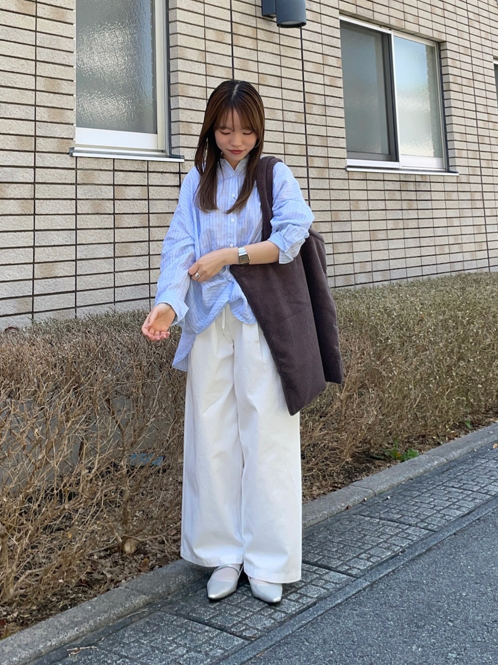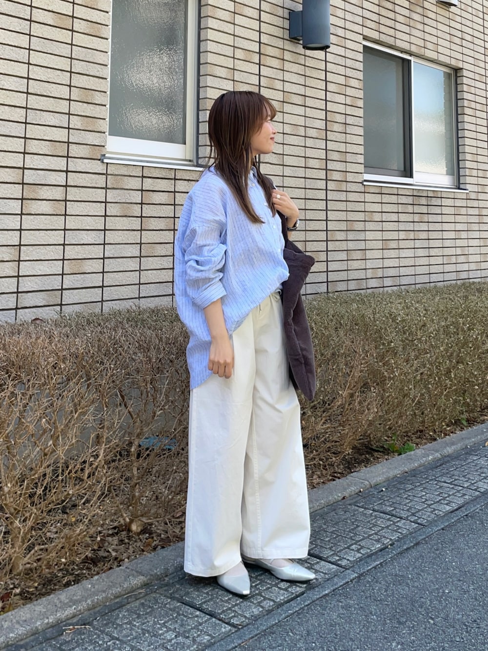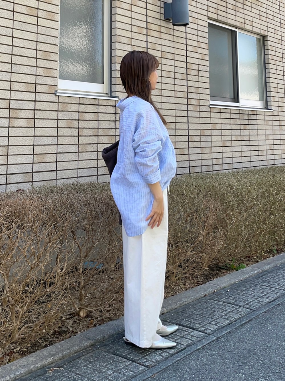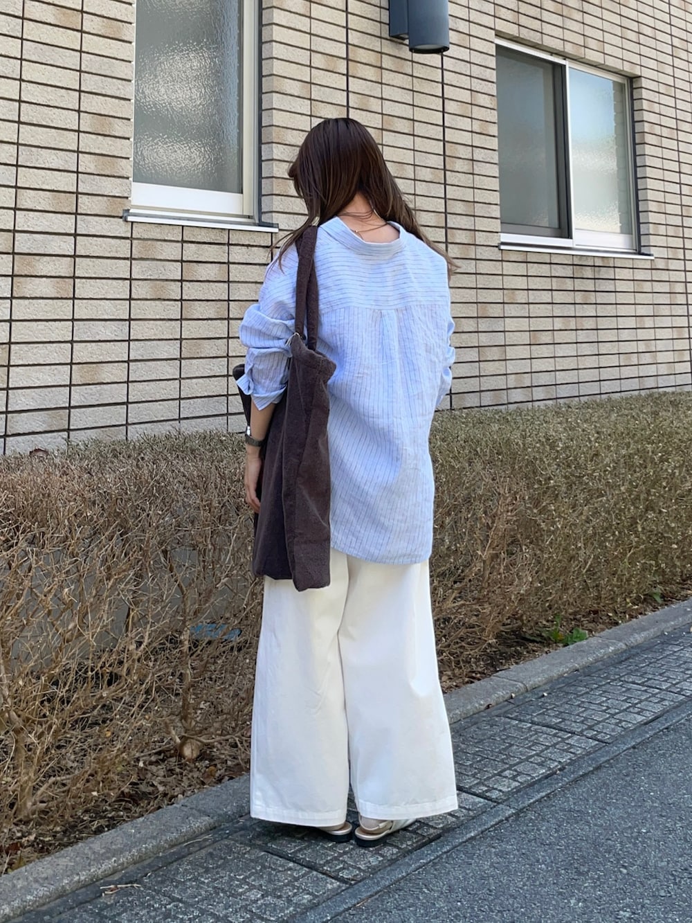 パンツは店頭でも大人気のチノイージーパンツです!ワイドストレートな形で広がりは抑えつつ、ウエストゴム紐でゆったり履いていただけます!私の身長でウエスト折って履いてますが、透け感なく使えるホワイトが一押しです✨