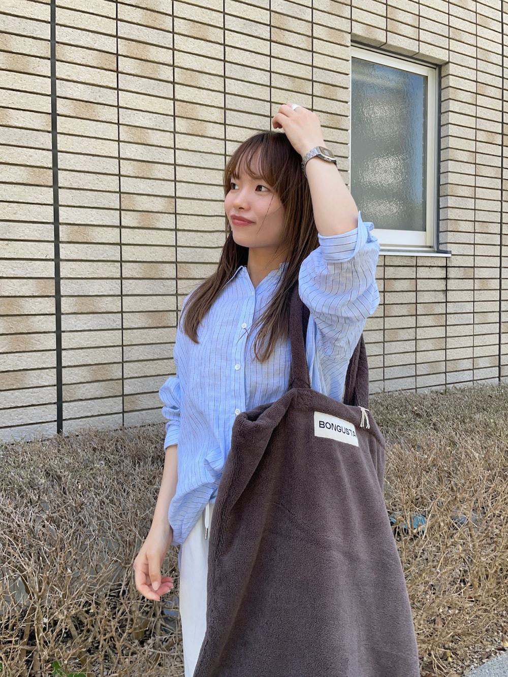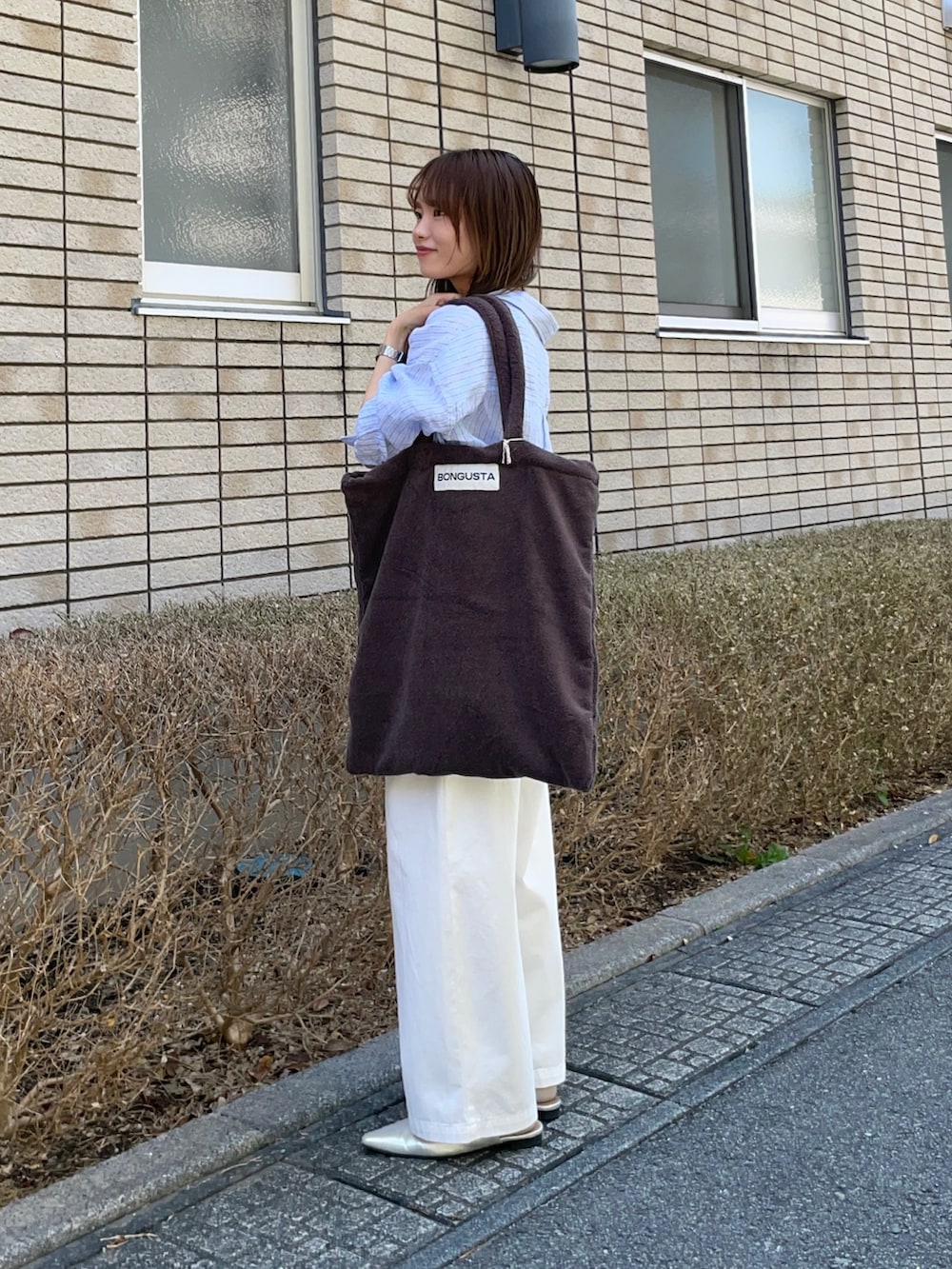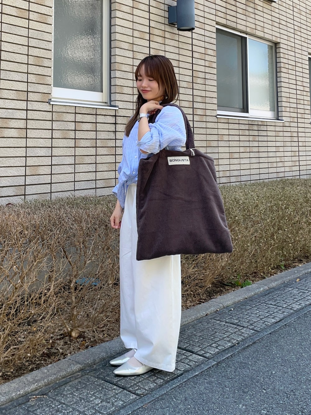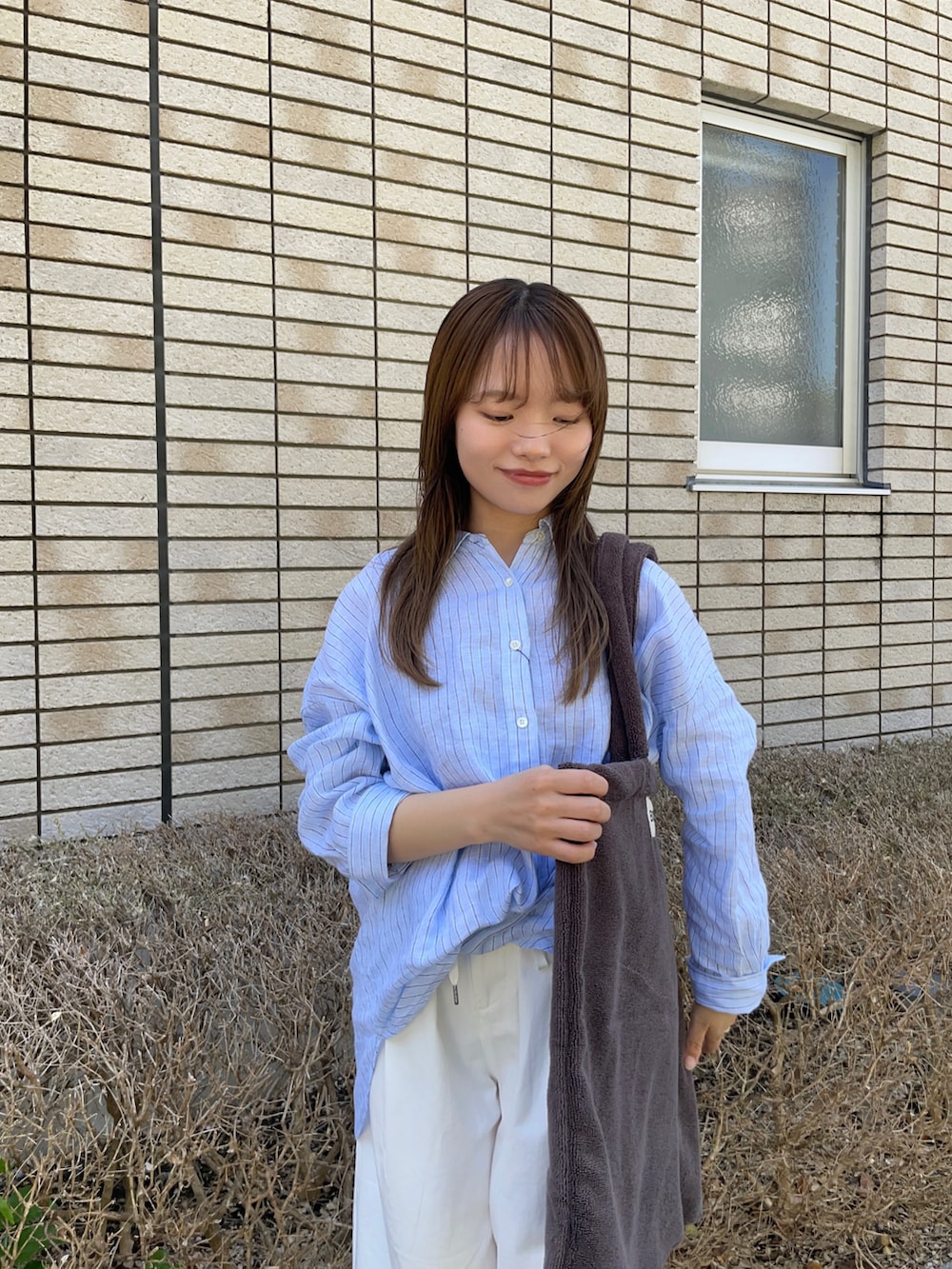 パンツは店頭でも大人気のチノイージーパンツです!ワイドストレートな形で広がりは抑えつつ、ウエストゴム紐でゆったり履いていただけます!私の身長でウエスト折って履いてますが、透け感なく使えるホワイトが一押しです✨