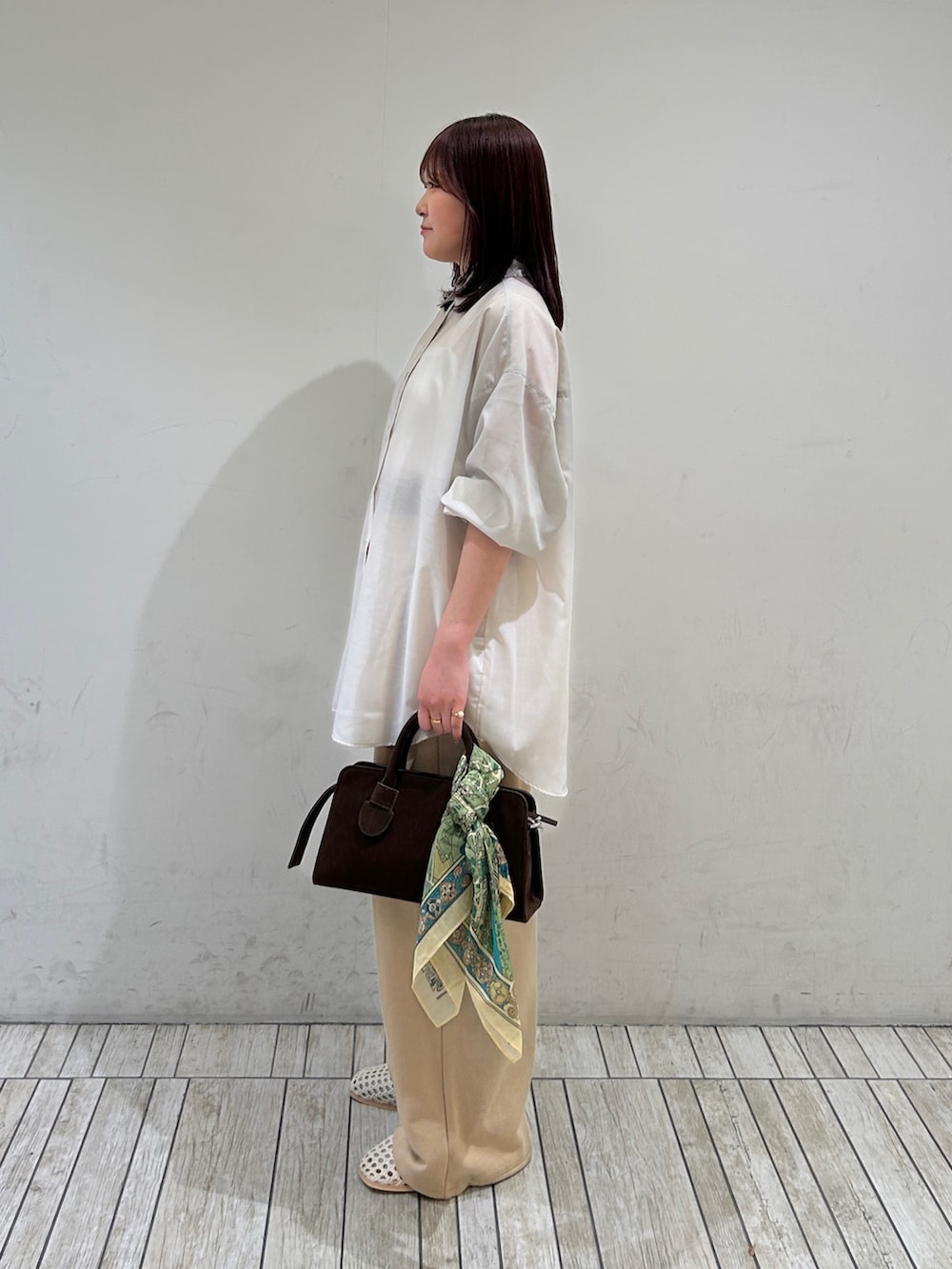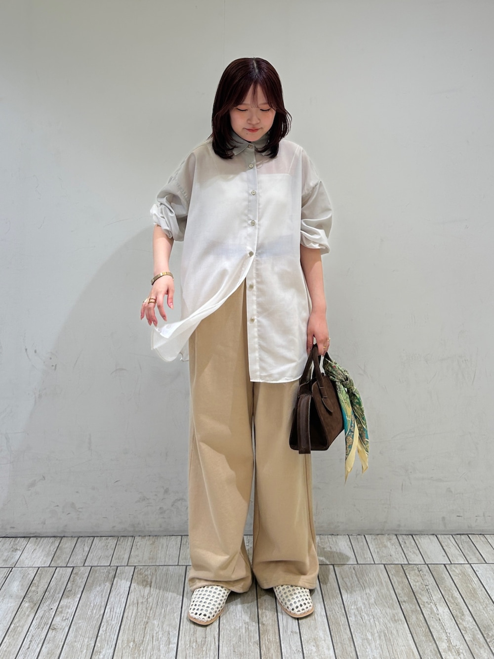 シャツはテロっとした素材で大人っぽいので、スウェットと合わせてラフにきてみました!