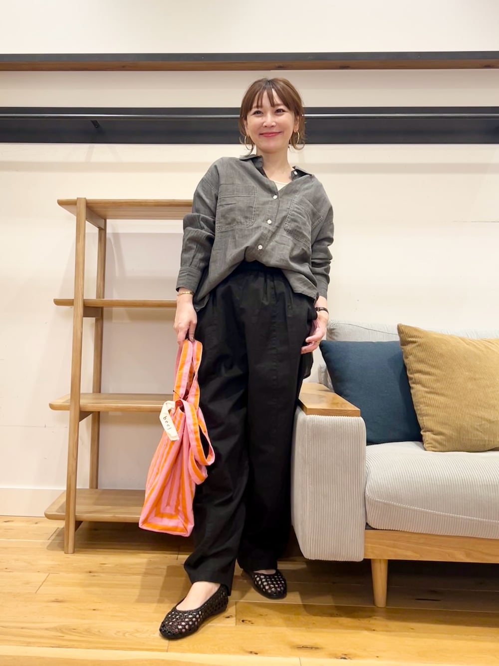 コットンリネン素材で軽さがあり、時期から夏前まで長く着られるのも魅力。気温が上がってきても重たく見えません。