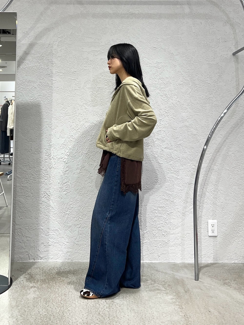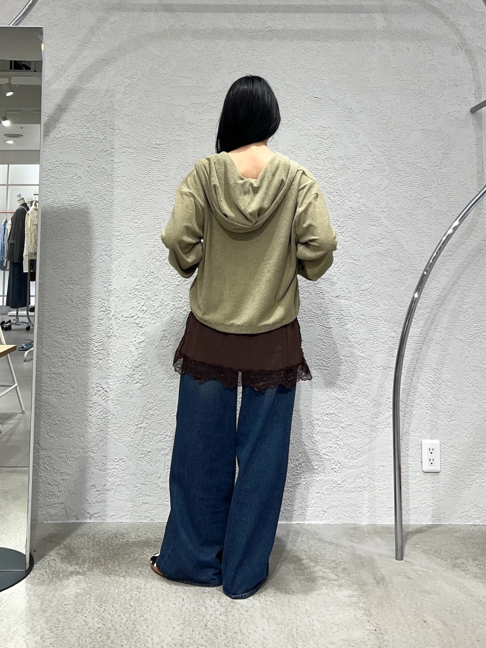 パイル生地のフーディーに、ヴィンテージライクレースキャミソール、デニムを合わせてカジュアルスタイルで着てみました。