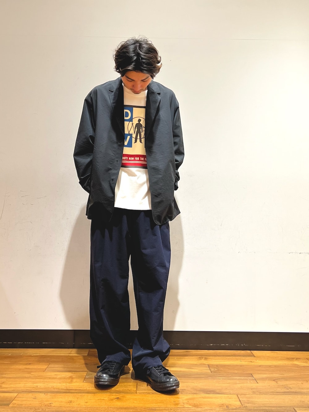 テーラードジャケットのインナーにプリントTシャツを使ったコーディネートは2回目ですが、前回とは違った素材のテーラードジャケットを使用しました!