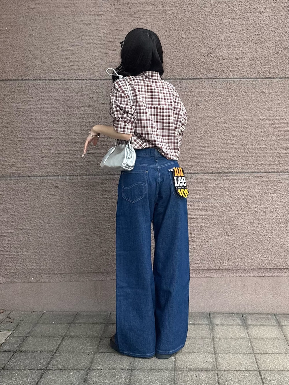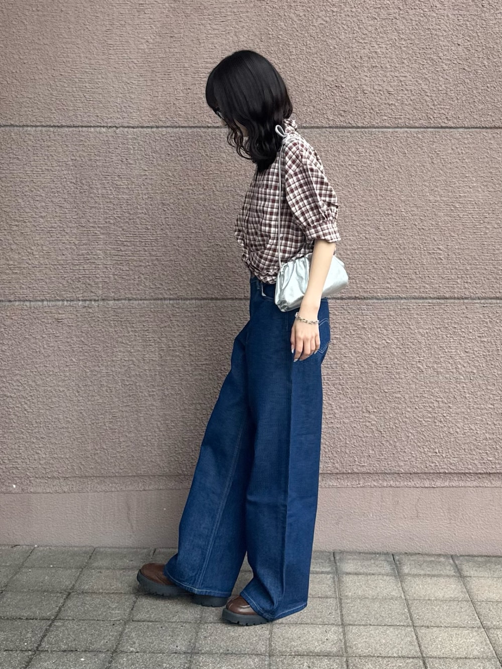 トップスはチェックシャツでデザインとシルエットが可愛いアイテムになっています!袖は少し長めになって着やすく、丈は短めになっているのでスタイルが良く見えます!